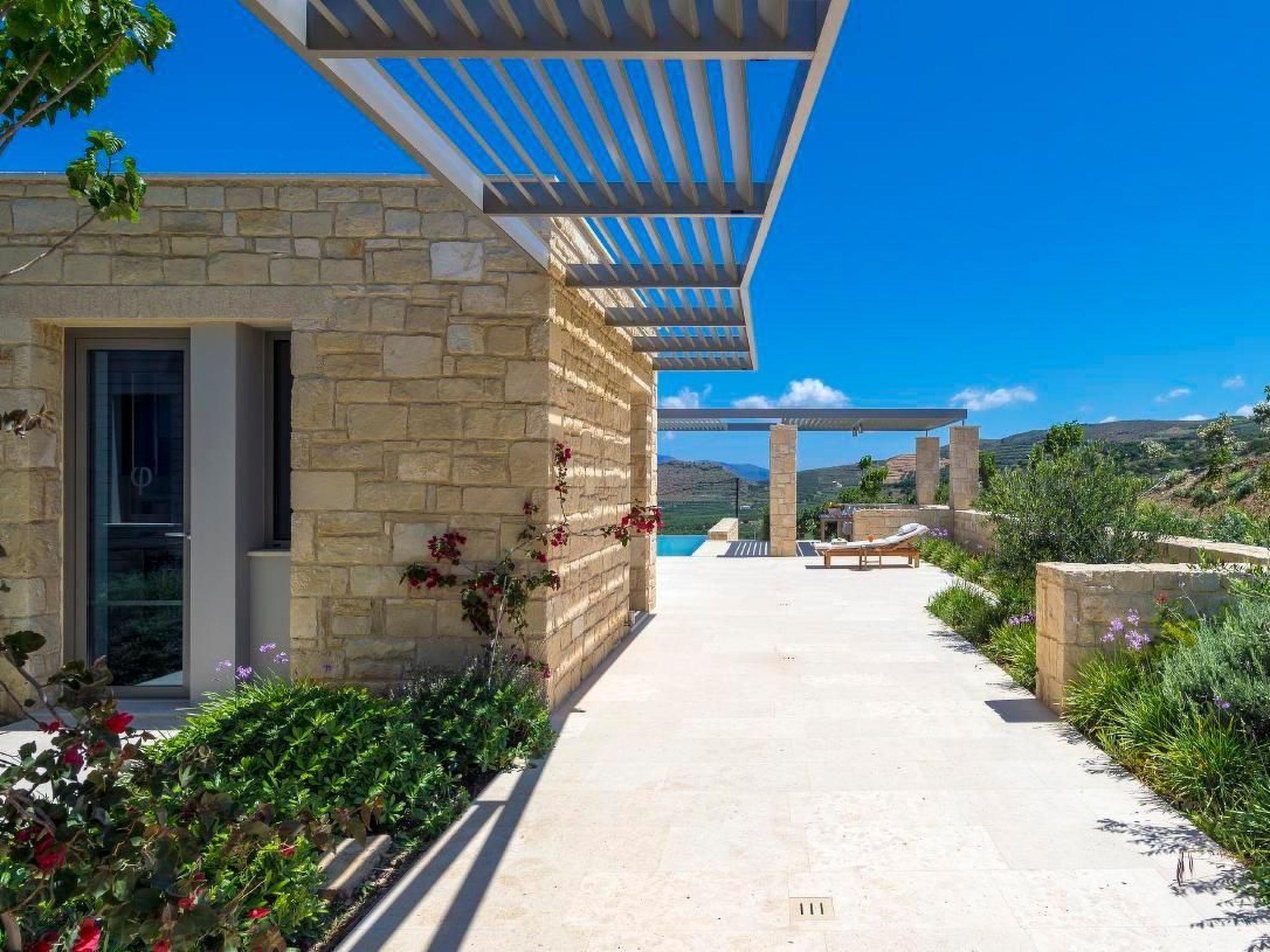 Die Villa zeichnet sich durch ein außergewöhnliches Outdoor-Erlebnis aus. Der private Infinity-Pool mit seiner römischen Treppe und dem atemberaubenden Blick über die Olivenhaine bis hin zur Ägäis bildet das Herzstück. Ein rollstuhlgerechter Weg führt durch den Garten zum Parkplatz und unterstreicht die Barrierefreiheit. Der Innenbereich geht nahtlos in die Außenterrasse über, die einen stilvollen Essbereich im Freien unter einer Pergola bietet, die ein harmonisches Gleichgewicht zwischen Schatten und mediterranem Sonnenlicht schafft.