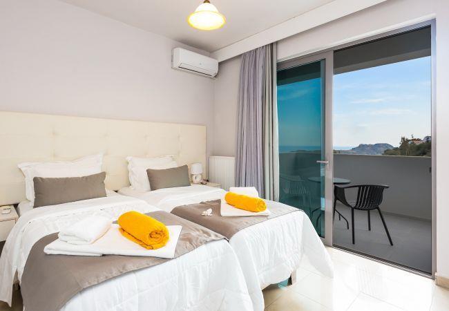 Im ersten Stock befinden sich zwei Schlafzimmer, eines mit einem Doppelbett und das andere mit zwei Einzelbetten, begleitet von einem modernen Badezimmer. Die Balkone auf dieser Ebene bieten unglaubliche Ausblicke auf das Meer und die umliegende Landschaft. Alle Bereiche sind klimatisiert, und schnelles WLAN ist in der gesamten Anlage verfügbar. Draußen gibt es einen gemeinsamen Swimmingpool und Gartenmöbel, auf denen Sie sich entspannen können.
