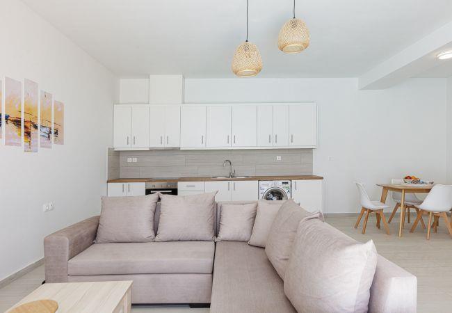 Im Erdgeschoss konzipiert, bietet die Villa eine helle, offene Raumaufteilung mit einem geräumigen Wohnbereich. Entspannen Sie sich auf dem großen Ecksofa oder genießen Sie eine Mahlzeit am Esstisch, während Sie den Blick auf den privaten Pool und das Meer dahinter schweifen lassen. Ein 55-Zoll-Fernseher mit Netflix-Abonnement sorgt nach einem Tag voller Erkundungen für gemütliche Unterhaltung.
