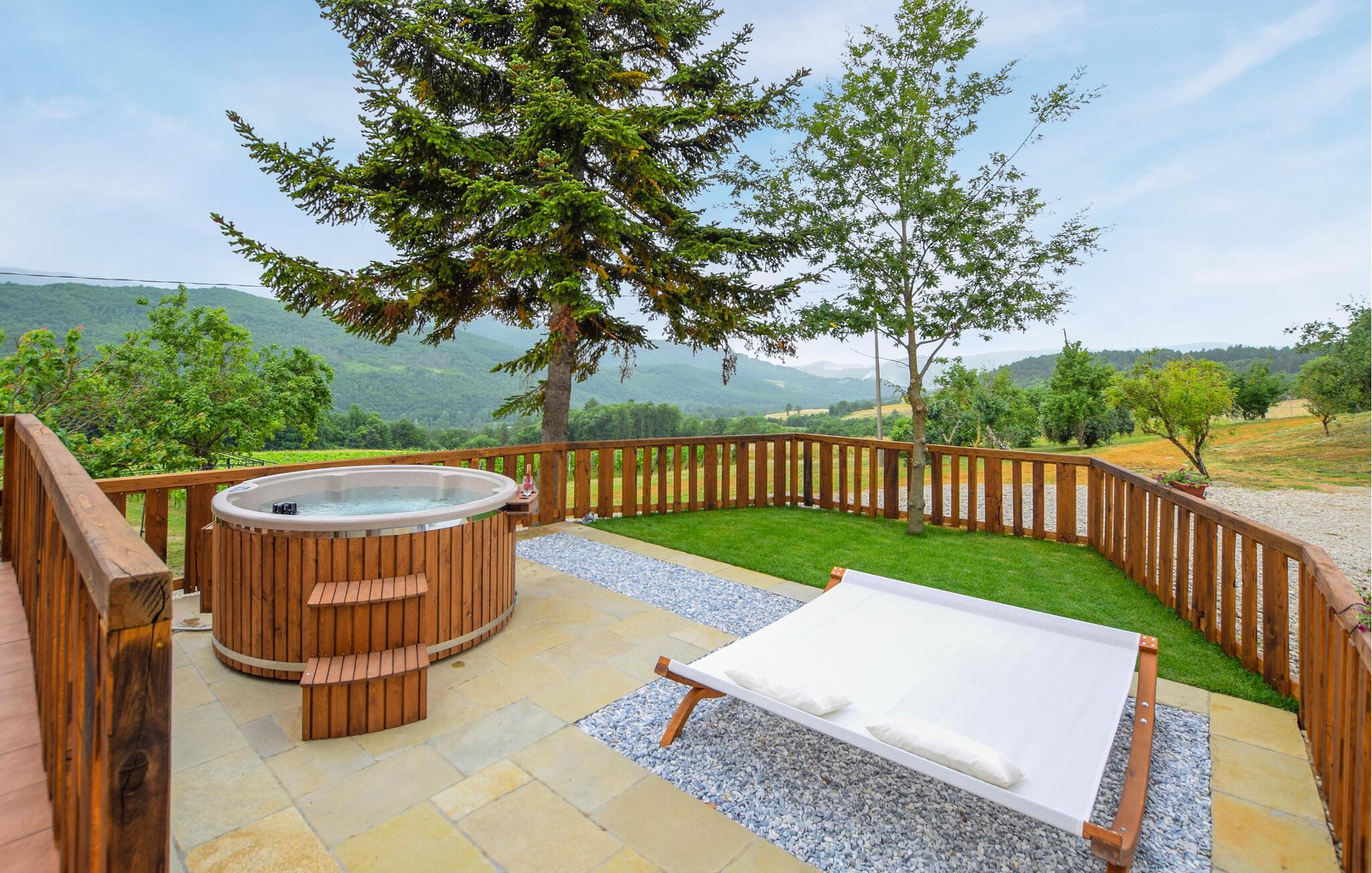 Genießen Sie Ihre Zeit im privaten, eingezäunten Garten mit Finnischem Holzbad und atemberaubendem Blick auf die umliegenden Weinberge und Berge. Die exklusive Terrasse lädt Sie zum Verweilen ein – ideal für ein Frühstück in der Morgensonne oder entspannte Abende, um den Tag in Ruhe ausklingen zu lassen.