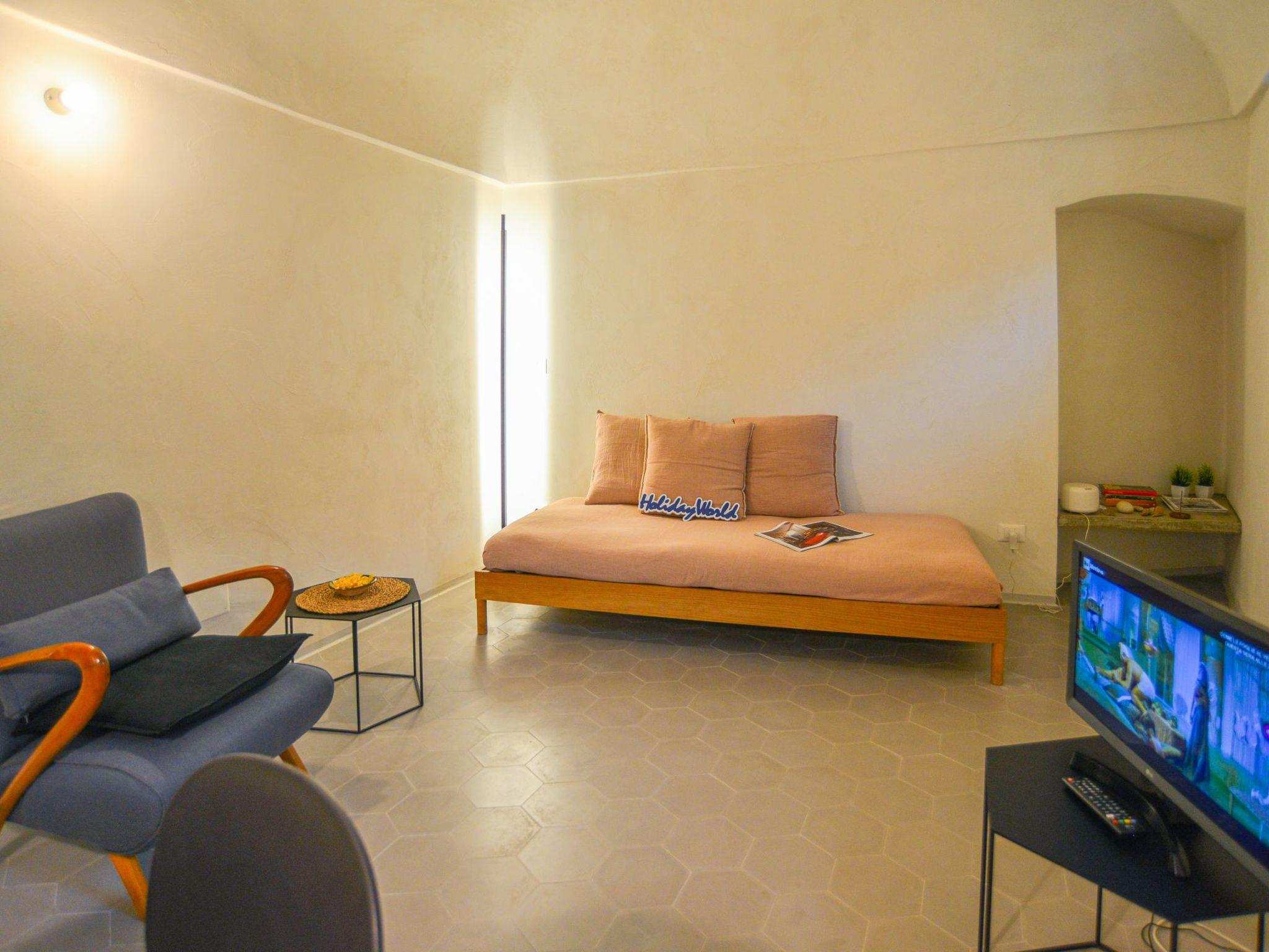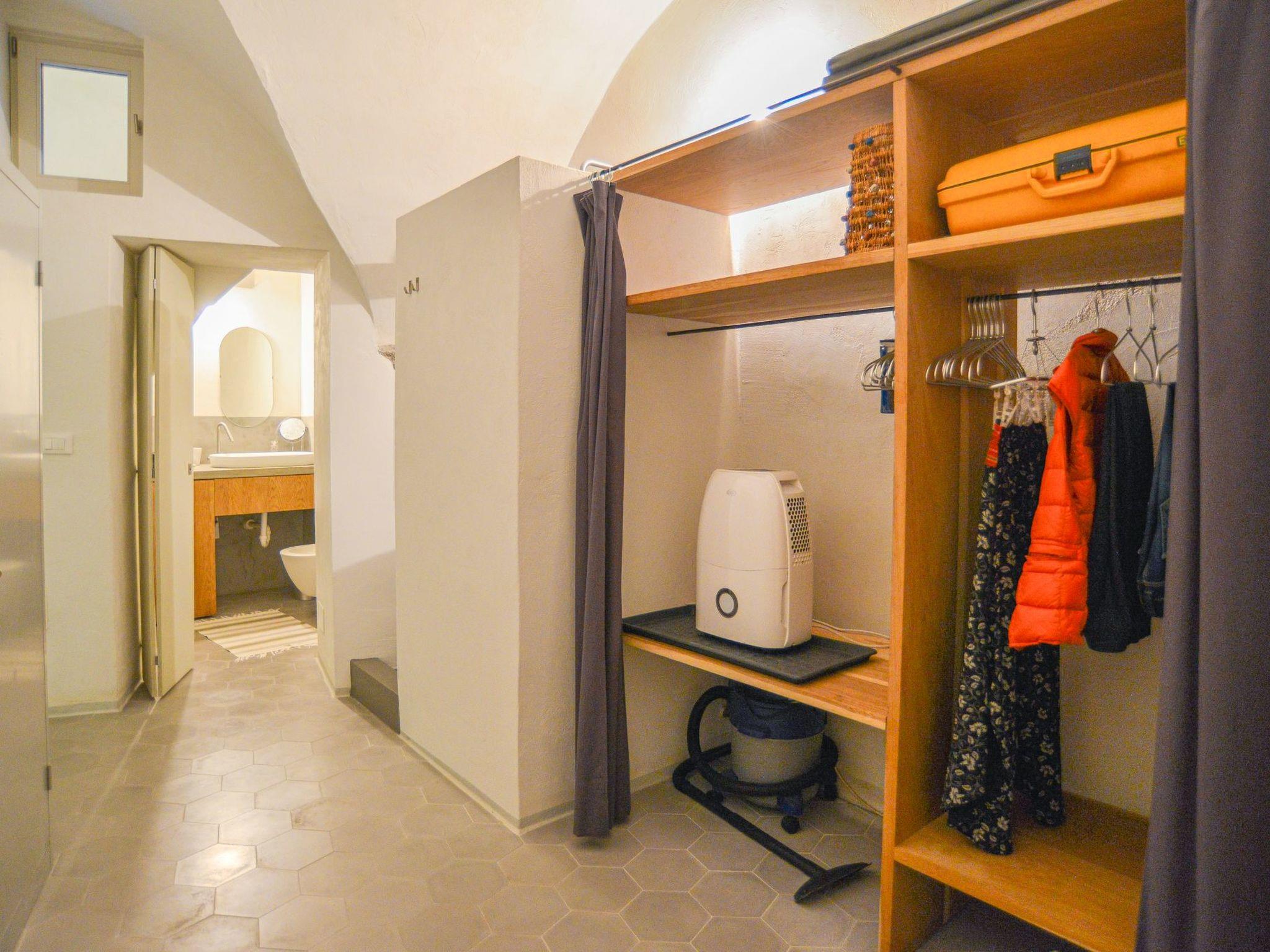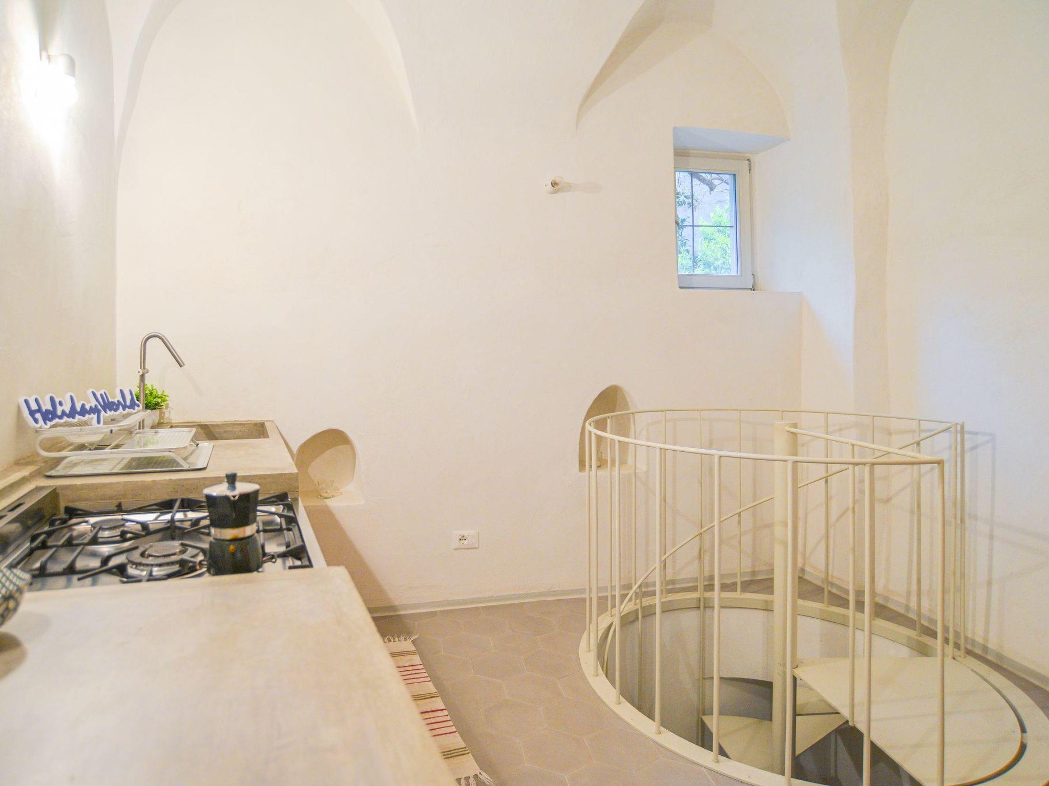 Eine Steintreppe führt in den Wohnbereich mit einer Küchenzeile aus Beton und Eichenmöbeln, wo jedes Detail an die Einfachheit erinnert. Eine malerische Wendeltreppe aus weißem Eisen verbindet die beiden Ebenen des Hauses, die beide durch gewölbte Decken gekennzeichnet sind, die eine authentische Atmosphäre vermitteln. Im Erdgeschoss befindet sich das Schlafzimmer mit zwei Einzelbetten, die je nach Bedarf zusammengefügt oder getrennt werden können. Besonders charakteristisch ist das gemauerte Badezimmer mit einer gemauerten Dusche, die an den rustikalen Stil des Dorfes erinnert. Angesichts der