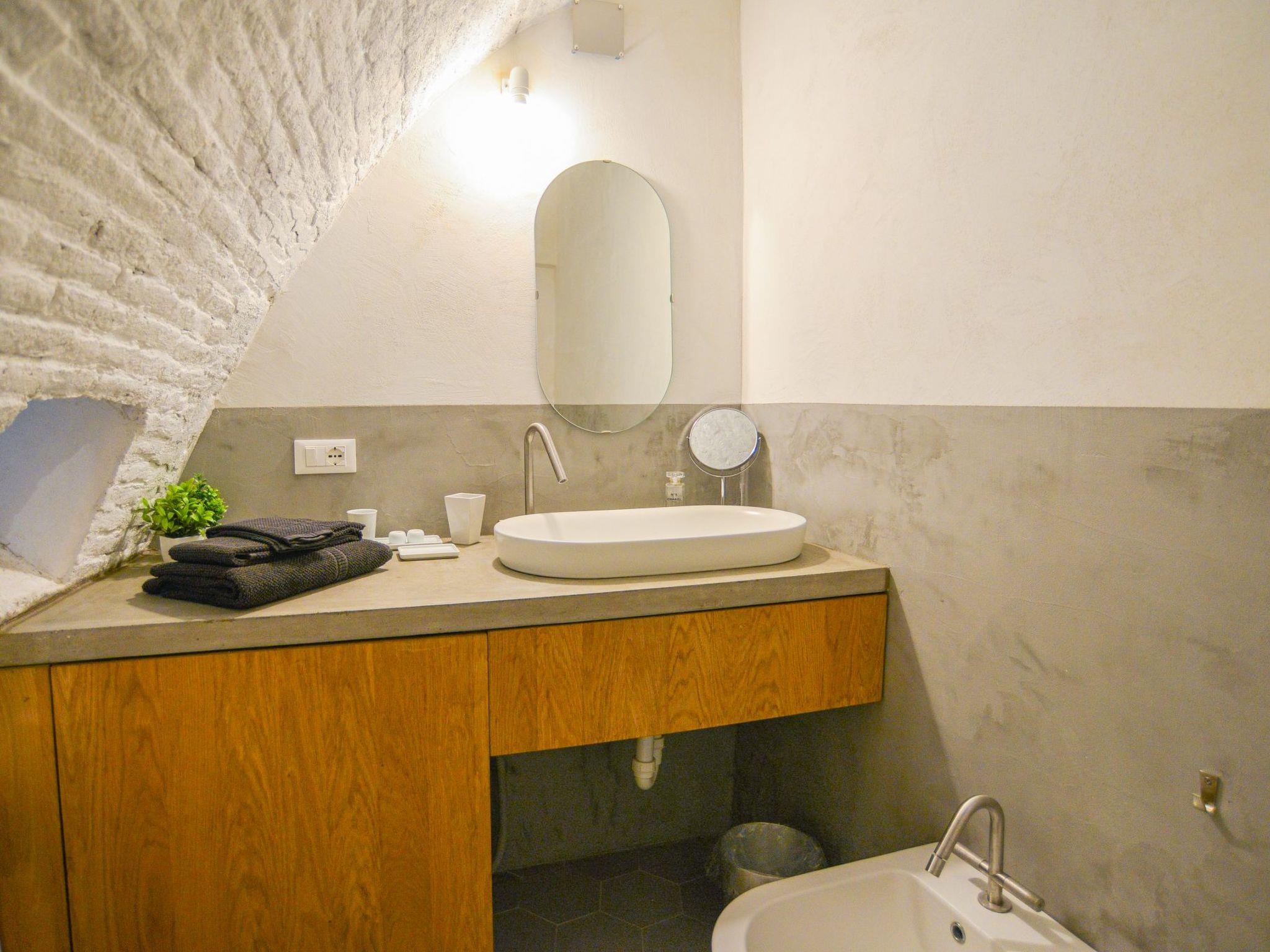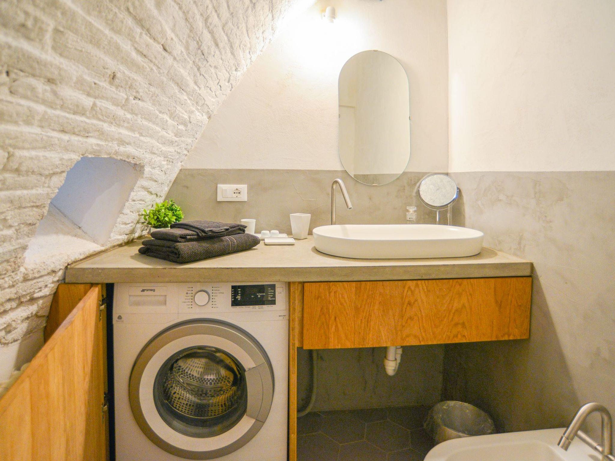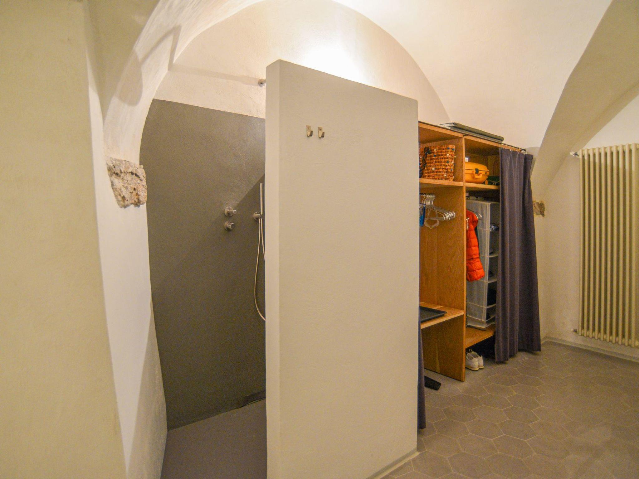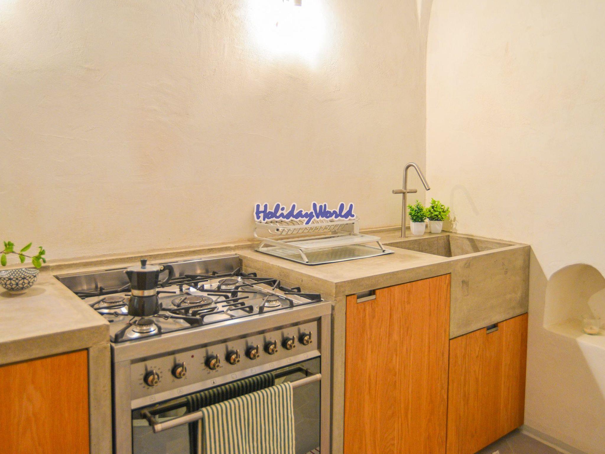 Eine Steintreppe führt in den Wohnbereich mit einer Küchenzeile aus Beton und Eichenmöbeln, wo jedes Detail an die Einfachheit erinnert. Eine malerische Wendeltreppe aus weißem Eisen verbindet die beiden Ebenen des Hauses, die beide durch gewölbte Decken gekennzeichnet sind, die eine authentische Atmosphäre vermitteln. Im Erdgeschoss befindet sich das Schlafzimmer mit zwei Einzelbetten, die je nach Bedarf zusammengefügt oder getrennt werden können. Besonders charakteristisch ist das gemauerte Badezimmer mit einer gemauerten Dusche, die an den rustikalen Stil des Dorfes erinnert. Angesichts der