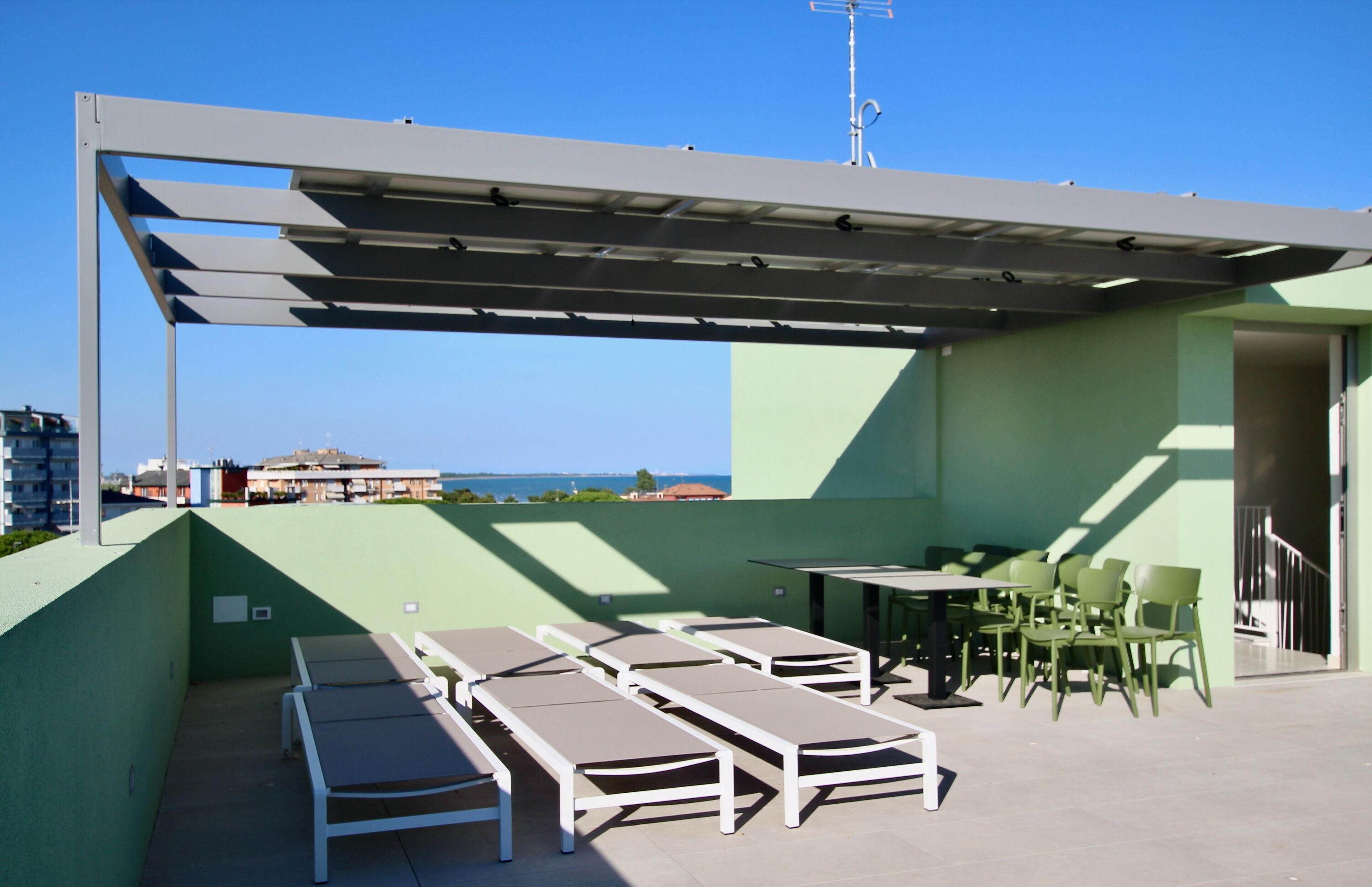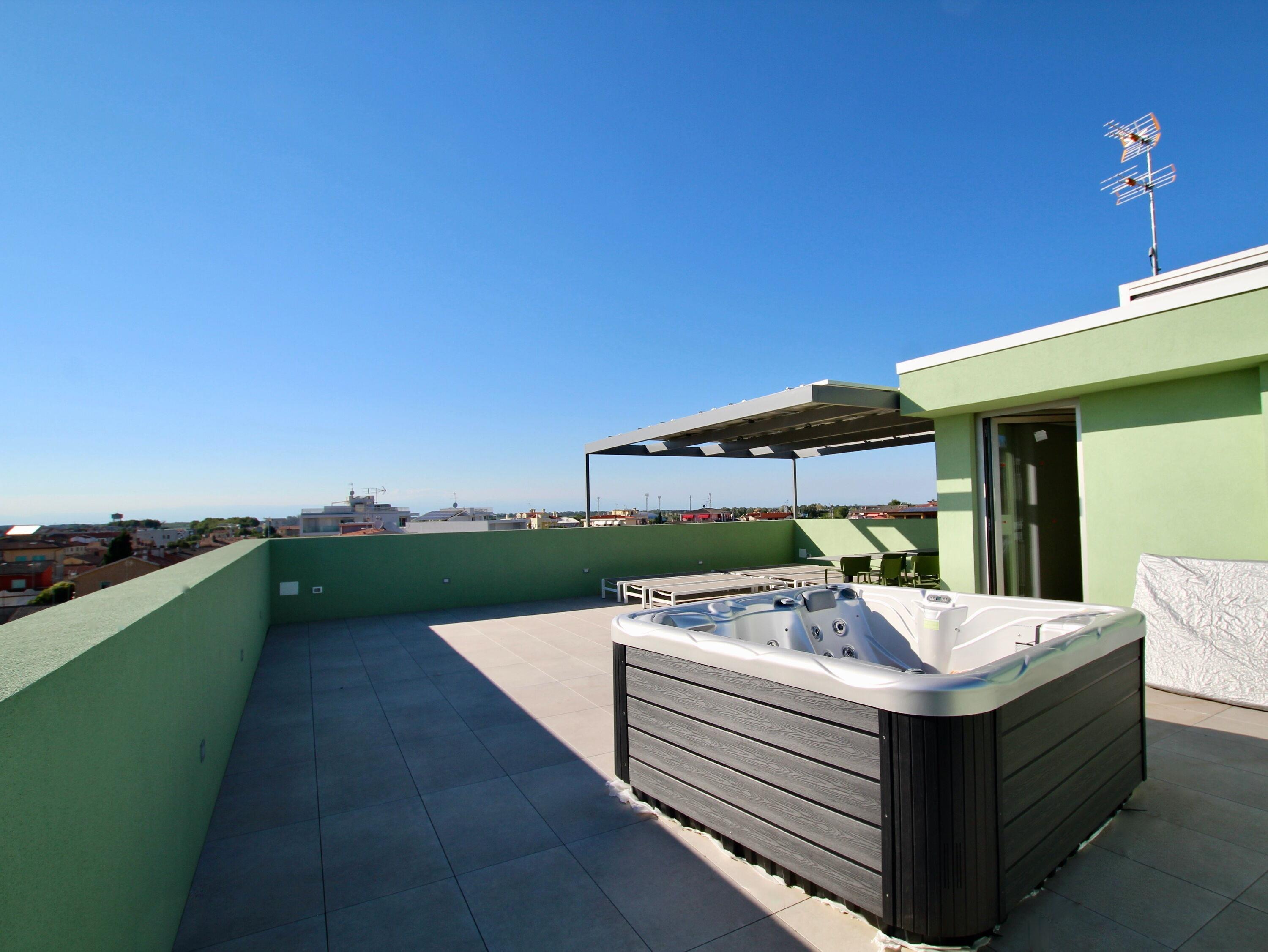Zur Ausstattung gehören eine Klimaanlage, ein Fernseher, eine Waschmaschine, ein Geschirrspüler sowie ein privater, unüberdachter Parkplatz. Zusätzlich verfügt die Wohnung über eine gemeinschaftliche Dachterrasse mit einem beeindruckenden Panoramablick. Dort befinden sich auch ein Whirlpool und ein Solarium, die von den Gästen genutzt werden können.