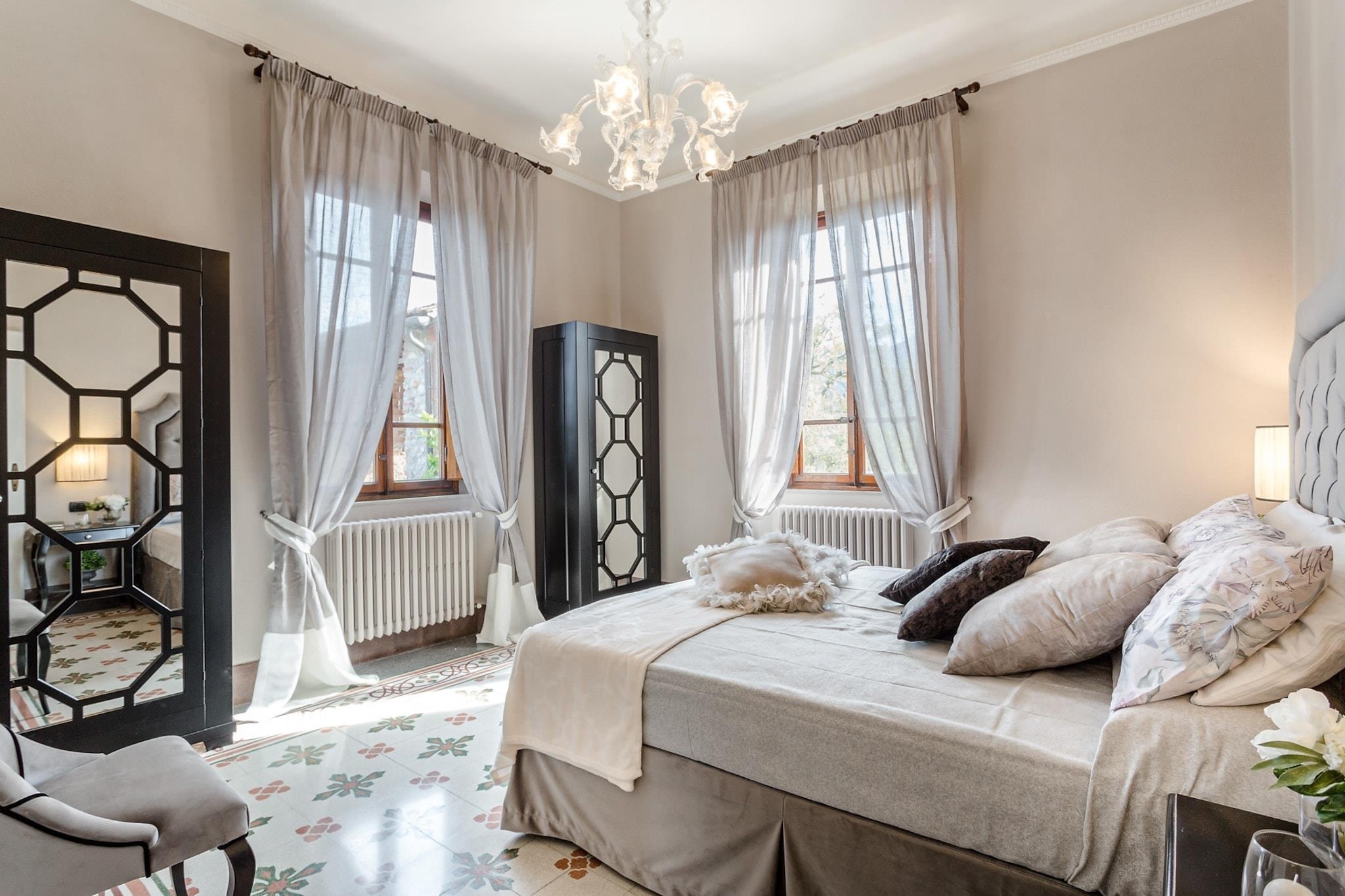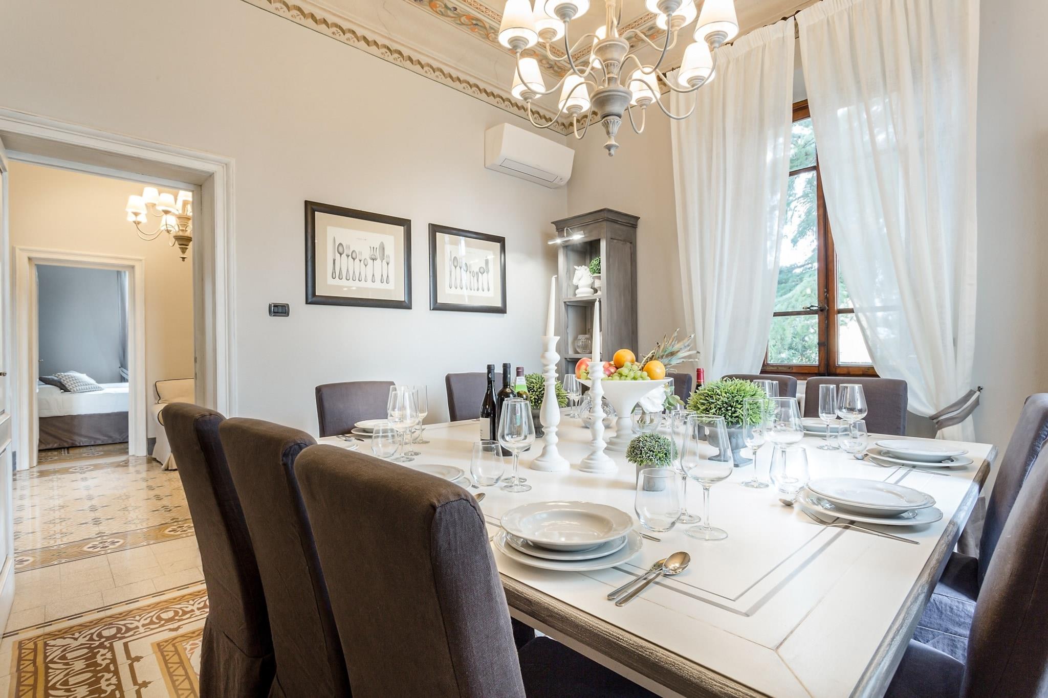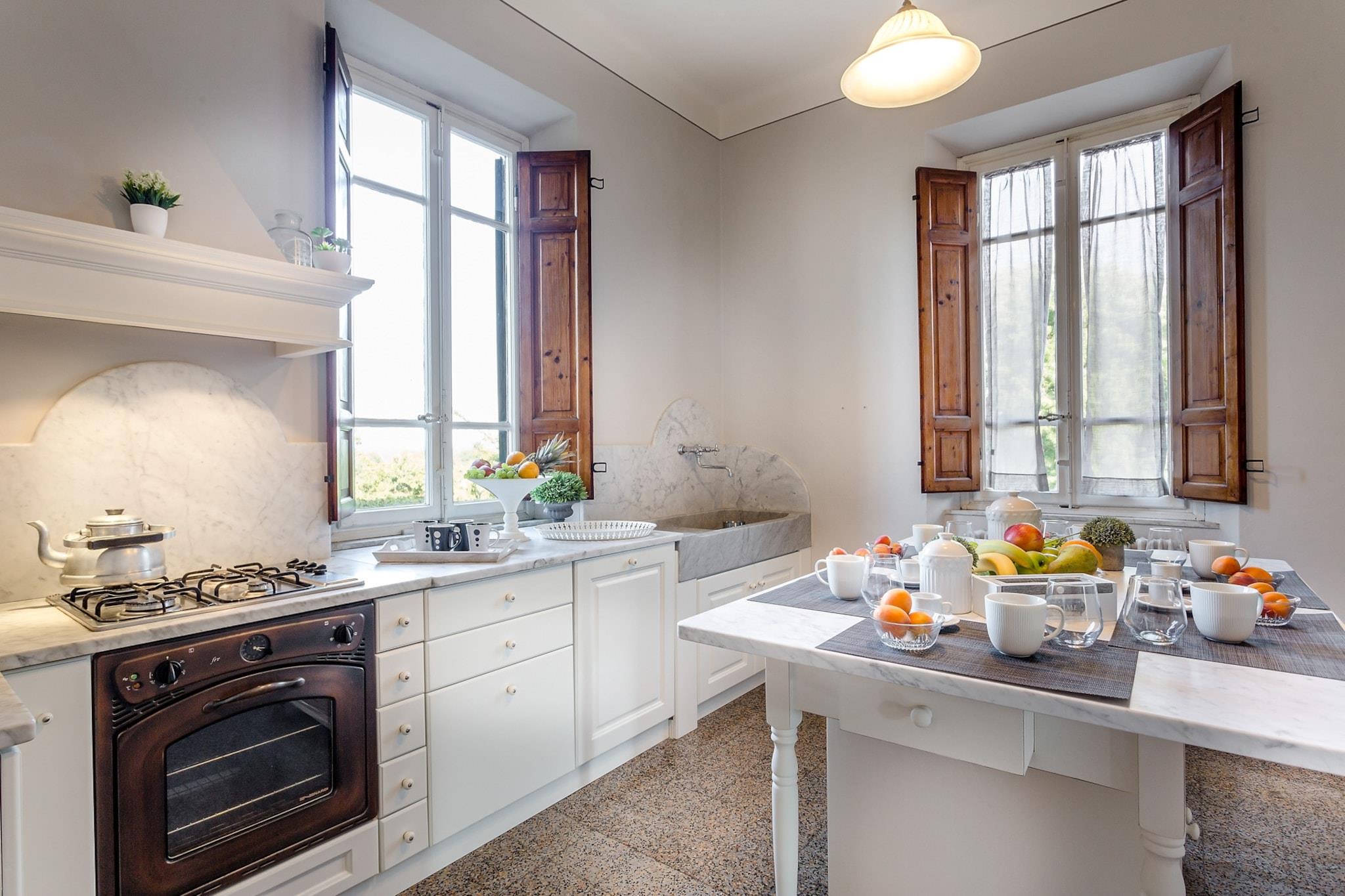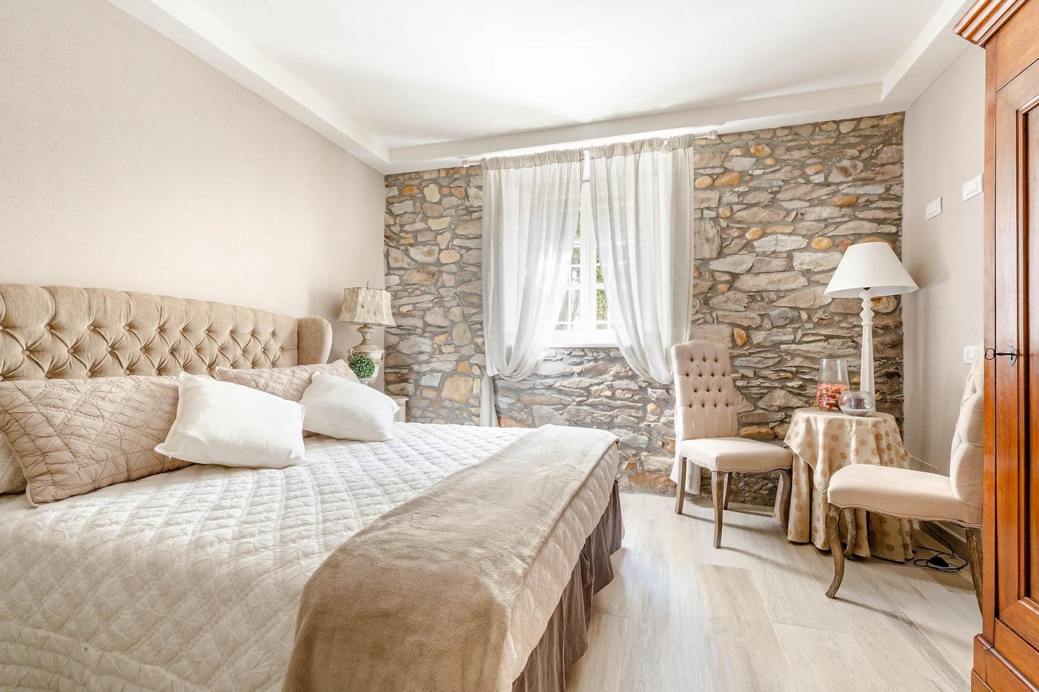 Topfpflanzen und Zypressen hüllen dieses umgebaute Herrenhaus aus dem 18. Jahrhundert in die malerische toskanische Landschaft. Üppige Gärten umgeben einen glitzernden Pool dieses restaurierten Bauernhauses nahe Lucca, einem Dorf, das für sein Kamelienfest und sein handwerklich hergestelltes natives Olivenöl extra bekannt ist. Das Haus bewahrt seinen ursprünglichen Charme mit Balkendecken, Ziegelböden und Torbögen, während eine Loggia mit Essbereich einen atemberaubenden Blick vom Hügel bietet. Gäste können regionale Produkte in einer hellen Küche genießen, im steinernen Poolhaus – einem ehemaligen Pferdestall – entspannen oder Freizeitaktivitäten wie Reiten, Tennis und Golf in unmittelbarer Nähe nachgehen. Im Inneren besticht das offene Raumkonzept durch graue Stoffe und Kristallleuchter, die große Fenster einrahmen und den Blick auf die sanften Hügel freigeben. Das geschäftige Stadtzentrum von Lucca verströmt den Charme eines Landsitzes und ist nur 12 Kilometer entfernt. Entspannen Sie am Salzwasserpool, lauschen Sie dem Vogelgezwitscher auf einer Sonnenliege oder ziehen Sie sich in den schattigen Wohnbereich im Freien zurück. Genießen Sie kostenloses frisches Obst und eine Flasche Wein am Esstisch im Freien für zehn Personen – ideal für gesellige Runden und mit einem Grillabend bei Sonnenuntergang. Steinmauern und ein Ziegeldach vermitteln den Charme einer historischen Villa, während das Interieur mit stilvollen Farben, Texturen und Kunstwerken glänzt. Das Erdgeschoss umfasst drei Doppelzimmer, drei Badezimmer mit integrierten Duschen und ein gemütliches Wohnzimmer mit Fernseher und französischen Fenstern mit Blick auf den Garten. Das Erdgeschoss verfügt über eine voll ausgestattete Küche, ein geräumiges Esszimmer für zwölf Gäste, ein weiteres Wohnzimmer mit Fernseher sowie zwei weitere Schlafzimmer – eines mit zwei Einzelbetten – und ein Badezimmer. Jedes Zimmer ist klimatisiert und bietet zuverlässiges WLAN, Sat-TV und einen privaten Parkplatz. Dank der Lage sind Restaurants und Geschäfte in der Nähe bequem zu erreichen. Hinweis: Kurtaxe ist vor Ort zu entrichten.