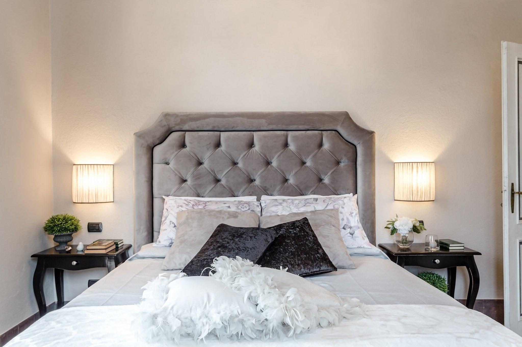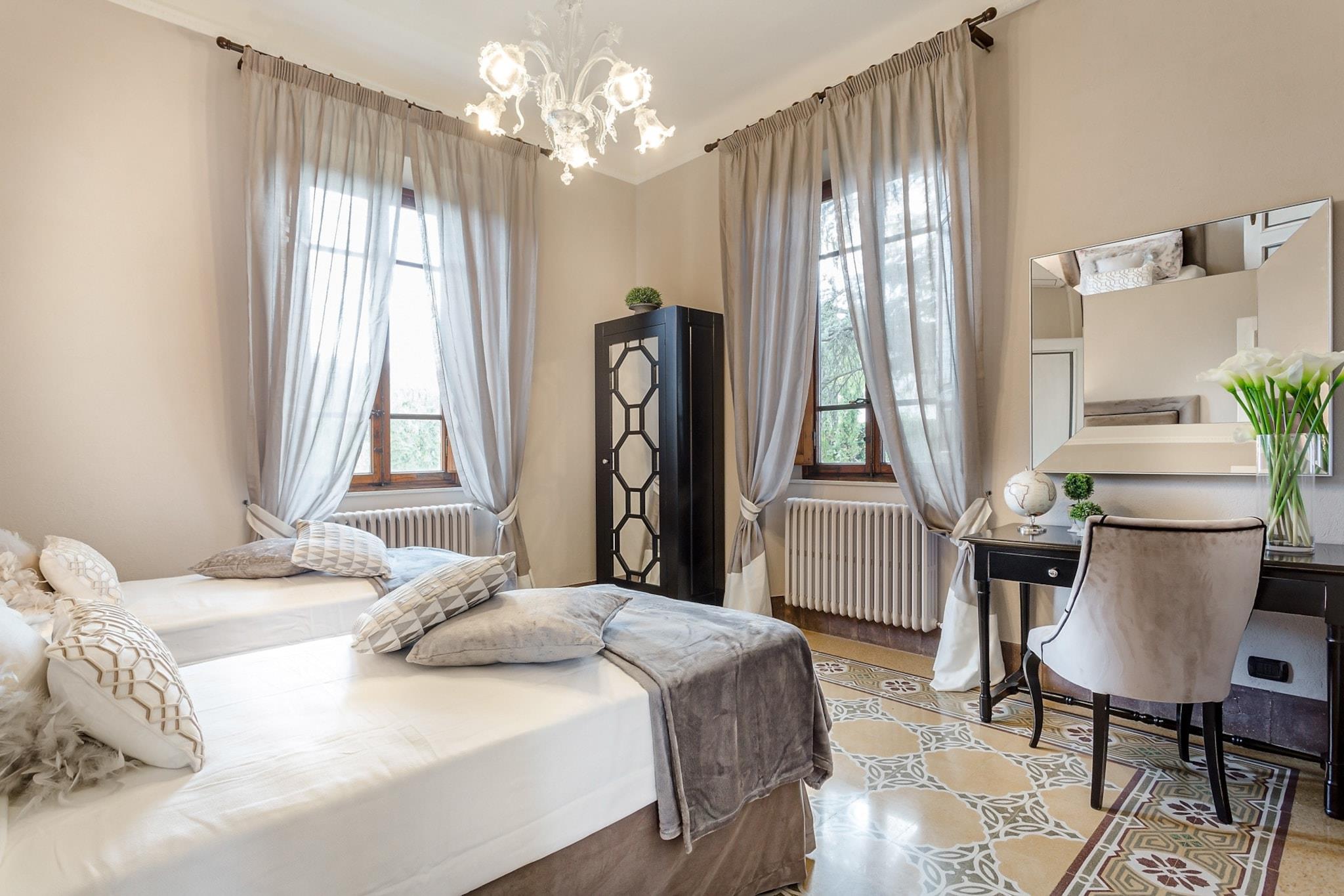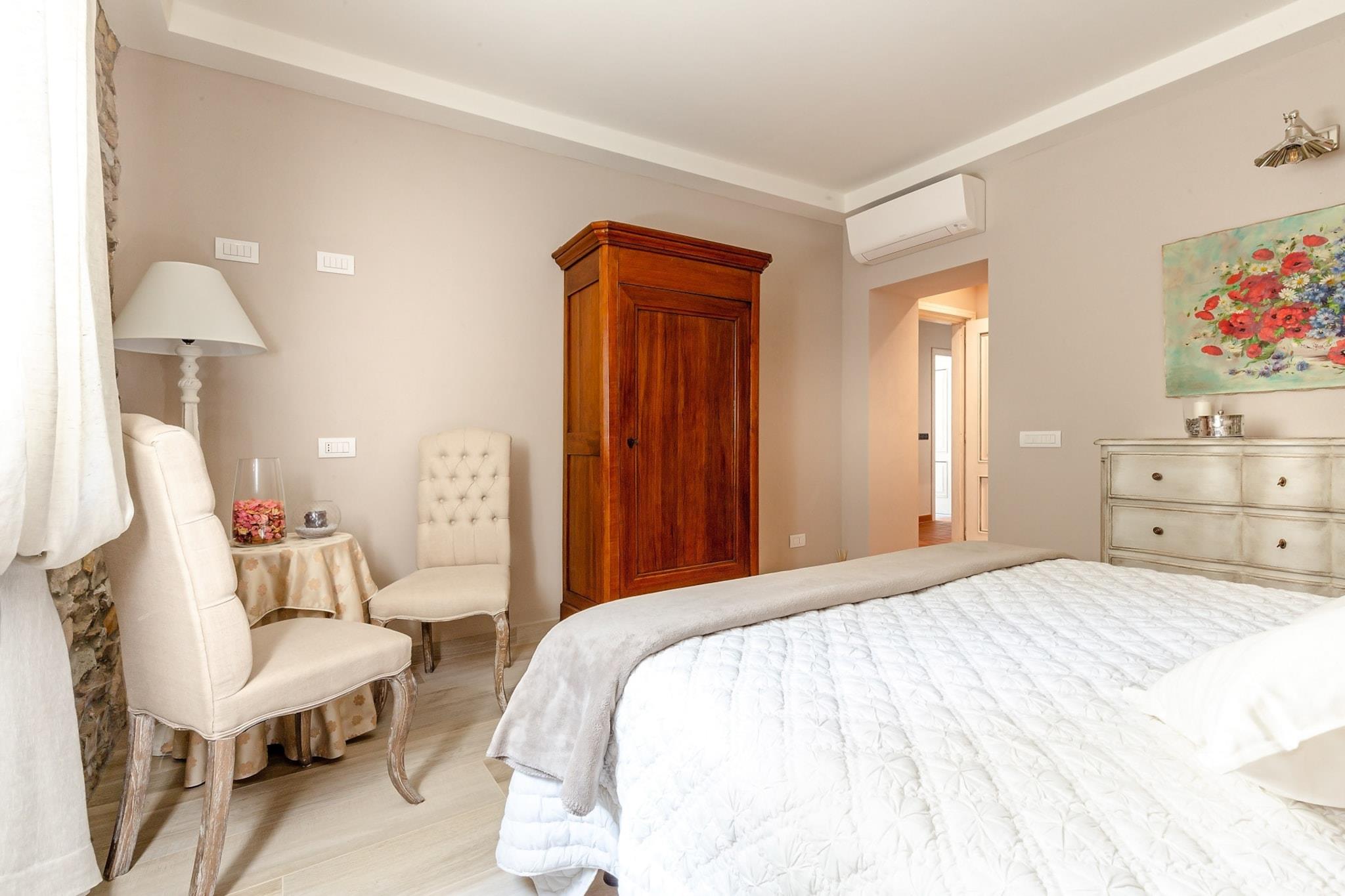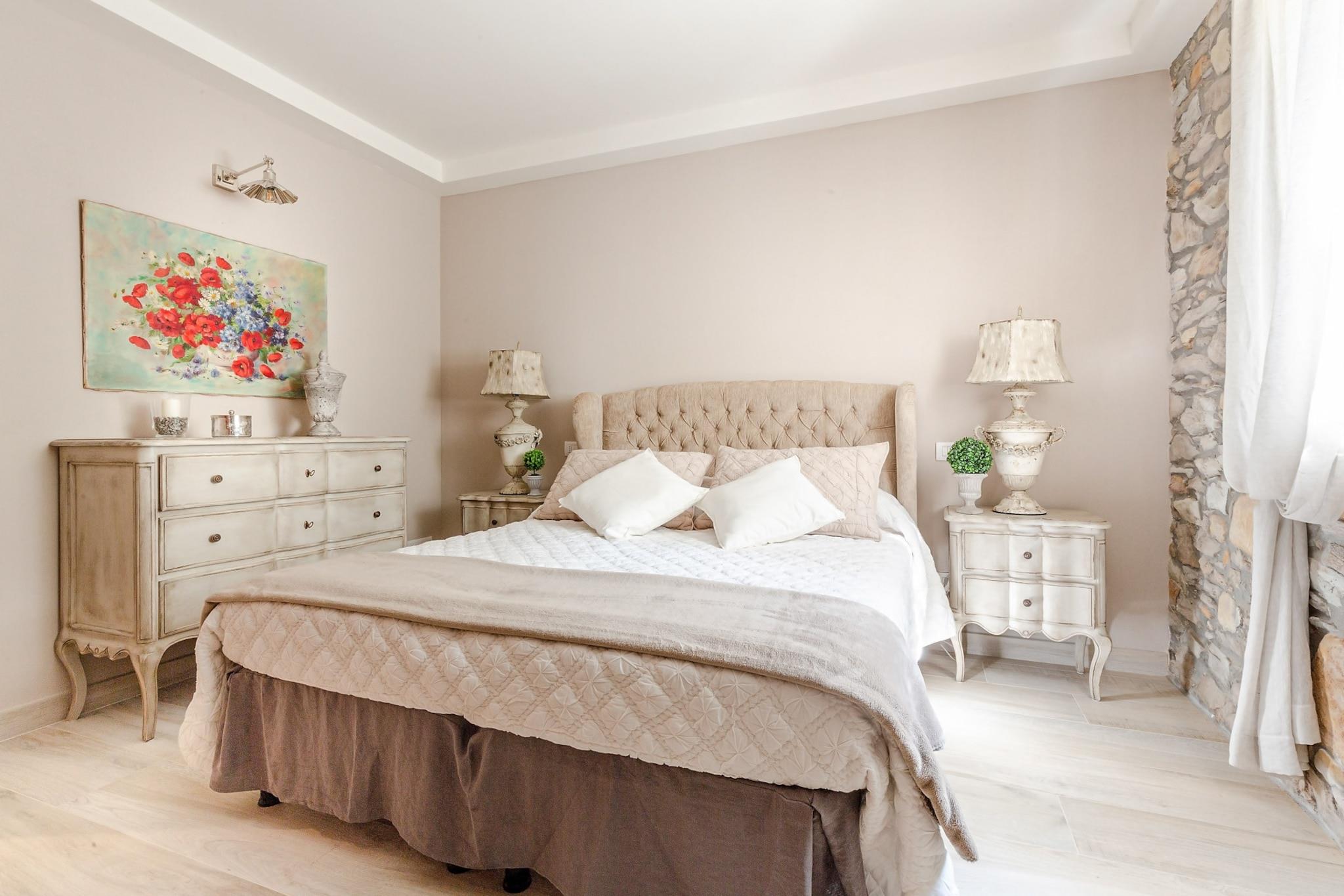 Topfpflanzen und Zypressen hüllen dieses umgebaute Herrenhaus aus dem 18. Jahrhundert in die malerische toskanische Landschaft. Üppige Gärten umgeben einen glitzernden Pool dieses restaurierten Bauernhauses nahe Lucca, einem Dorf, das für sein Kamelienfest und sein handwerklich hergestelltes natives Olivenöl extra bekannt ist. Das Haus bewahrt seinen ursprünglichen Charme mit Balkendecken, Ziegelböden und Torbögen, während eine Loggia mit Essbereich einen atemberaubenden Blick vom Hügel bietet. Gäste können regionale Produkte in einer hellen Küche genießen, im steinernen Poolhaus – einem ehemaligen Pferdestall – entspannen oder Freizeitaktivitäten wie Reiten, Tennis und Golf in unmittelbarer Nähe nachgehen. Im Inneren besticht das offene Raumkonzept durch graue Stoffe und Kristallleuchter, die große Fenster einrahmen und den Blick auf die sanften Hügel freigeben. Das geschäftige Stadtzentrum von Lucca verströmt den Charme eines Landsitzes und ist nur 12 Kilometer entfernt. Entspannen Sie am Salzwasserpool, lauschen Sie dem Vogelgezwitscher auf einer Sonnenliege oder ziehen Sie sich in den schattigen Wohnbereich im Freien zurück. Genießen Sie kostenloses frisches Obst und eine Flasche Wein am Esstisch im Freien für zehn Personen – ideal für gesellige Runden und mit einem Grillabend bei Sonnenuntergang. Steinmauern und ein Ziegeldach vermitteln den Charme einer historischen Villa, während das Interieur mit stilvollen Farben, Texturen und Kunstwerken glänzt. Das Erdgeschoss umfasst drei Doppelzimmer, drei Badezimmer mit integrierten Duschen und ein gemütliches Wohnzimmer mit Fernseher und französischen Fenstern mit Blick auf den Garten. Das Erdgeschoss verfügt über eine voll ausgestattete Küche, ein geräumiges Esszimmer für zwölf Gäste, ein weiteres Wohnzimmer mit Fernseher sowie zwei weitere Schlafzimmer – eines mit zwei Einzelbetten – und ein Badezimmer. Jedes Zimmer ist klimatisiert und bietet zuverlässiges WLAN, Sat-TV und einen privaten Parkplatz. Dank der Lage sind Restaurants und Geschäfte in der Nähe bequem zu erreichen. Hinweis: Kurtaxe ist vor Ort zu entrichten.
