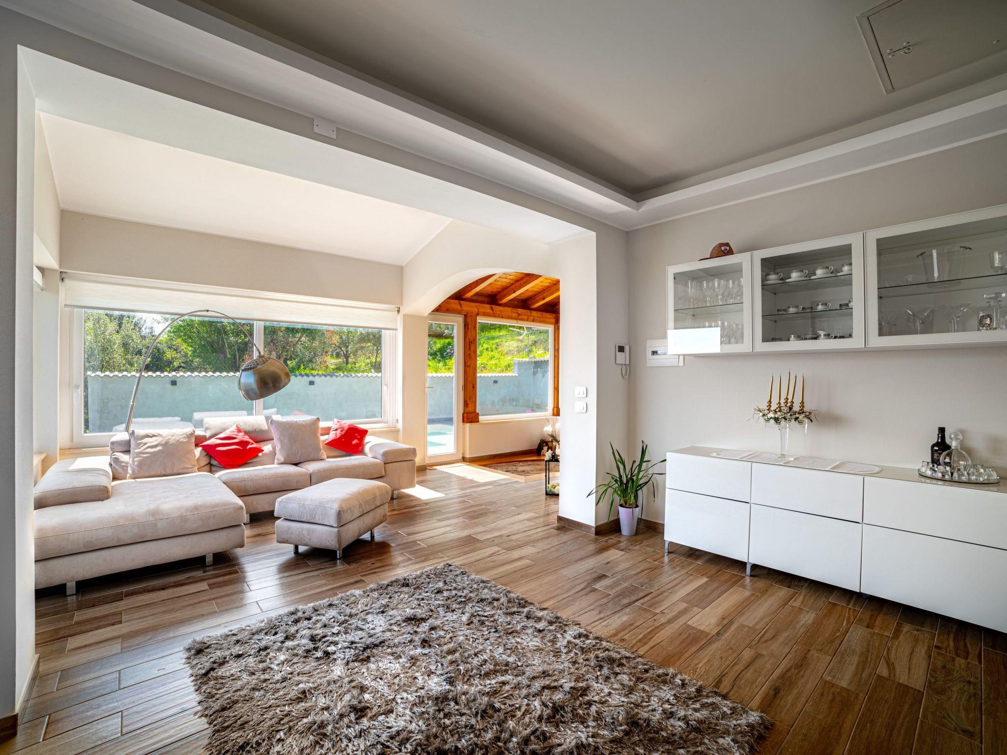 Die nach allen vier Seiten offene Villa erstreckt sich über zwei Ebenen und ist von einem schönen, üppigen Garten mit Rasen, Zier- und Obstbäumen umgeben; der Poolbereich ist einfach atemberaubend, mit der Möglichkeit zu baden und dabei das fantastische Panorama des Meeres zu bewundern, so weit das Auge reicht; das gleiche Panorama kann von praktisch jedem Punkt des Hauses bewundert werden, einschließlich der Terrasse unter einer kühlen Veranda, die mit Esstisch und Grill ausgestattet ist.