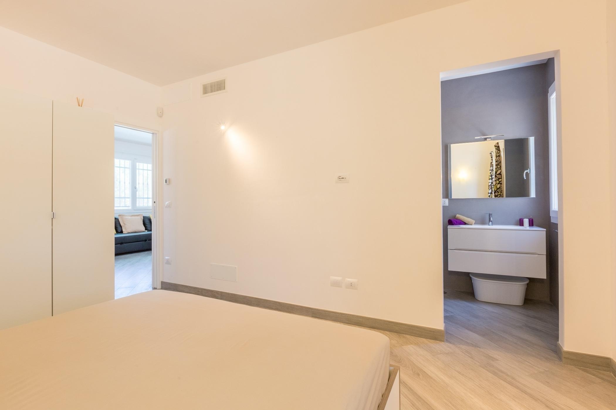 Ein Schlafzimmer bietet ein eigenes Bad.