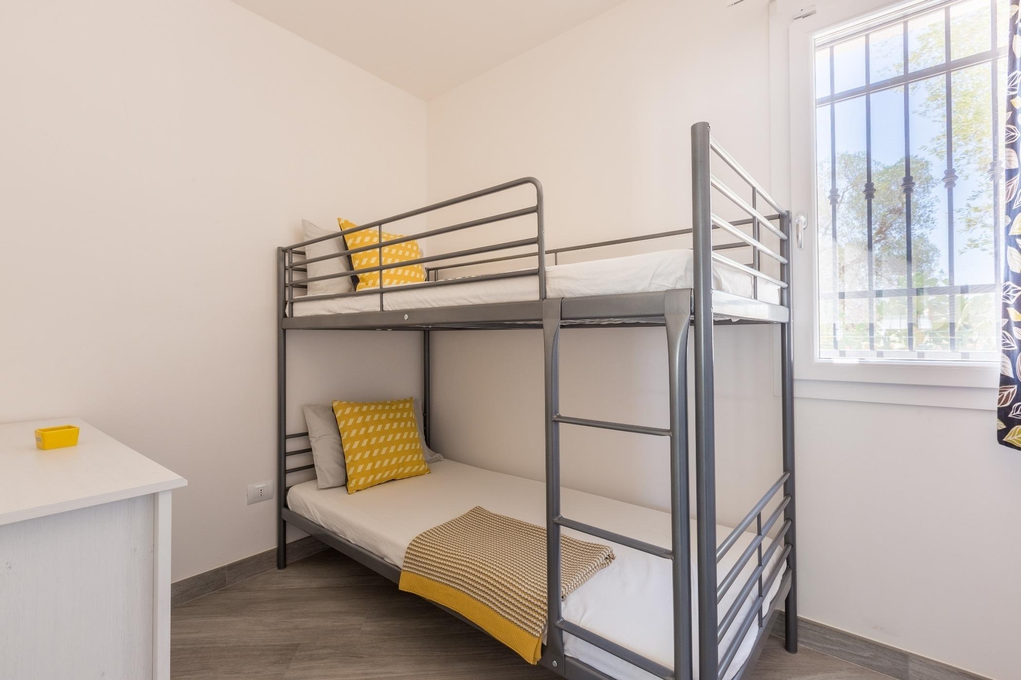 Drei Schlafzimmer, von denen zwei Doppelzimmer und eines mit einem Etagenbett sind.