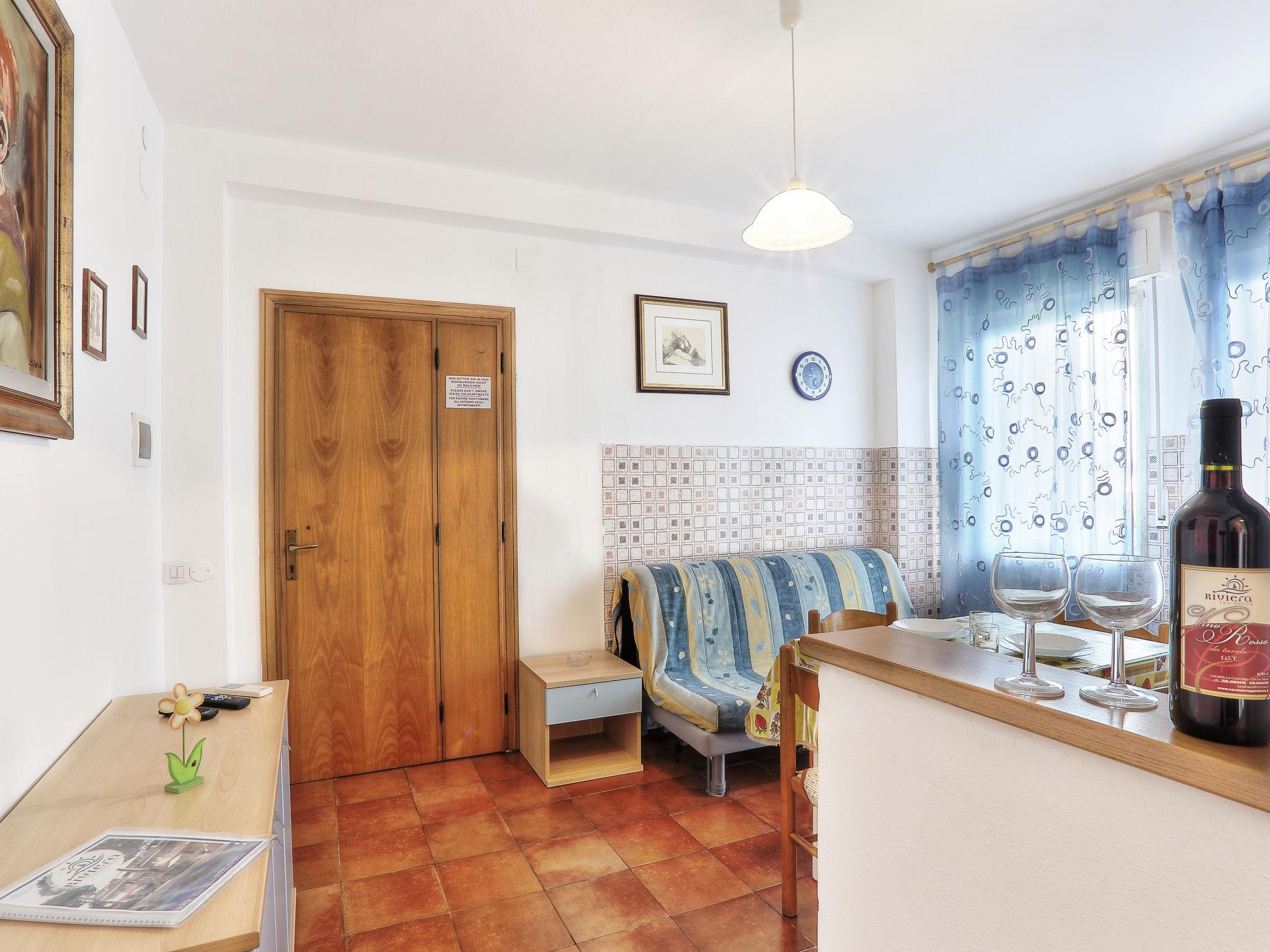 "Riviera 8", 2-Zimmer-Wohnung 33 m2 im 1. Stock. Zweckmässig eingerichtet: Wohn-/Schlafzimmer mit 1 Doppeldiwanbett, Esstisch, Sat-TV, E-Heizung und Klimaanlage. Ausgang zum Balkon. 1 Zimmer mit 1 franz. Bett (160 cm, Länge 190 cm). Ausgang zum Balkon. Offene Küche (4 Flammen). Dusche/WC. G-Heizung (extra), Klimaanlage. Balkon. Balkonmöbel. Zur Verfügung: Babybett. Internet (WLAN, gratis). Bitte beachten: Maximal 2 Haustiere/Hunde erlaubt. Feuerlöscher. IT049007B4QVS43RZC