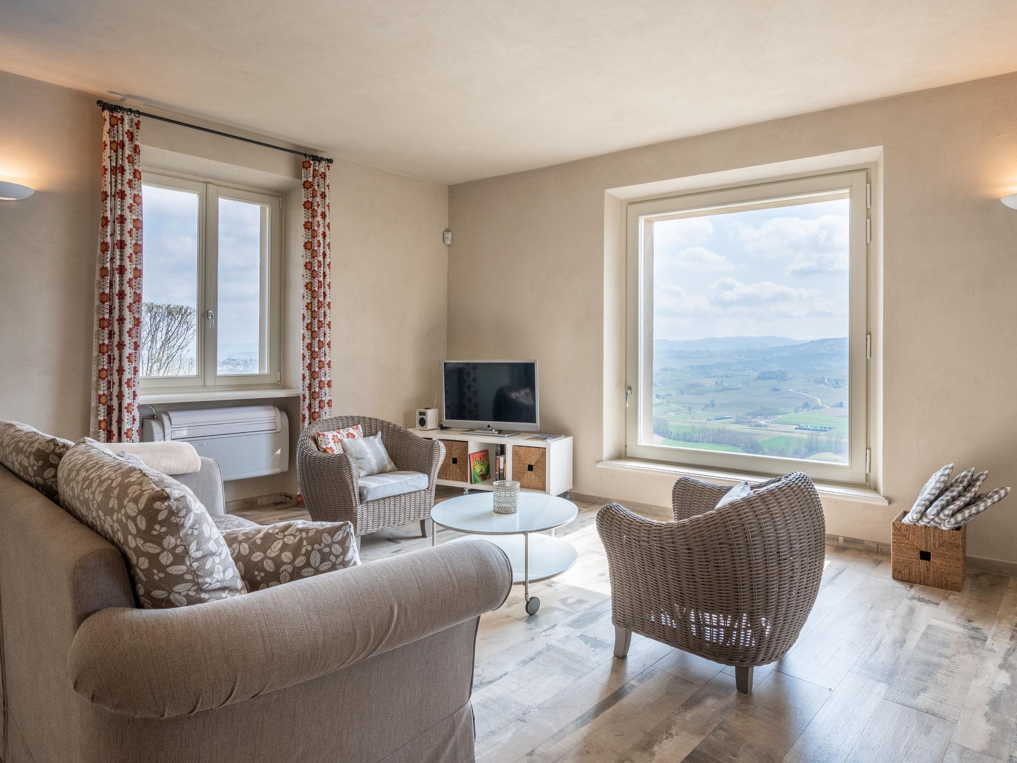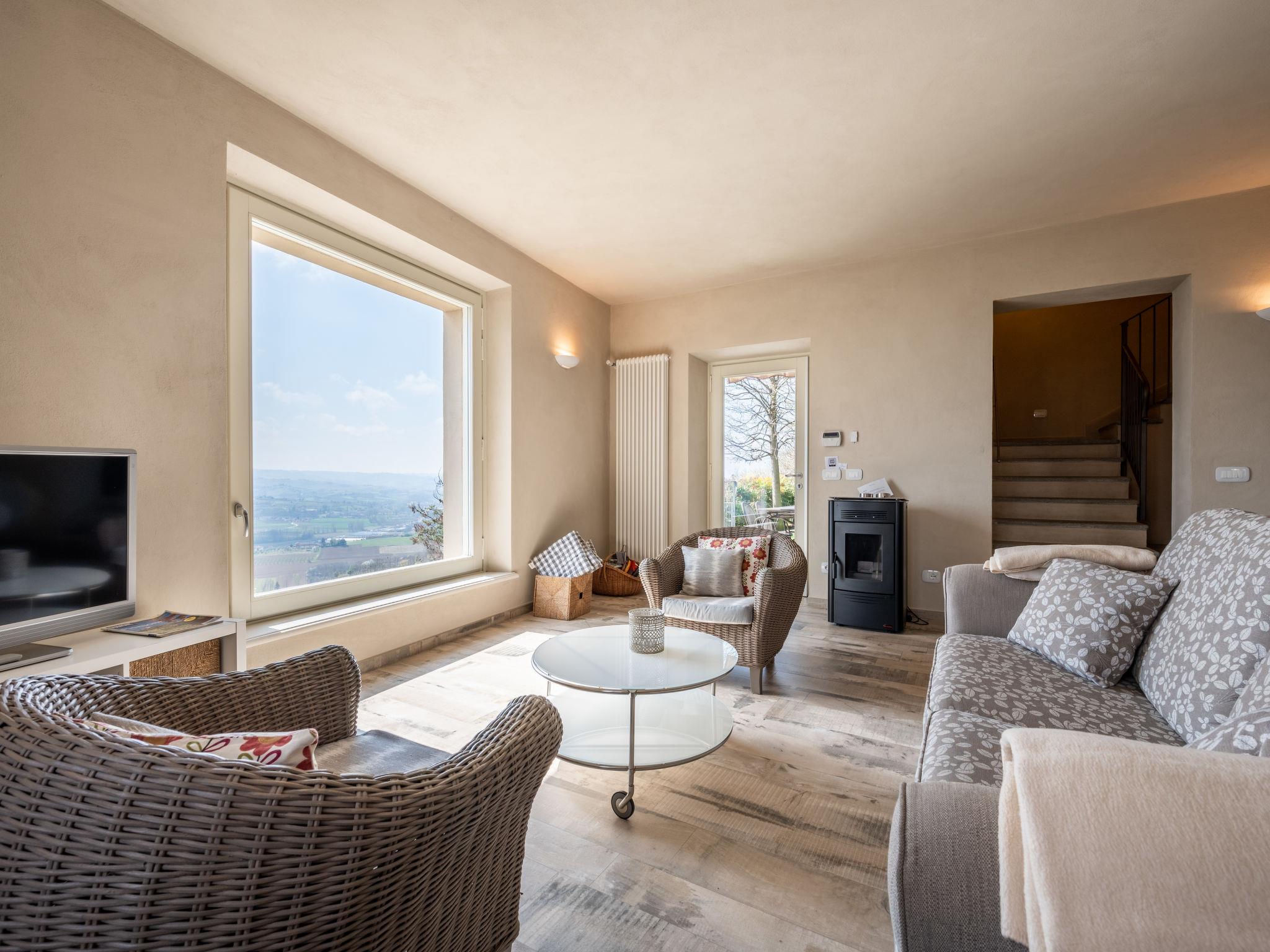 "Cascina Vigne", 3-Zimmer-Doppelhaushälfte 95 m2 auf 2 Stockwerken. Komfortabel und modern eingerichtet: Wohnzimmer mit Schwedenofen, Esstisch, Sat-TV und Stereoanlage. Ausgang zur Terrasse. Offene Küche (Geschirrspüler, 4 Induktionskochplatten, Toaster, Wasserkocher, Tiefkühler, elektrische Kaffeemaschine). Sep. WC. Obergeschoss: 2 Zimmer, jedes Zimmer mit 1 Doppelbett (180 cm, Länge 200 cm), Dusche/WC. Ausgang zum Balkon. Heizung, Klimaanlage. Natursteinboden. Balkon, 2 Terrassen teilweise überdacht, Garten, Rasen. Terrassenmöbel, Balkonmöbel, Gartengrill (mobil). Sehr schöne Panoramasicht auf die Landschaft und das Städtchen. Zur Verfügung: Bügeleisen, Fliegengitter, Kinderhochstuhl, Babybett. Internet (WLAN, gratis). Bitte beachten: Nichtraucher-Unterkunft. Eigener Eingang. Bettwäsche, Handtücher, Endreinigung und alle Energiekosten sind inkludiert. IT005050B4F3ON9SBR