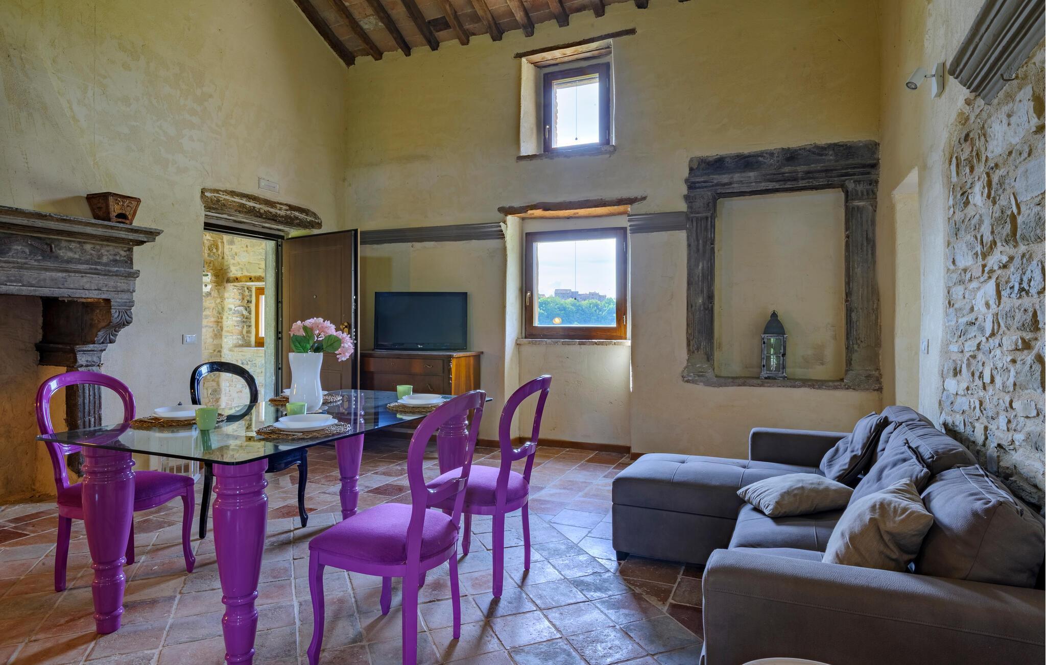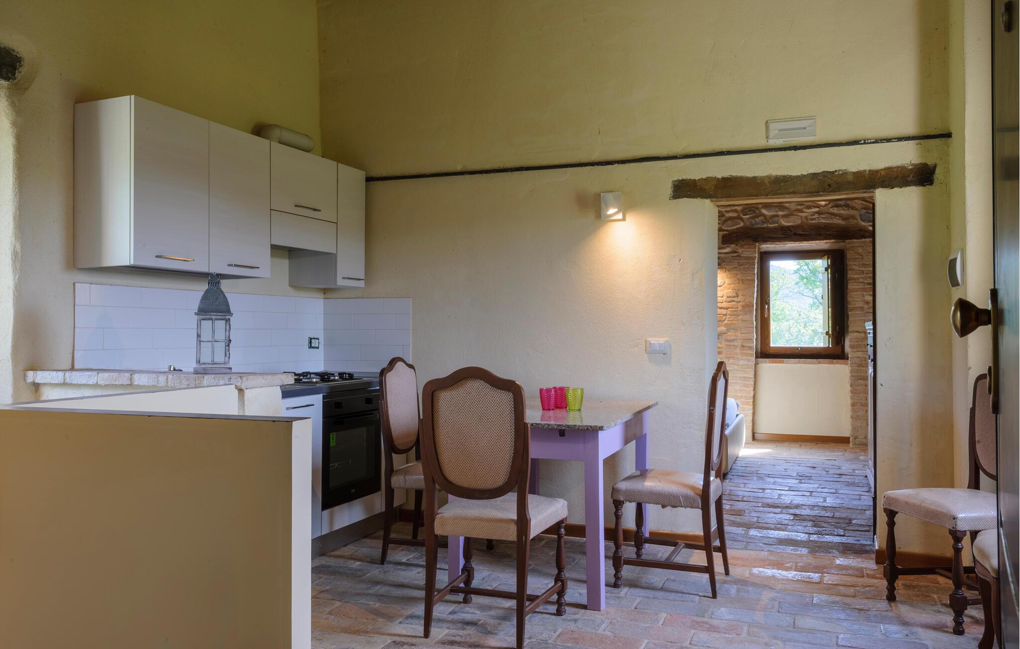 Ihr historisches Ferienhaus in Frontino besticht durch seine rustikale Steinarchitektur und lädt Sie ein, den besonderen Charme dieser Gegend zu erleben. Betreten Sie das gemütliche Wohnzimmer, das mit einem einladenden Sofa und stilvollen Details ausgestattet ist. Lassen Sie den Tag in dieser warmen Atmosphäre beginnen, vielleicht mit einem Buch in der Hand oder einer Tasse Kaffee. Bereiten Sie sich in der Küche ein köstliches Frühstück zu. Die Kombination aus modernen Annehmlichkeiten und traditionellem Design schafft eine besondere Wohlfühlatmosphäre. Setzen Sie sich anschließend an den großzügigen Esstisch und genießen Sie Ihre Mahlzeiten in einer Umgebung, die authentische italienische Gemütlichkeit ausstrahlt.