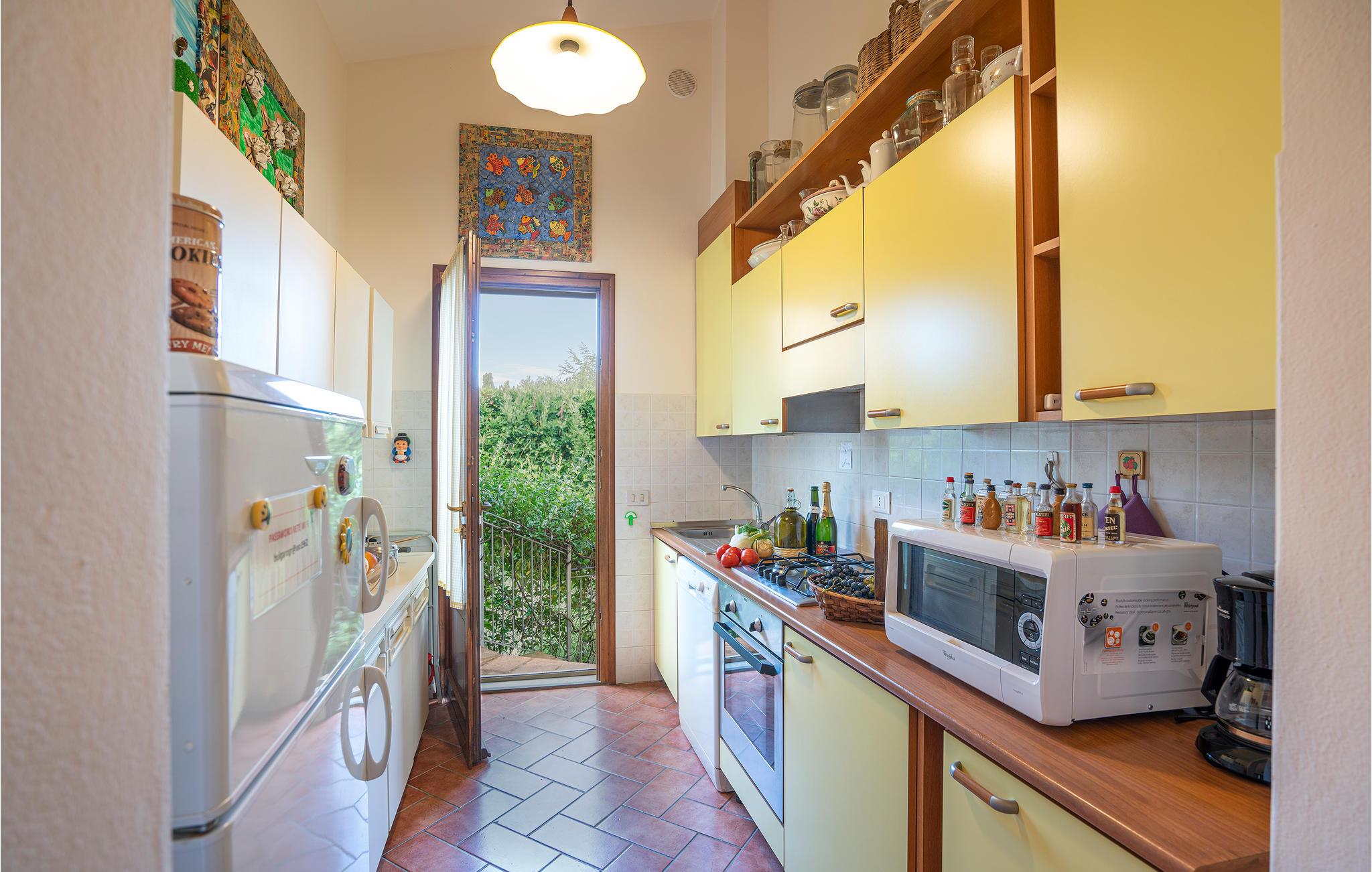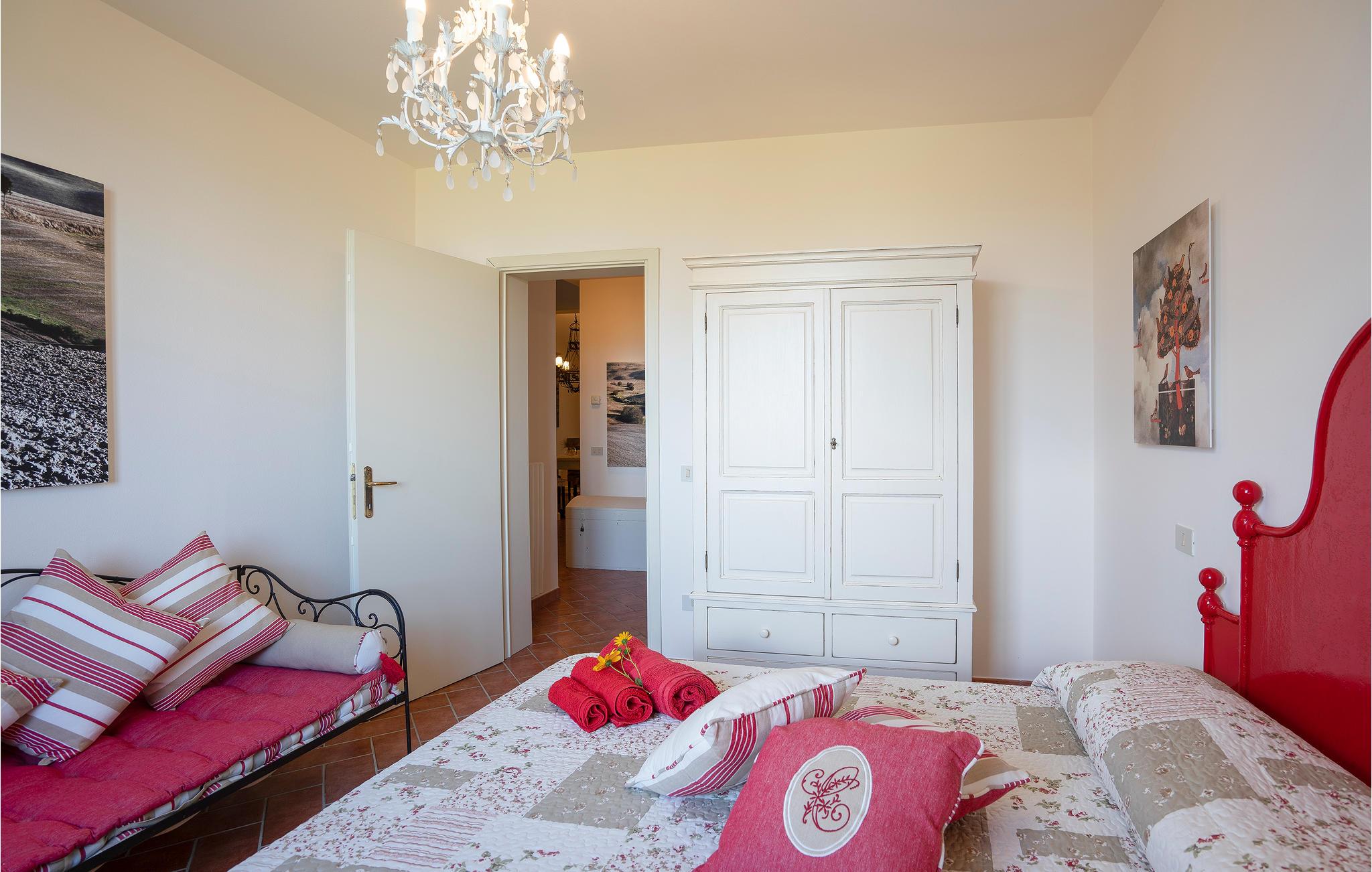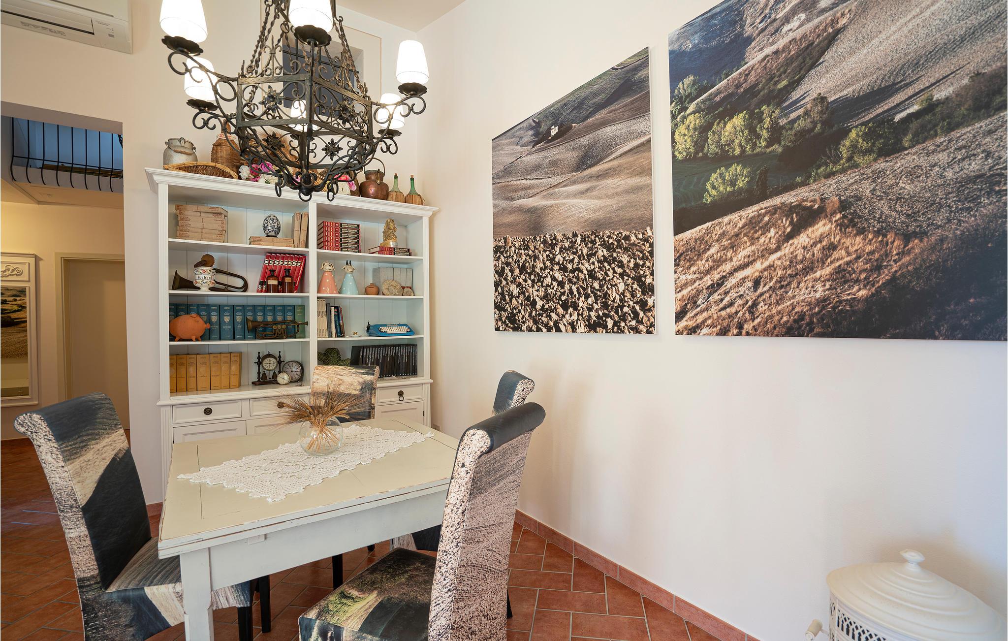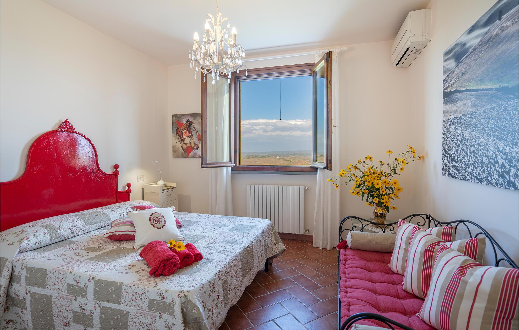 Schöne Ferienwohnung in Zweifamilienhaus in der Nähe von Lajatico, Heimatstadt des Tenors Andrea Bocelli, in der Provinz von Pisa, mit Privatgarten und fantastischem Panoramablick auf das Tal, wo sich das einzigartige Amphitheater im Freien Teatro del Silenzio befindet, 300 m vom Haus entfernt, und wo einmal jährlich im Juli ein Konzert des weltberühmten Tenors gehalten wird. Gepflegte und elegante Einrichtung mit moderner Ausstattung. Schöner, privater und umzäunter Garten, ausgestattet, um entspannende Stunden in grüner Umgebung zu verbringen. Einige der schönsten toskanischen Kunststädte sind leicht erreichbar: 20 km Volterra, die Hügelstadt etruskischen Ursprungs; 32 km San Gimignano, die mittelalterliche Stadt der Türme; 50 km Pisa mit dem berühmten Schiefen Turm; 56 km die lebendige Hafenstadt Livorno Lajatico mit Geschäften aller Art ist 200 m entfernt und auch zu Fuß erreichbar. 40 km die schönen Sandstrände der Etruskerküste.