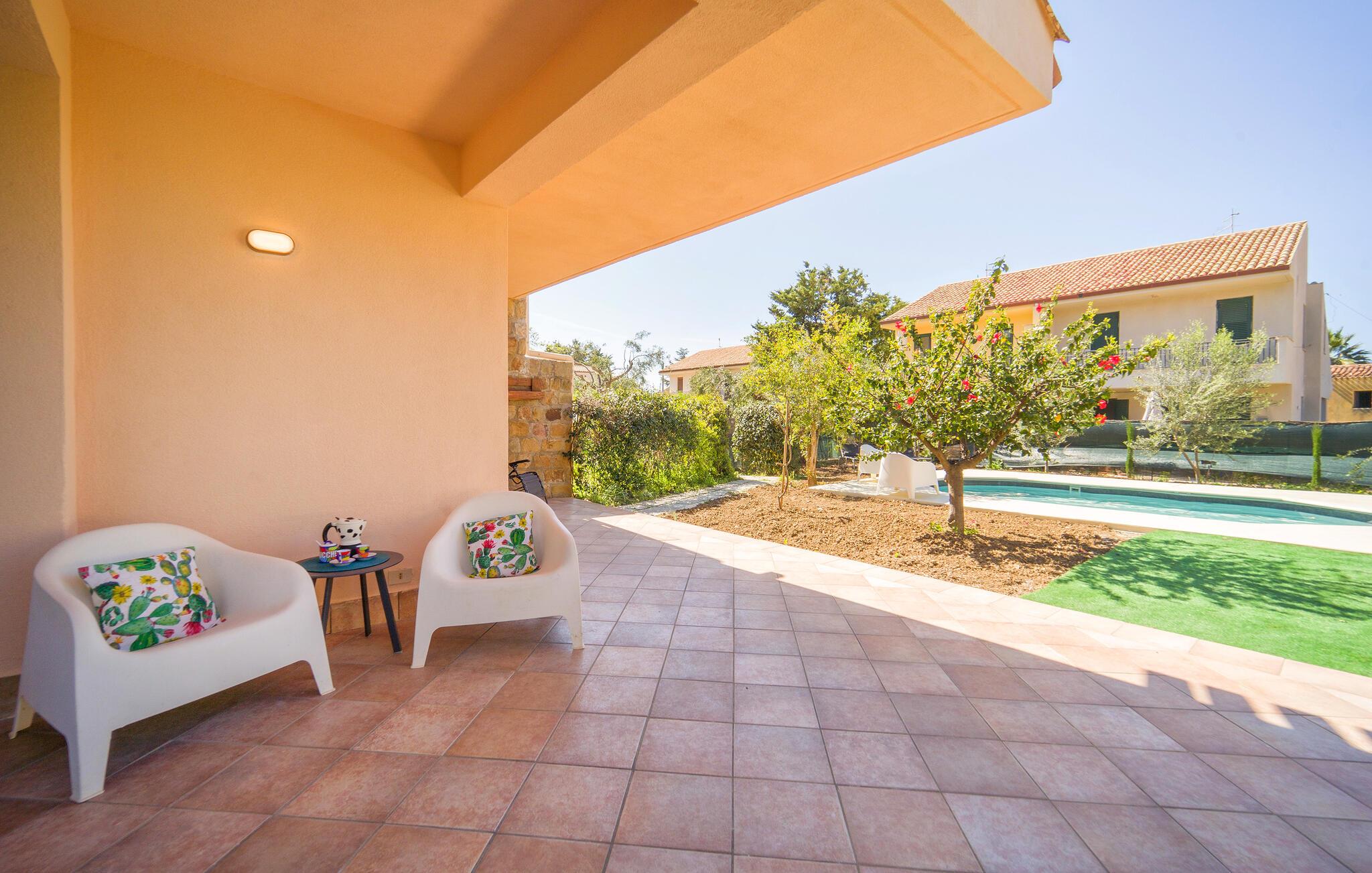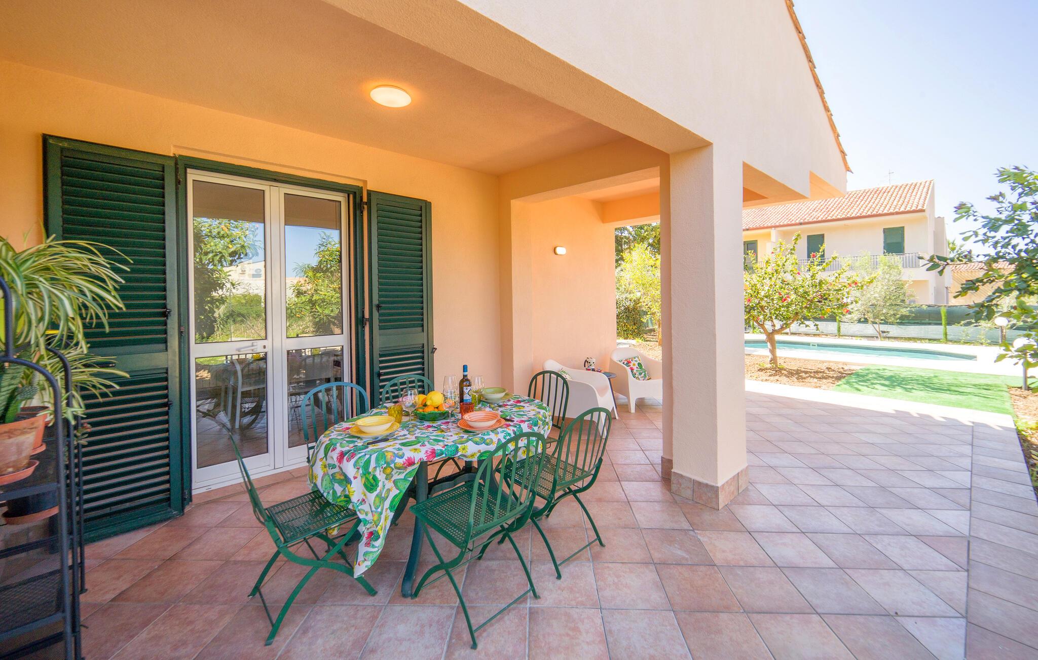 Treten Sie aus dem Wohnbereich ins Freie. Genießen Sie die Sonne auf der Terrasse des Ferienhauses, erfrischen Sie sich im Pool und lassen Sie einen herrlichen Urlaubstag mit einem Essen unter freiem Himmel ausklingen.