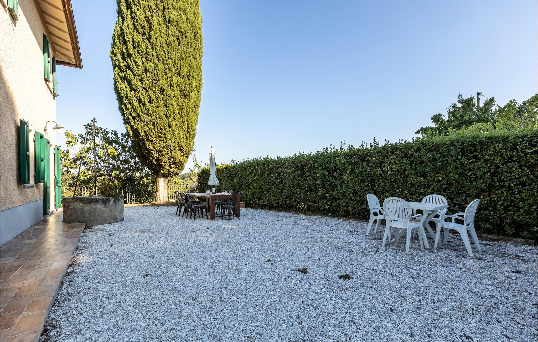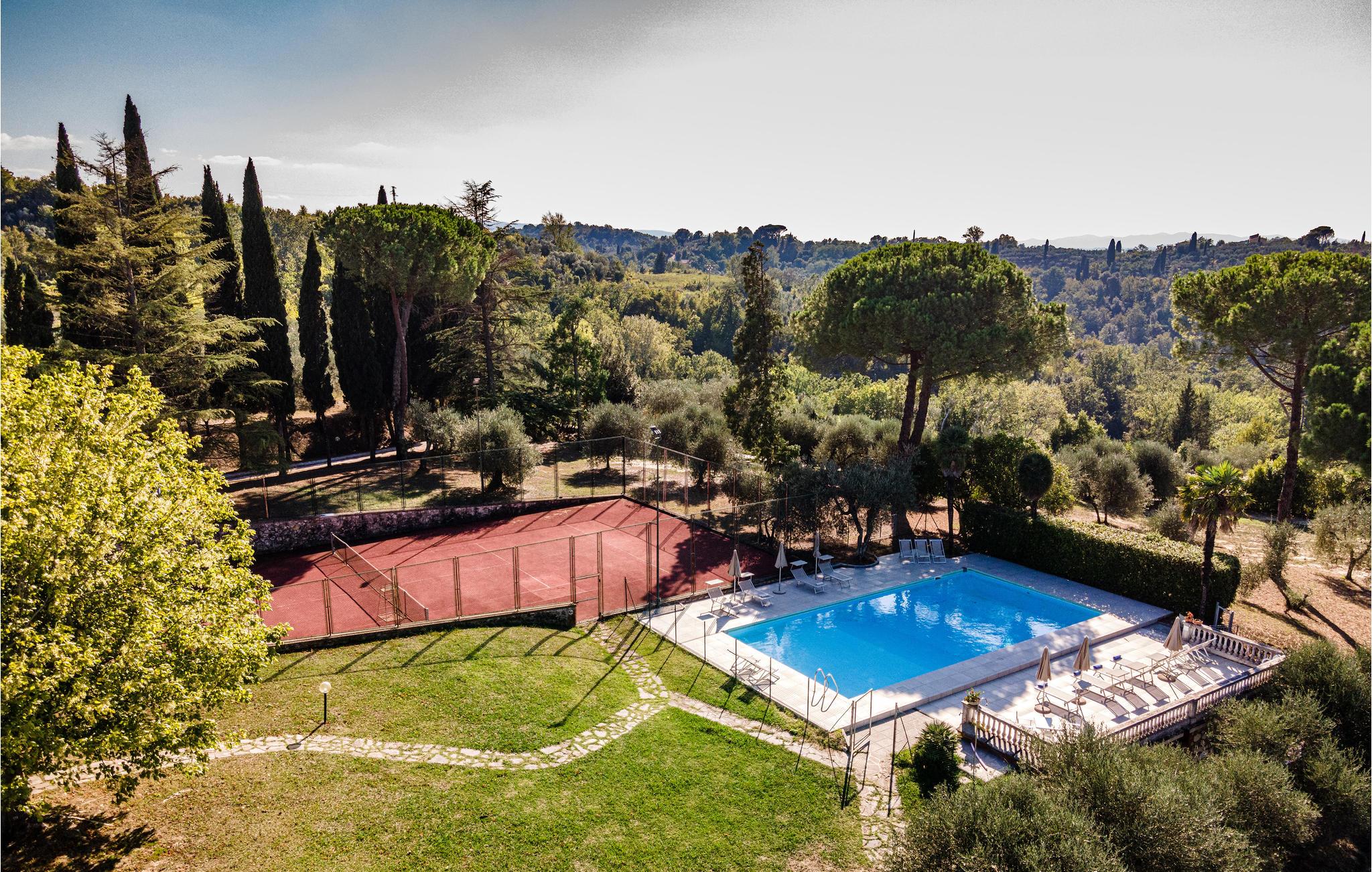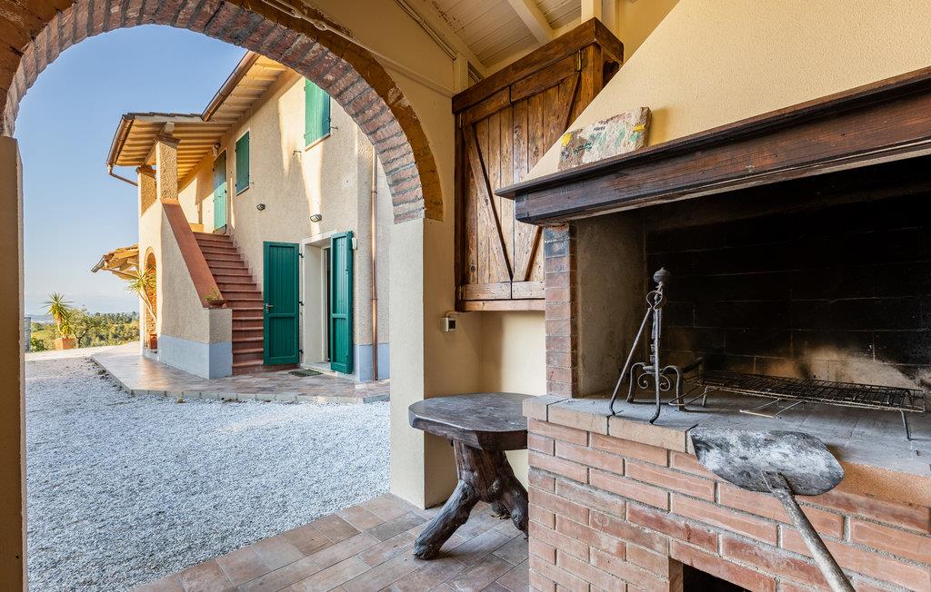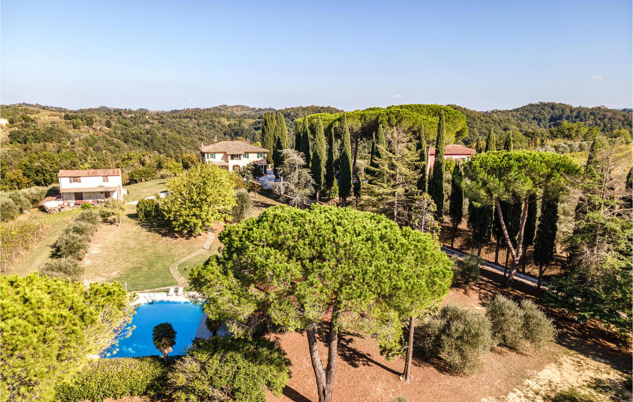 Ferienhaus mit Pool und Tennisplatz, beide zur gemeinschaftlichen Benutzung, in Palaia, in der Provinz Pisa. Das Haus verfügt über eine Terrasse mit schönem Ausblick auf die Hügellandschaft um Pisa und auf die Weinberge, die einige der bedeutendsten toskanischen Weine erzeugen. Die Strände von Marina di Pisa befinden sich in 45 km Entfernung, wohingegen die Stadt Pisa mit ihrem berühmten schiefen Turm und auch der Flughafen von Pisa ca. 30 km entfernt liegen. Die Kunststädte Lucca, Florenz und Siena sind jeweils 56 km, 64 km und 90 km entfernt. Den Außenbereich teilen Sie mit den Gästen einer weiteren Ferienwohnung, daher stehen Pool und Tennisplatz sowie Spielplatz und Tischtennis zur gemeinschaftlichen Nutzung zur Verfügung.