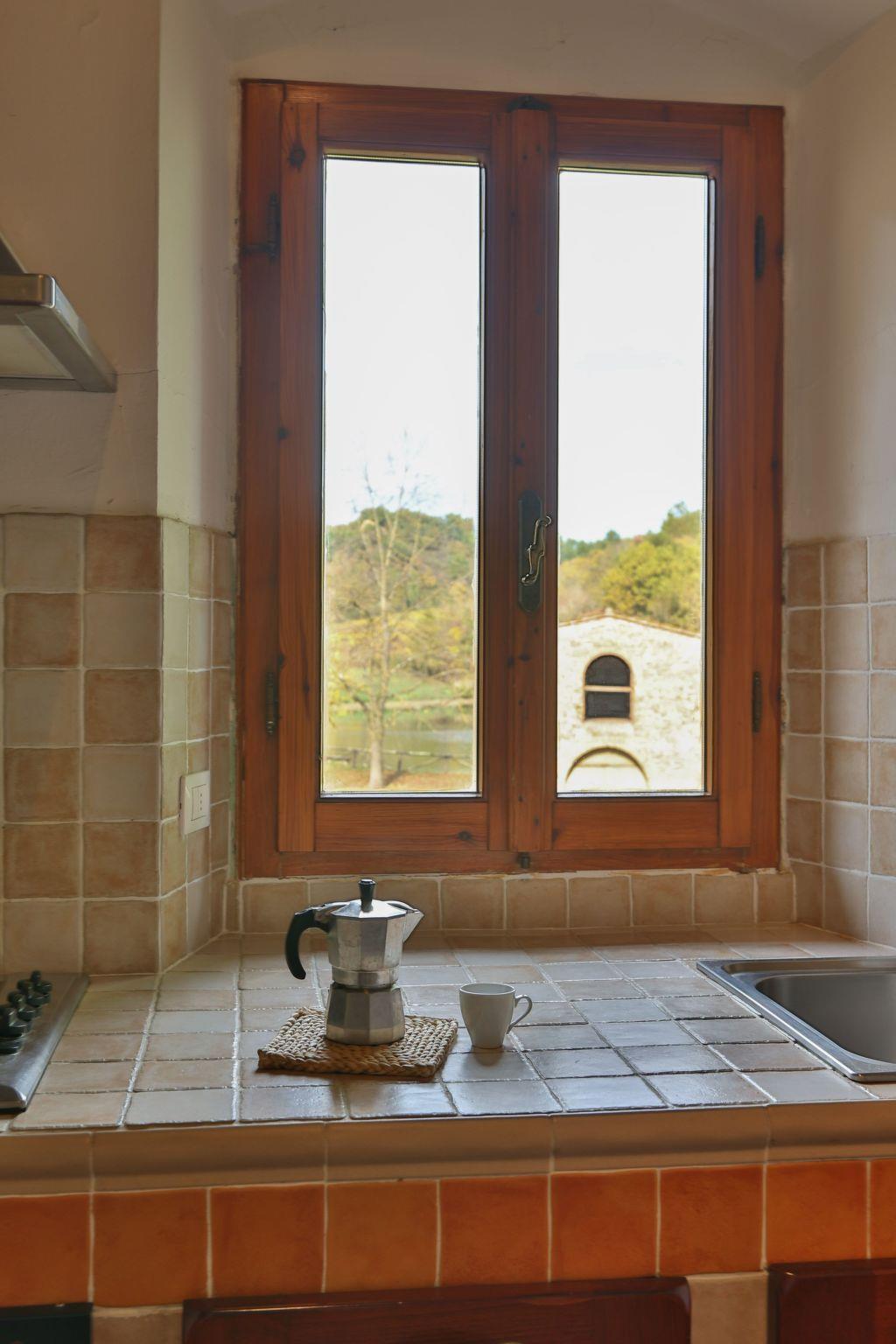 Die Ferienwohnung befindet sich in einem der 2 Hauptgebäude des Bauernhofs. Sie befindet sich im ersten Stock und besteht aus einem Wohnzimmer, einer Küche, einem Abstellraum, einem Schlafzimmer und einem Badezimmer. Wie die anderen Ferienunterkünfte auf dem Agriturismo ist auch diese Wohnung liebevoll im rustikalen Stil eingerichtet und strahlt eine sehr wohnliche Atmosphäre aus. Das Wohnzimmer mit zwei Sofas und einem schönen hölzernen Couchtisch direkt am Kamin ist der ideale Ort für romantische Abende zu zweit, aber auch für gemütliche Abende in Gesellschaft. Im Wohnzimmer befindet sich auch ein Einzelbettsofa, das für Kinder bis zu 12 Jahren geeignet ist. In der Küche steht ein kleiner Esstisch für drei Personen, und die voll ausgestattete Küche verfügt über einen Gasherd, einen Backofen und einen Kühlschrank mit Gefrierfach. Das Schlafzimmer ist mit einem Doppelbett ausgestattet, das Badezimmer hat eine Dusche und ein Bidet. Außerdem verfügt die Ferienwohnung über Digitalfernsehen im Wohnzimmer, eine unabhängige Gasheizung und eine Waschmaschine im Abstellraum.