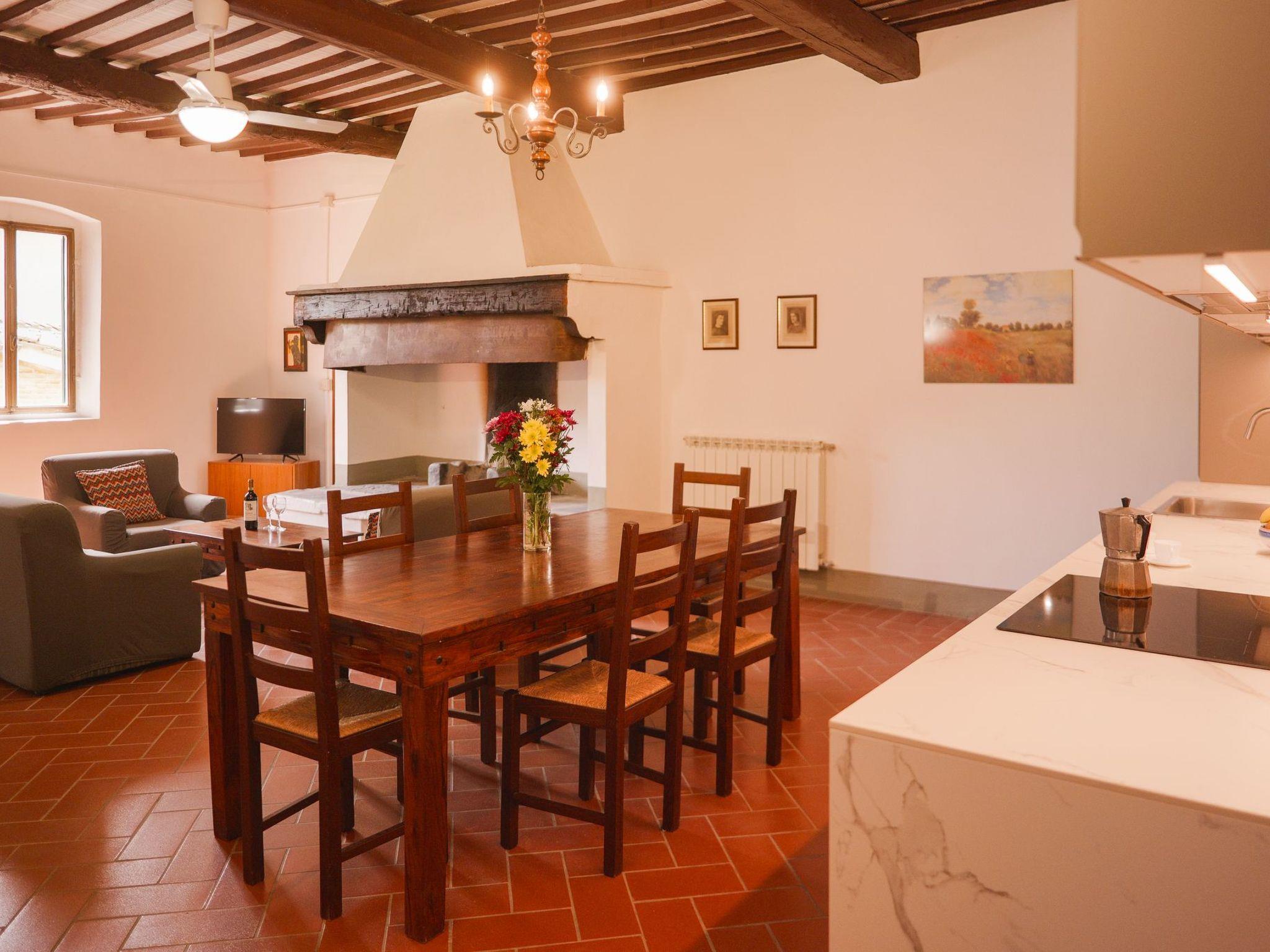 Die Ferienwohnung befindet sich in einem der 2 Hauptgebäude des Bauernhofs. Die Wohnung strahlt durch die Holzbalken und die vielen Holzmöbel einen rustikalen Charme aus. Die Wohnung besteht aus einem Wohnzimmer mit offener Küche, Abstellraum, drei Schlafzimmern und drei Bädern. Im Wohnzimmer befindet sich eine gemütliche und einladende Sitzecke mit einem Sofa und Sesseln vor dem Kamin für gesellige Abende. Am Esstisch ist ausreichend Platz für acht Personen, um gemeinsam zu essen. Die offene Küche verfügt über einen Elektroherd, einen Backofen, einen Kühlschrank mit Gefrierfach und eine Spülmaschine. Zwei der Schlafzimmer sind mit einem Doppelbett ausgestattet, das andere mit 2 Einzelbetten. Die 3 Badezimmer haben jeweils eine Dusche und ein Bidet. Eine Waschmaschine ist ebenfalls vorhanden, ebenso wie ein digitaler Fernseher im Wohnzimmer.