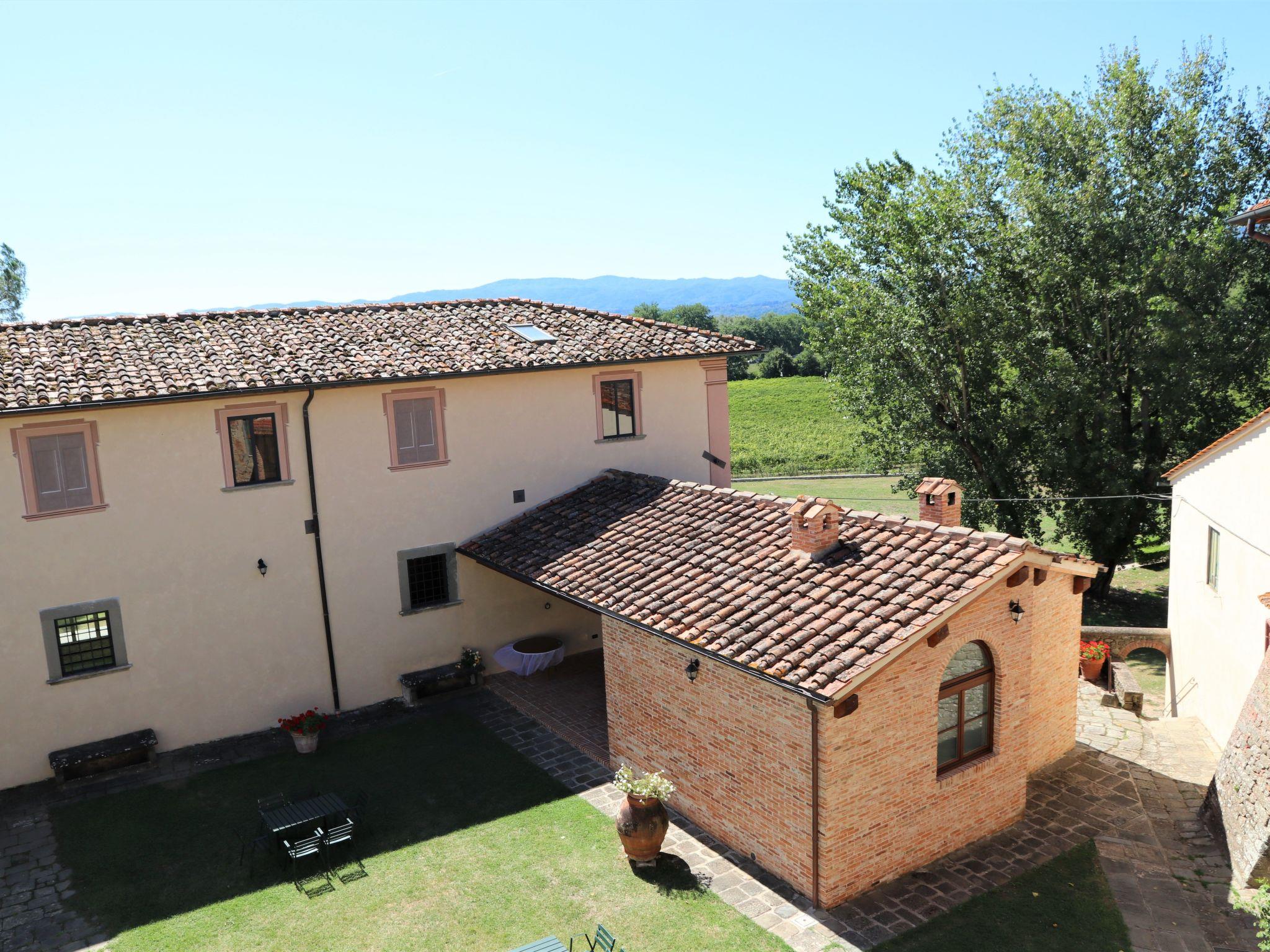 Diese neu renovierte 125 m2 große Wohnung befindet sich im 1. und 2. Stock eines der Hauptgebäude und ist mit traditionellen toskanischen Möbeln, modernen Bädern und einer großen Terrasse mit Tisch und Stühlen ausgestattet. Die 1. Etage besteht aus: Esszimmer und Wohnzimmer mit Esstisch, offenem Kamin, Kabel-TV; eine voll ausgestattete Küche (4-Flammen-Gasherd, Elektroofen, Kühl-Gefrierschrank, Geschirrspüler); ein Badezimmer (Dusche/Bidet/WC). Im 2. Stock mit schönen hohen Decken mit toskanischer Terrakotta und großen Holzbalken befinden sich: ein Schlafzimmer mit Doppelbett und ein angrenzendes Schlafzimmer mit einem Einzelbett und eigenem Bad mit Dusche/Bidet/WC; und zwei Schlafzimmer mit 2 Einzelbetten, beide mit eigenem Bad mit Dusche/Bidet/WC. Gasheizung in der gesamten Wohnung. Eine Waschmaschine ist ebenfalls vorhanden.