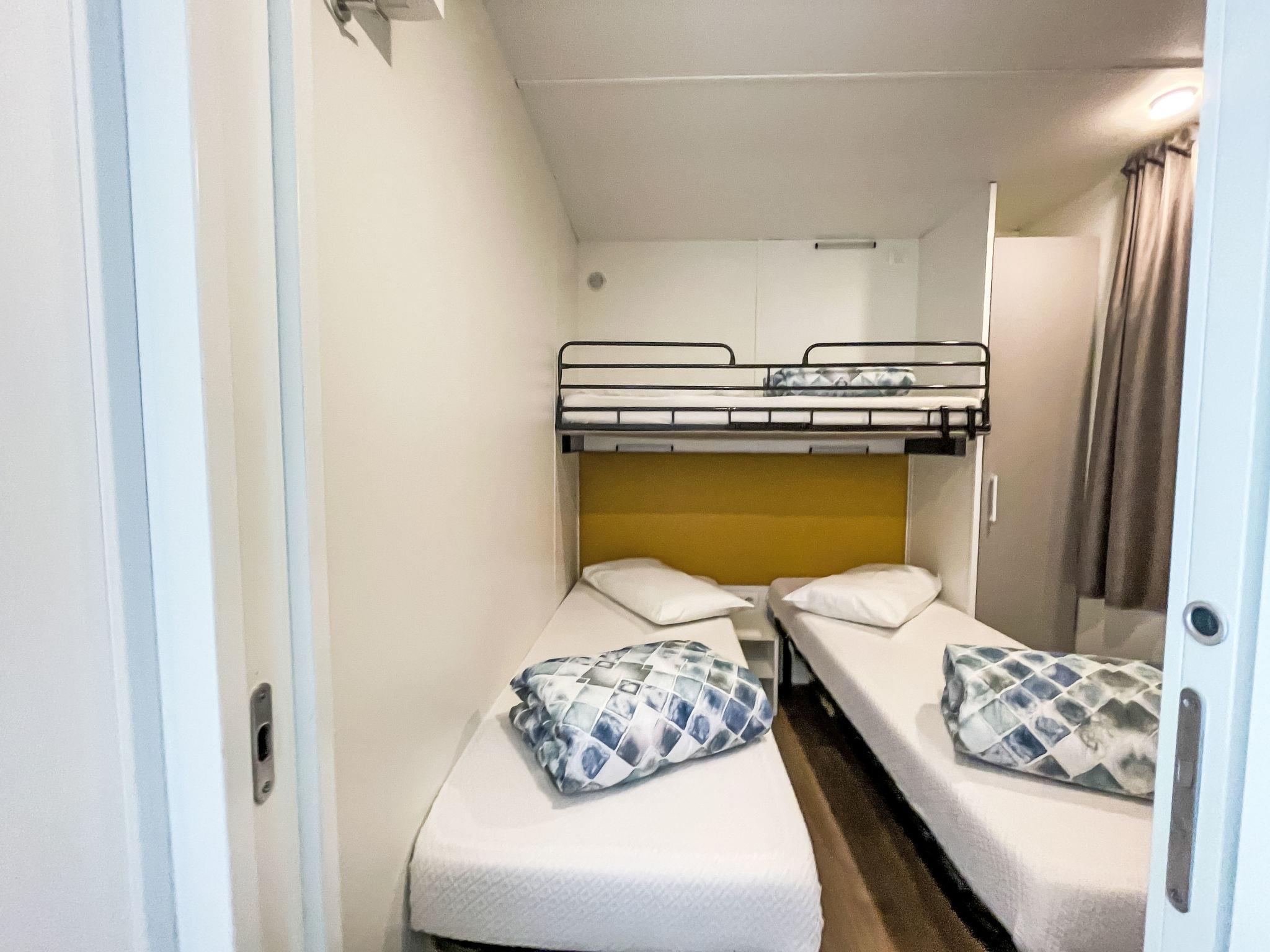 "Baia New Project", 3-Zimmer-Mobilheim 34 m2. Modern eingerichtet: Wohn-/Esszimmer mit Essecke und Digital-TV. Ausgang zur Terrasse. 1 Zimmer mit 1 franz. Bett (140 cm). 1 Zimmer mit 2 Betten (70 cm), 1 x 1 Etagenbetten (65 cm, Länge 170 cm). Kochnische (4 Induktionskochplatten, Tiefkühler, elektrische Kaffeemaschine). Dusche/Bidet/WC. Klimaanlage (extra). Terrasse. Terrassenmöbel. Zur Verfügung: Babybett (extra). Parkplatz (1 Auto). Bitte beachten: Nichtraucher-Unterkunft. Maximal 2 kleine Haustiere/Hunde erlaubt. Flexibilität bei der Bettenaufteilung: Es stehen mehr Schlafmöglichkeiten zur Verfügung als die maximal zugelassene Personenzahl, diese darf dennoch nicht überschritten werden. IT017171B1ZJWA3YLE