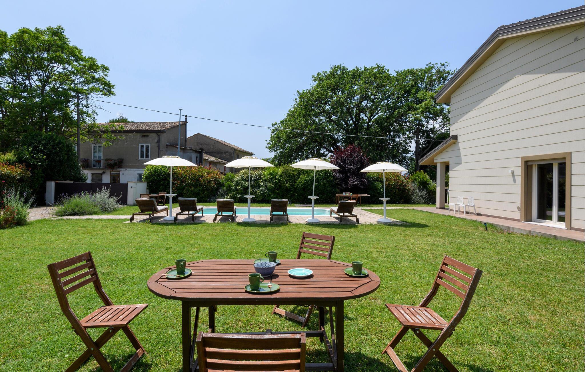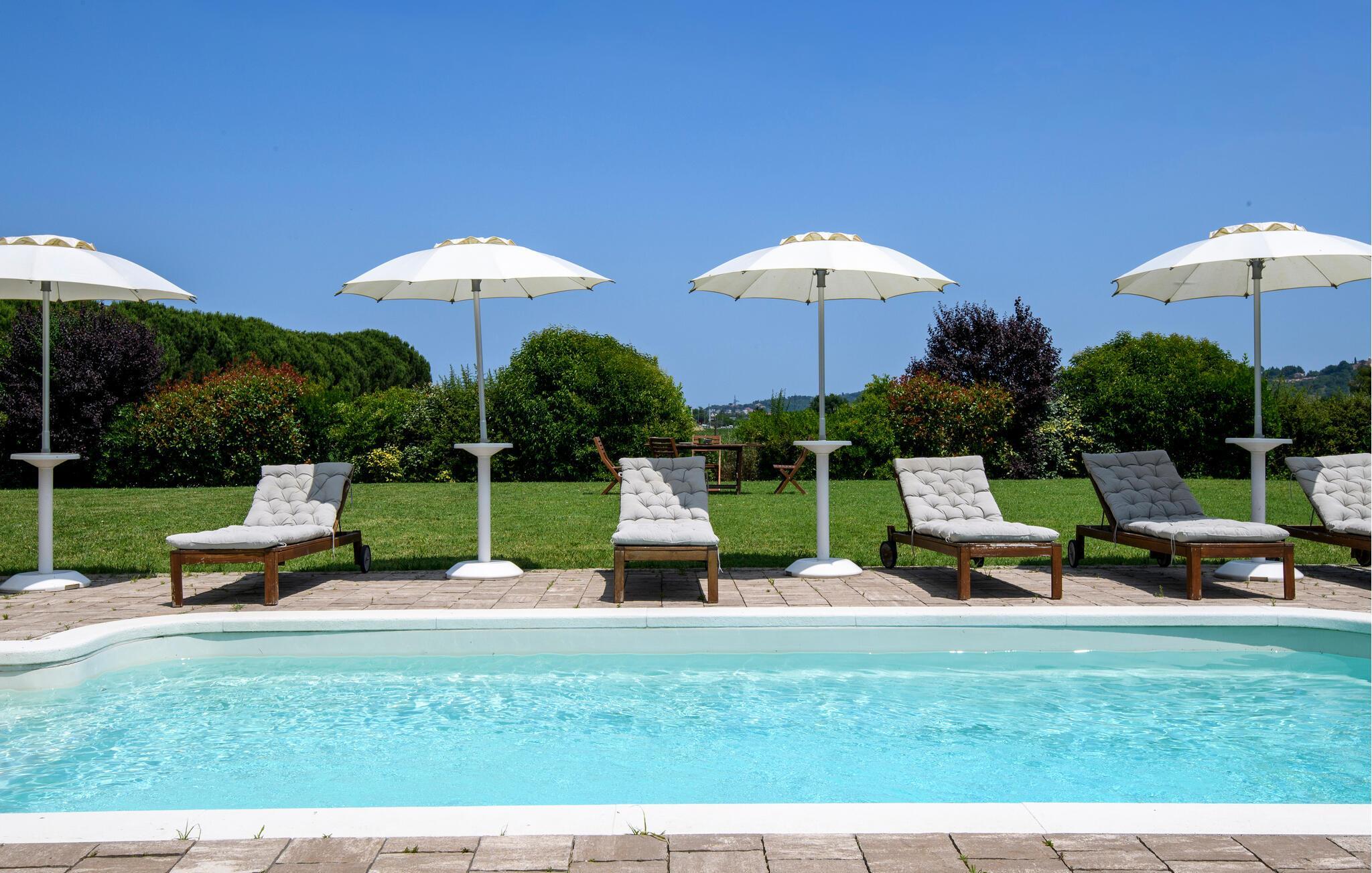 Nutzen Sie den weitläufigen, liebevoll gestalteten Garten, der Ihnen viel Raum für Erholung im Freien bietet. Entspannen Sie am beeindruckenden Pool und genießen Sie sonnige Tage am Wasser. Lassen Sie hier den Blick über die idyllische Landschaft der Romagna schweifen.