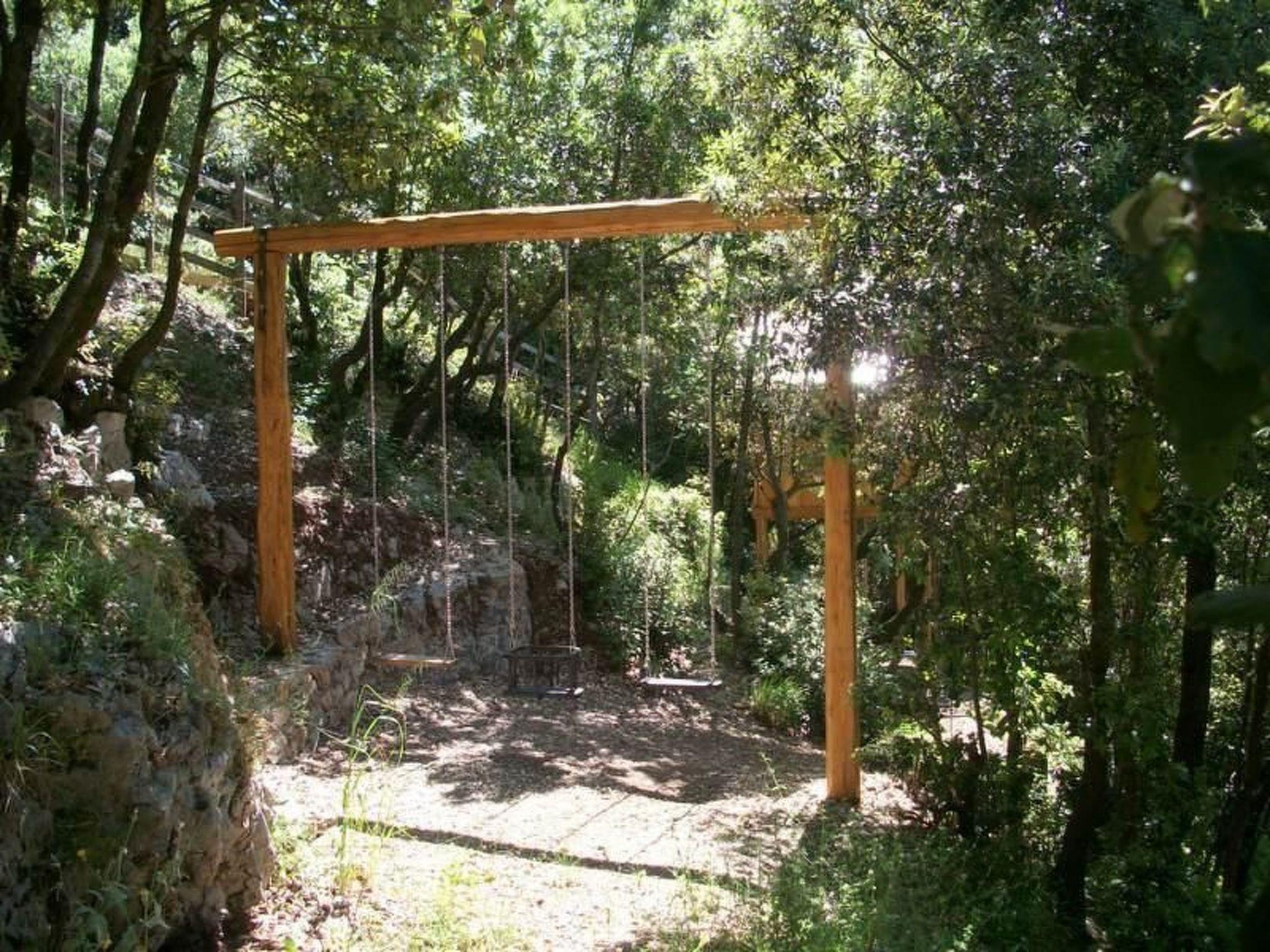 Das Gelände mit Wiese, Gemüsegarten und Steineichenwald ist mit Steinmauern terrassiert; jede Wohneinheit hat einen eigenen Zugang und Terrassen mit Panoramablick über die Berge und Täler des Golfo di Policastro und das Meer am Horizont.