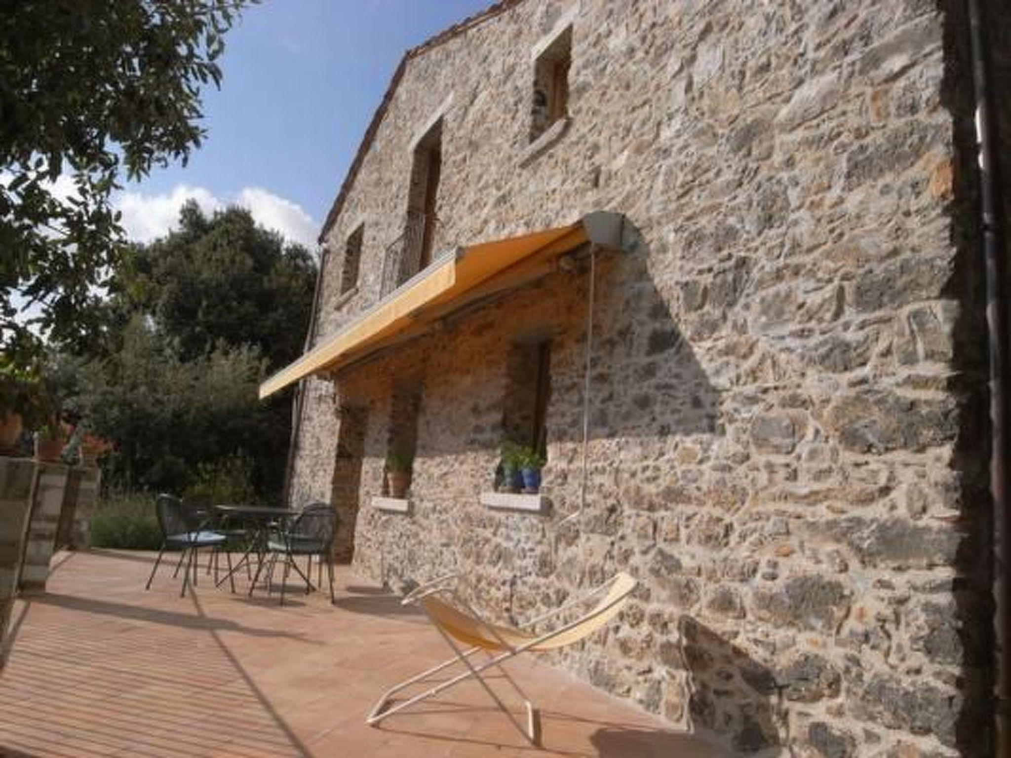Das Haus ist ringsum von Terrassenflaechen umschlossen. Die Terrasse zum Meer hin ist kaum einsehbar, das Haus schuetzt akkustisch und vor neugierigen Blicken anderer Feriengastparteien. Eine Markise spendet Schatten, Esstisch und -stuehle sowie Liegestuehle und ein gemauerter Grillplatz stehen zur Verfuegung. Hinter dem Haus schliesst sich direkt ein auch im Sommer kuehlender Steineichenwald an.