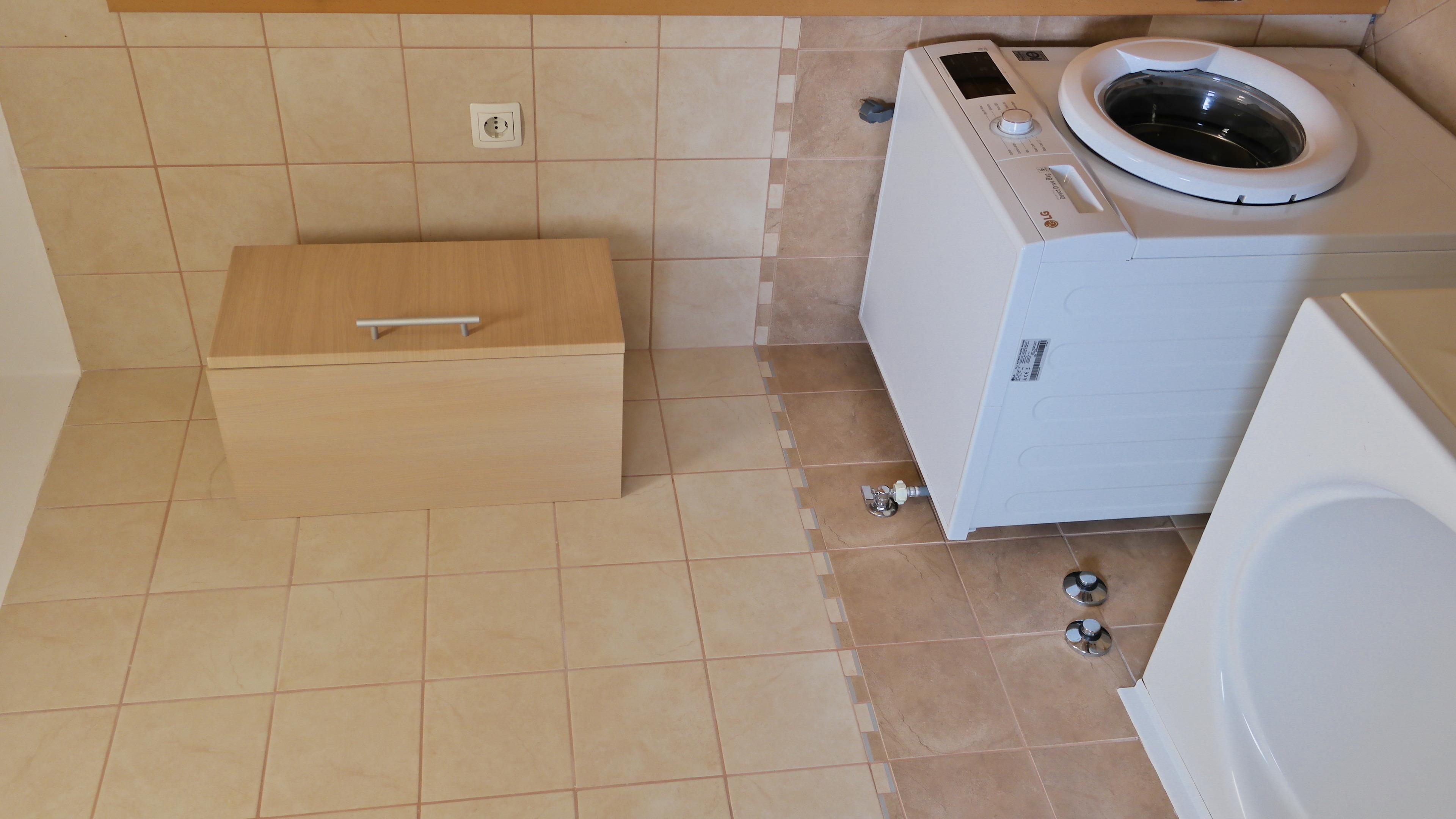 Das Badezimmer ist mit einer Waschmaschine, Toilette und einer Badewanne ausgestattet.