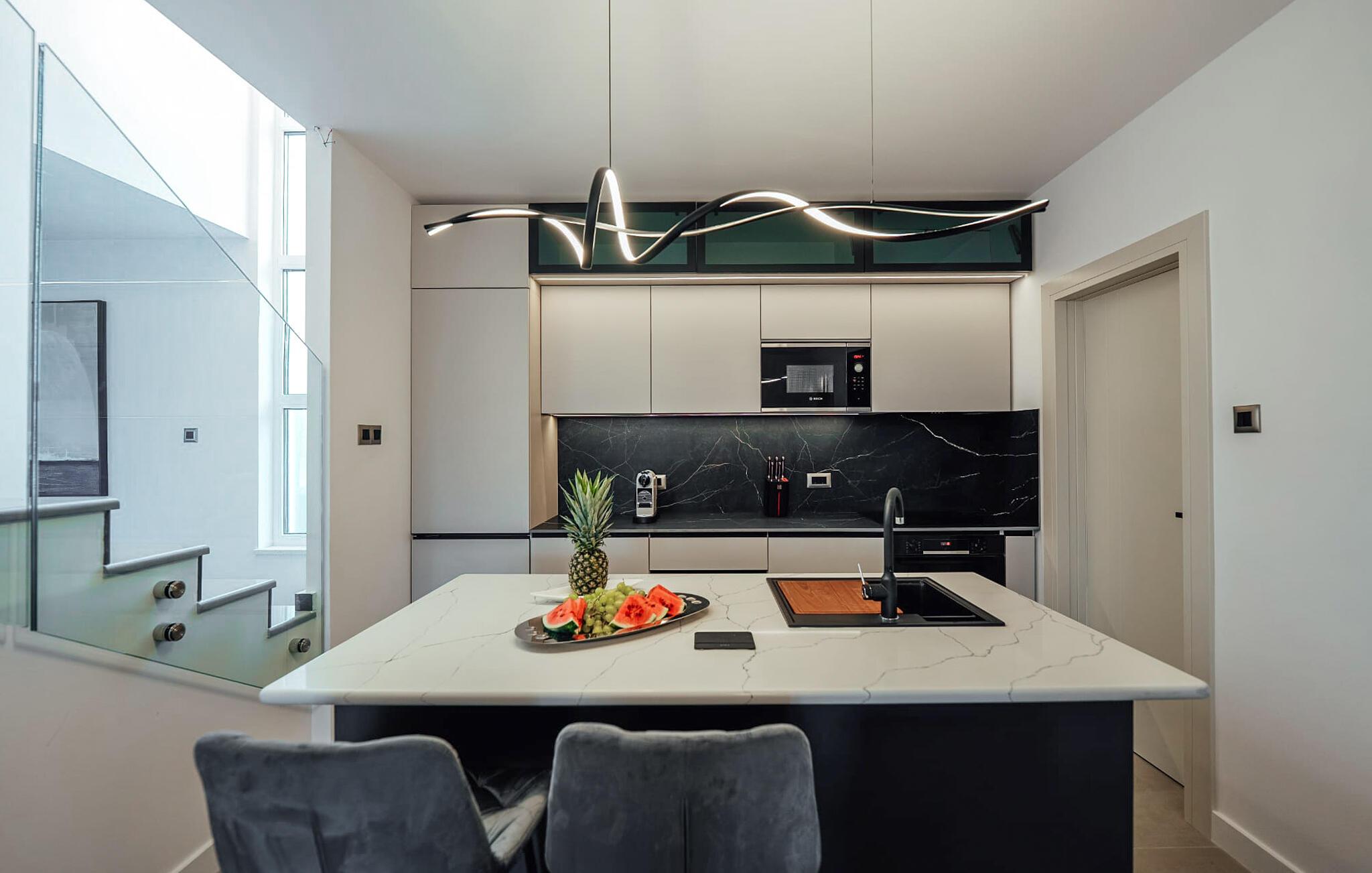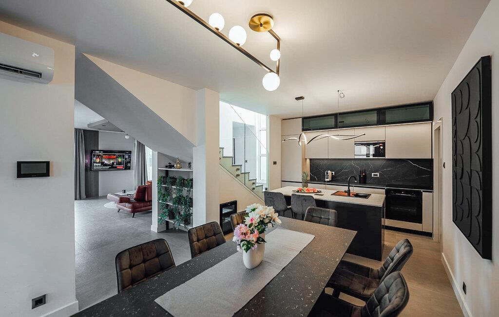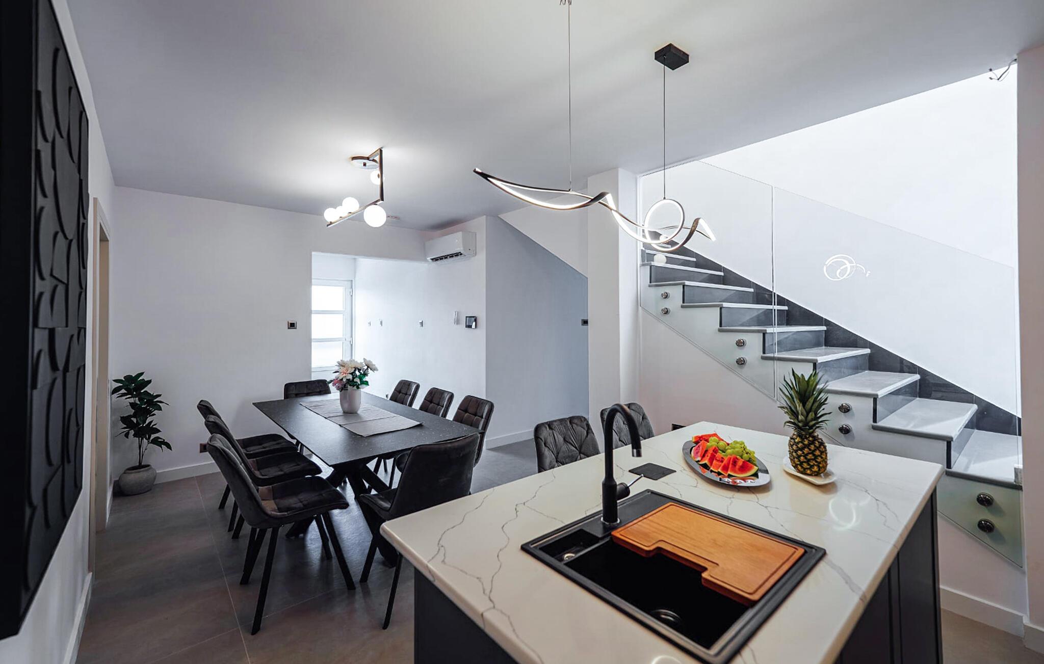 Willkommen in dem fantastisch gelegenen und geräumigen Haus, das Sie nur wenige Schritte vom Meer entfernt begrüßt und den idealen Rahmen für einen erholsamen Urlaub mit der ganzen Familie in exklusivem Ambiente bietet. Genießen Sie in den hell und modern möblierten Räumen die gemeinsame Zeit, sei es bei den gemeinsamen Mahlzeiten oder beim Entspannen in der gemütlichen Sitzgruppe, und lassen Sie sich vom Blick durch bodentiefe Fenster verzaubern.