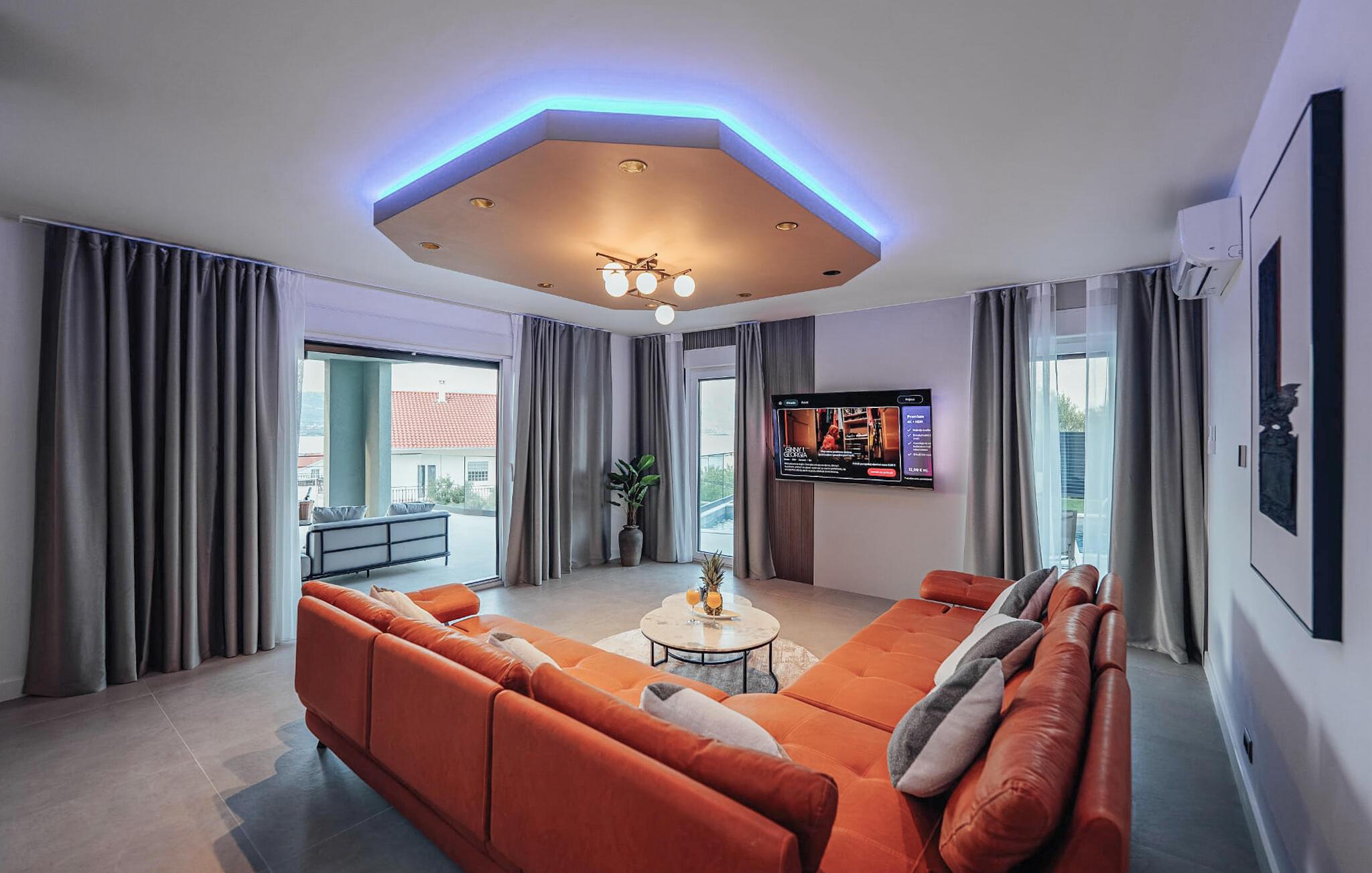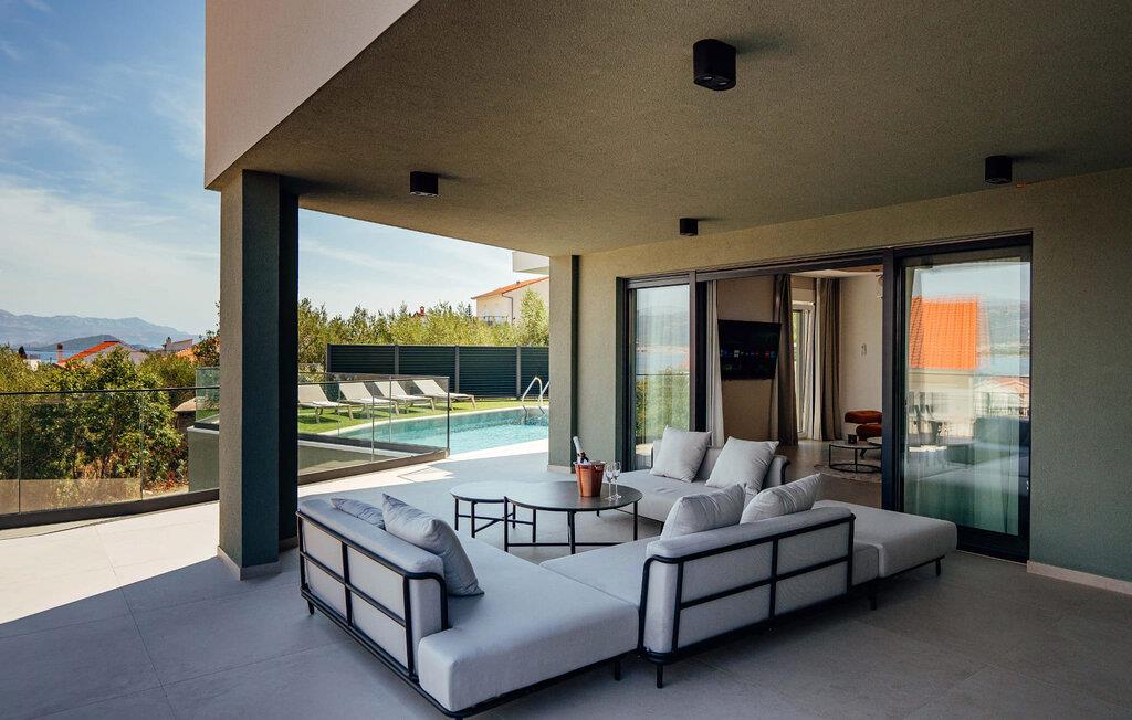 Genießen Sie den Blick auf das Meer in diesem komfortablen Ferienhaus mit Pool.