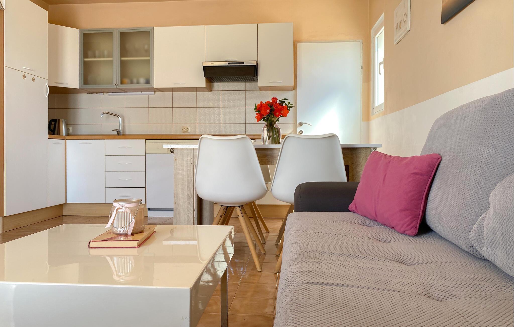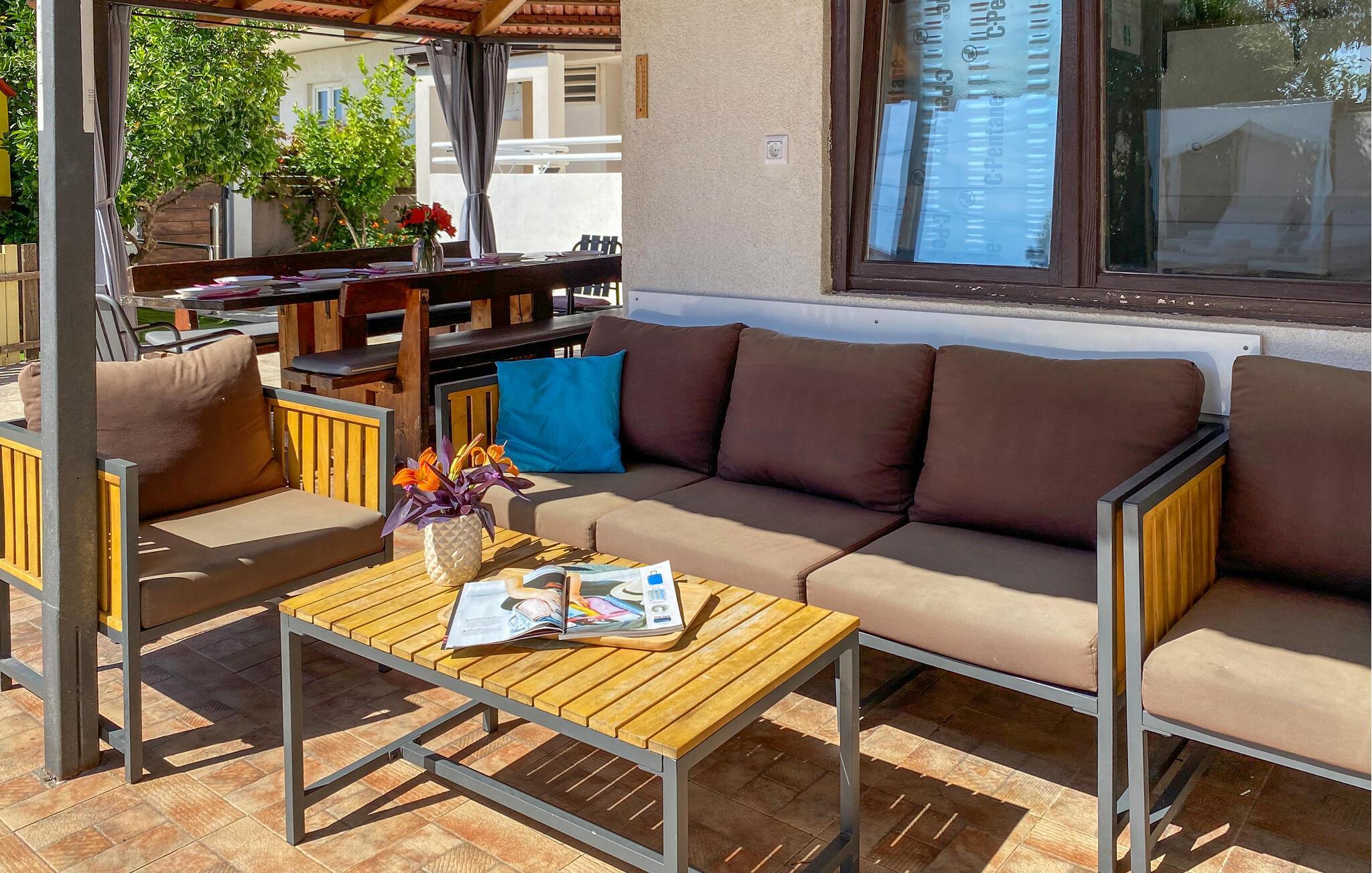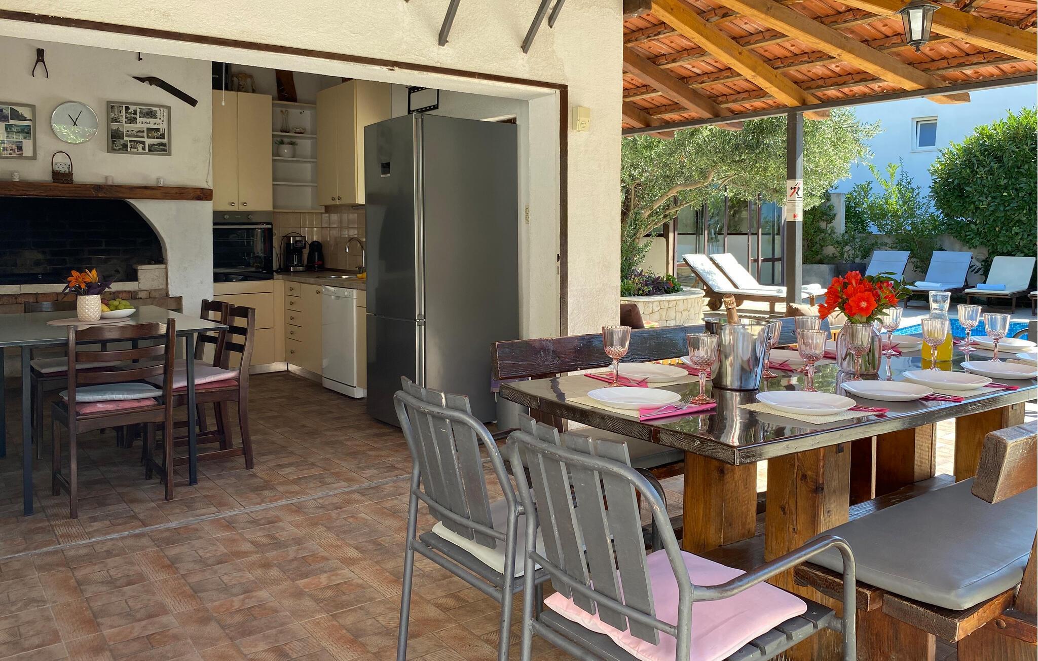 Dieses schöne Doppelhaus ist ideal für Familien die ihren Urlaub zusammen verbringen möchten. Das Ferienobjekt besteht aus zwei Wohneinheiten die über eine Außentreppe miteinander verbunden sind und daher jeder Partei bei Bedarf auch Privatsphäre bietet. Entspannen Sie sich auf der Terrasse, während die Kinder im umzäunten Bereich mit Spielhaus und Schaukel spielen oder im sich im Pool erfrischen. Auf dem komplett umzäunten Grundstück befindet sich auch eine Sommerküche mit großem Tisch für 12 Personen, der zu gesellige Stunden einlädt. Der kleine Ferienort ist bekannt für seinen schönen Kiesstrand, der viele Freizeitaktivitäten bietet. Besuchen Sie auch die Kulturstadt Trogir. In Trogir liegt der komplette Altstadtkern und in Split der Diokletianspalast unter dem Schutz der UNESCO. Nirgendwo auf der Welt gibt es solche Kulturschätze im Umkreis von nur 30 km. Man kann aus Trogir Ausflüge auf die Nachbarinseln unternehmen. Ciovo ist eine Insel, die durch eine Brücke mit Trogir verbunden ist. Von dort aus kann man auch mit Hilfe eines Bootes (aus dem Ort Slatina) in das Zentrum von Split gelangen. Der Vermieter wohnt in der Nähe und steht Ihnen gerne zur Verfügung, falls Sie etwas benötigen. Besuchen Sie unbedingt die Städte Trogir und Split, die im Sommer viele Möglichkeiten bieten und verschiedene Veranstaltungen und Events anbieten, die Ihren Urlaub ergänzen, sowie ein exzellentes gastronomisches Angebot, das traditionelle dalmatinische Gerichte und andere Köstlichkeiten umfasst, bieten.