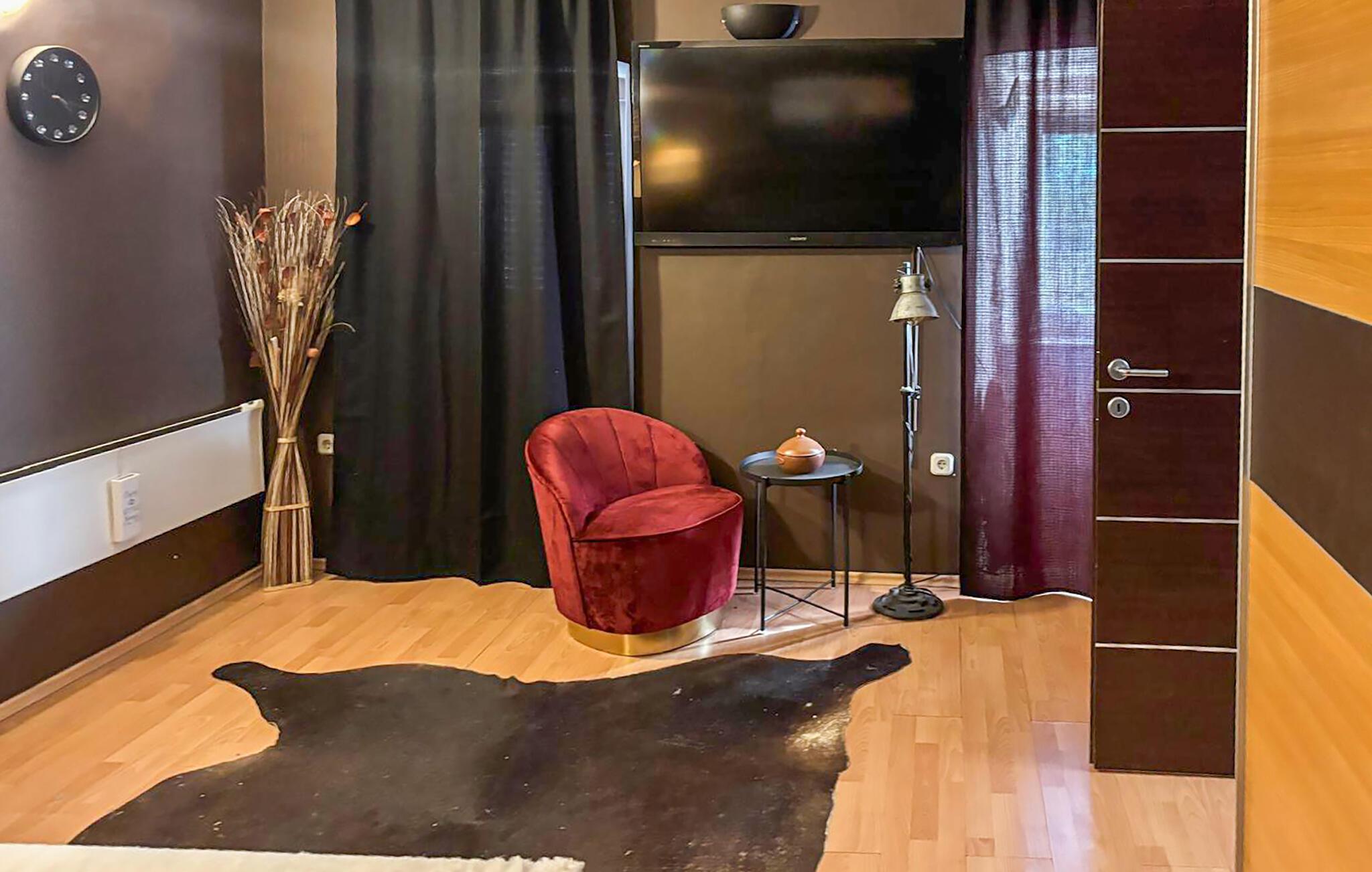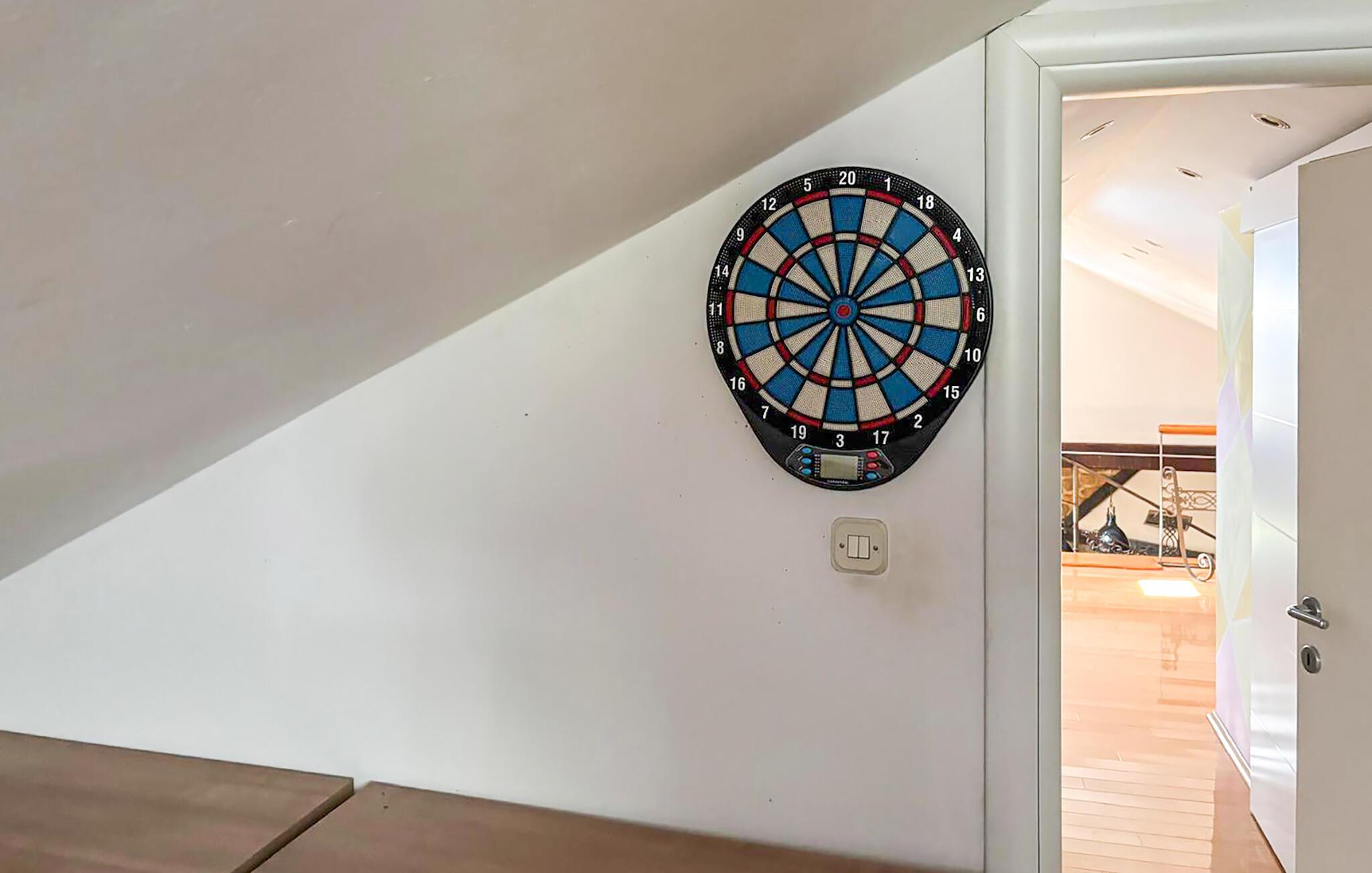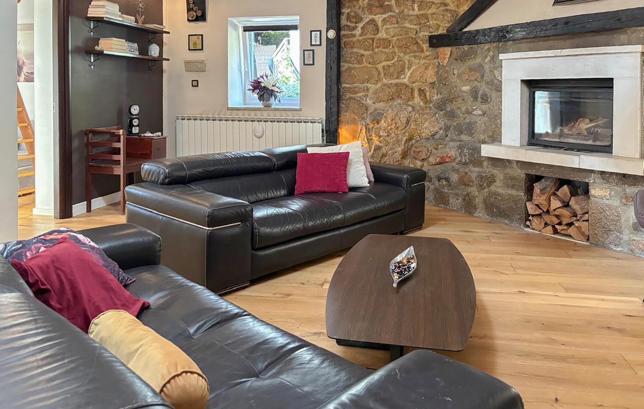 Dieses Haus verbindet rustikalen Charme mit modernem Komfort. Die Natursteinwand und der Holzboden schaffen eine warme, gemütliche Atmosphäre, während Leder-Sofas und stilvolle Möbel dem Raum einen eleganten, zeitgemäßen Charakter verleihen. Tanken Sie hier neue Energie, egal ob bei einem geselligen Film- oder Spieleabend, ob beim Dartspielen oder gemeinsamem Kochen.