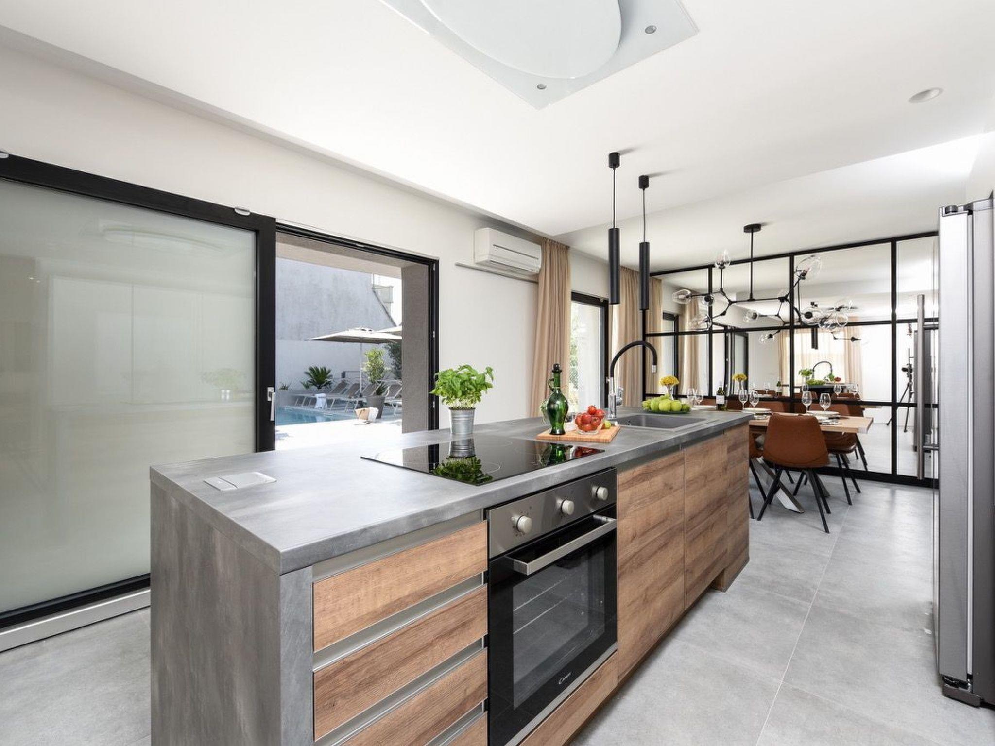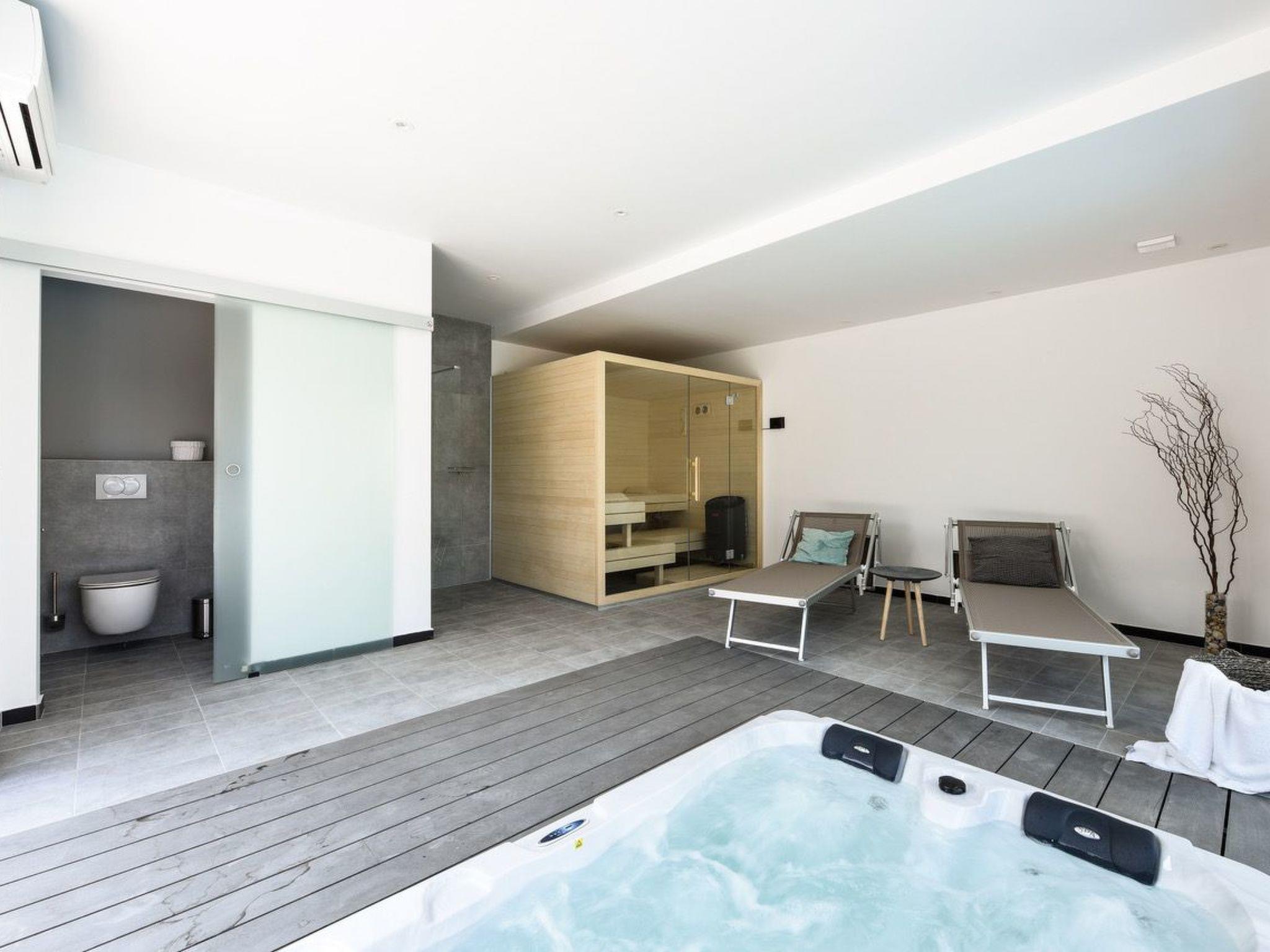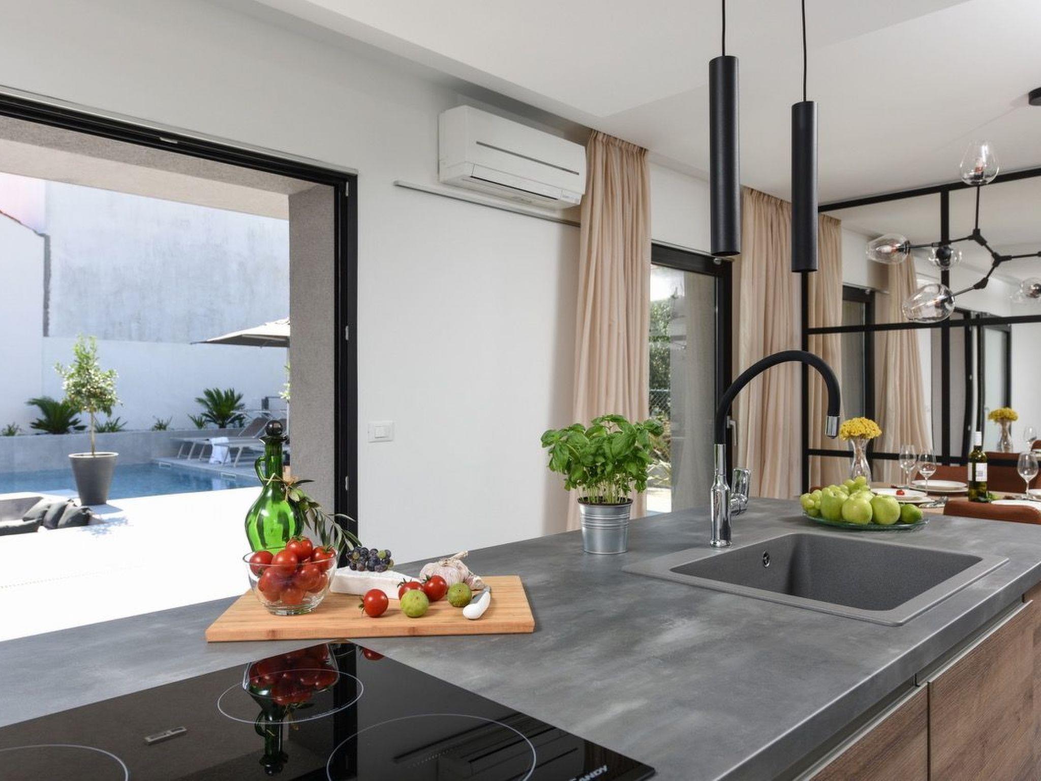 Villa Omnia bietet die Möglichkeit, einen herrlichen Urlaub für sechs Personen mit der Möglichkeit, zwei zusätzliche Betten zu verwenden. Im zweiten Stock gibt es ein Zimmer mit Bad, Kingsize-Bett, SMART (Internet) TV/Satellit, aber auch eine große, überdachte Terrasse mit königlichem Blick. Sie können sich im Whirlpool im Freien mit einem Glas Champagner entspannen. Die zweite Etage bietet ebenfalls einen Blick auf die Inseln, den Sonnenuntergang und die Segelboote auf dem Meer, den gesamten Garten, das Schwimmbad, die Sommerküche und den nahe gelegenen Olivenhain. Im ersten Stock befinden sich: - Zimmer mit eigenem Bad, Kingsize-Bett, SMART (Internet) TV/Satellit und eine freistehende Badewanne im Zimmer, die für Genuss und totale Entspannung sorgen wird. Auf Ihrer privaten großen Terrasse können Sie bequem eine Sitzgarnitur nutzen und einen schönen, beruhigenden Blick auf die Grünanlagen und den Pool genießen. - Zimmer mit eigenem Bad, zwei (zusammenstellbare) Betten, SMART (Internet) TV/Satellit und eine Nintendo Wii Spielkonsole. Im Erdgeschoss: Wohnzimmer und moderne, voll ausgestattete Küche mit Ausgängen auf eine große Terrasse, die zum Verweilen einlädt. Es gibt auch ein Badezimmer und einen Abstellraum (Waschen, Trocknen und Bügeln). Im Wohnzimmer gibt es eine bequeme Ledercouch, die in ein zusätzliches Schlafsofa umgewandelt werden kann (Größe 160x200), Kamin, große Smart-TV / Satellit, DVD-Player und Play Station4 Gerät mit Spielen.