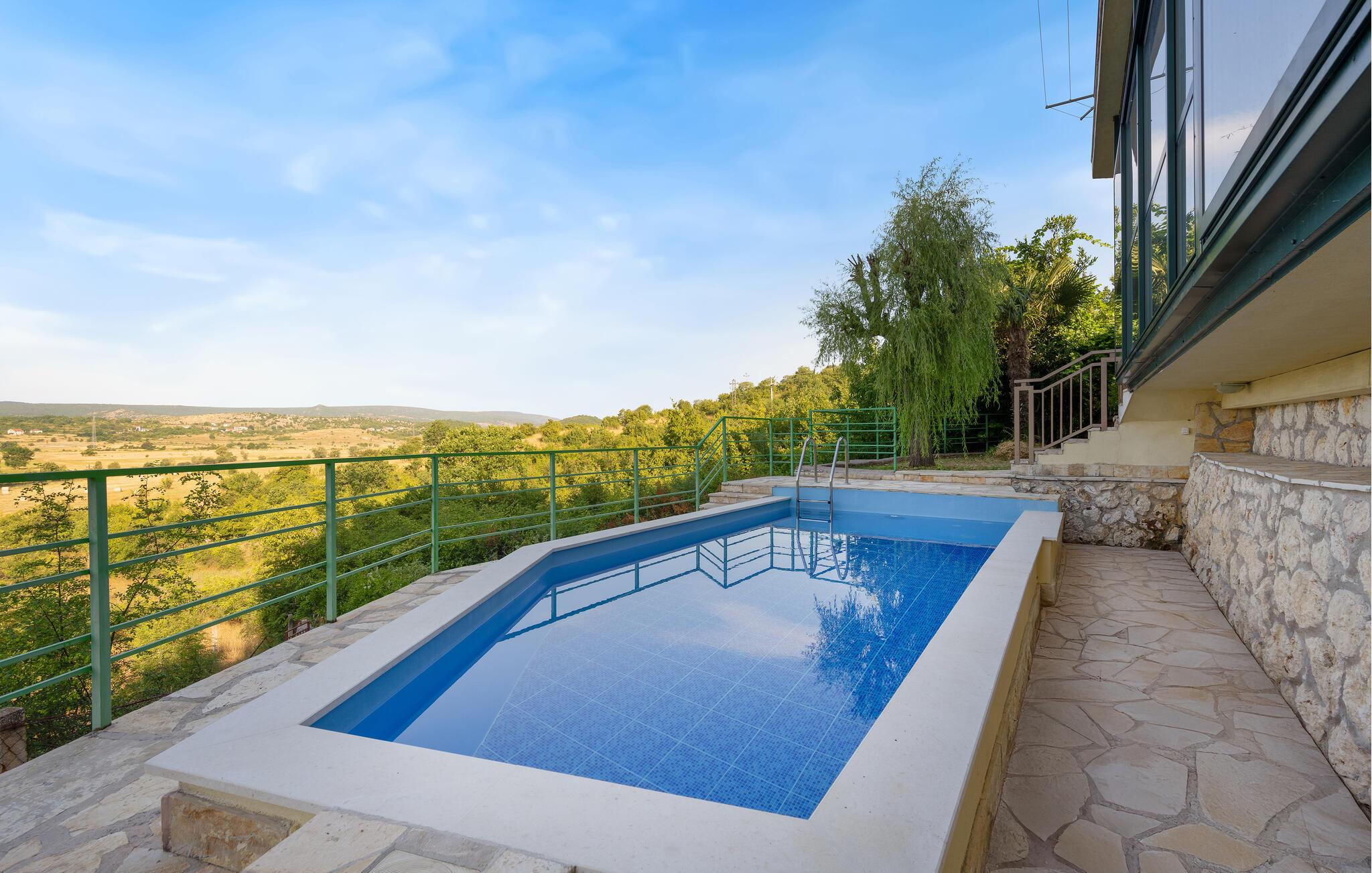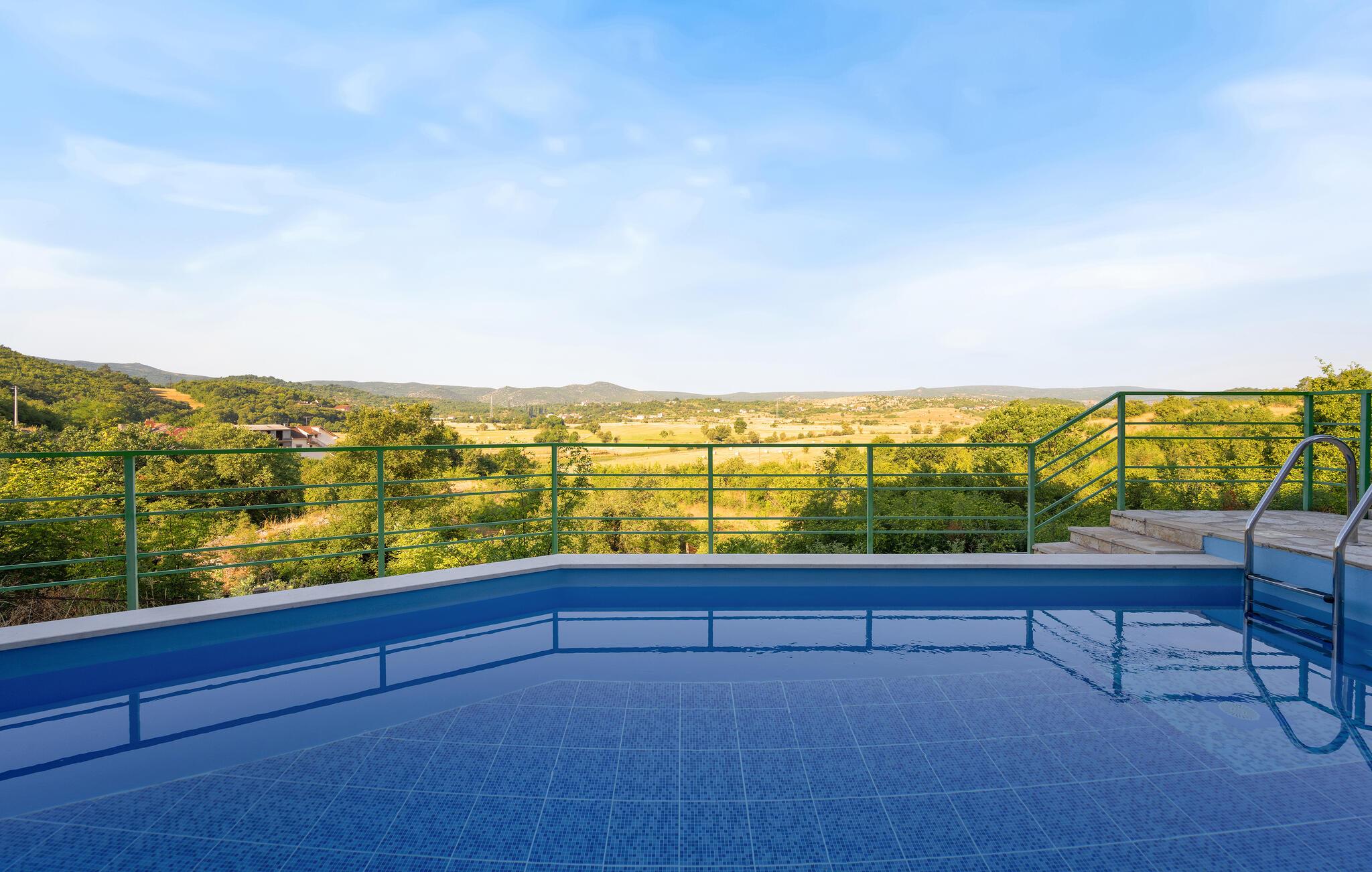 Dieses modern eingerichtete Ferienhaus befindet sich auf der Mirlovic-Ebene, an der Quelle des Flusses Cikola (min. Deckenhöhe im 2. Stock beträgt 170cm). Von zahlreichen Terrassen und Balkonen bietet sich ein atemberaubender Blick auf die Quelle und die natürliche Schönheit des Ortes. In den Monaten Mai und Oktober beginnt das Wasser aus der Quelle zu fließen und dieses Phänomen kann man von der Terrasse des Hauses bewundern. Der Fluss trocknet den Sommer über aus. Das Haus ist mit allem ausgestattet, was man für einen angenehmen Urlaub benötigt. Es gibt auch eine Sauna, wo Sie sich entspannen können und die Sorgen des Alltags vergessen. Auf dem eingezäunten Grundstück befinden sich ein großer Grill, wo Sie Leckereien zubereiten können und auch ein Pool, der die nötige Erfrischung bringen wird. Sie sollten es nicht verpassen einen Rundgang durch den Ort zu machen, da er eine Menge von Naturphänomenen und eine schöne Landschaft hat. Wir empfehlen auch Ausflüge in die interessanten Städte Sibenik, Split und Zadar, die kulturelle und wirtschaftliche Zentren der Regionen sind.