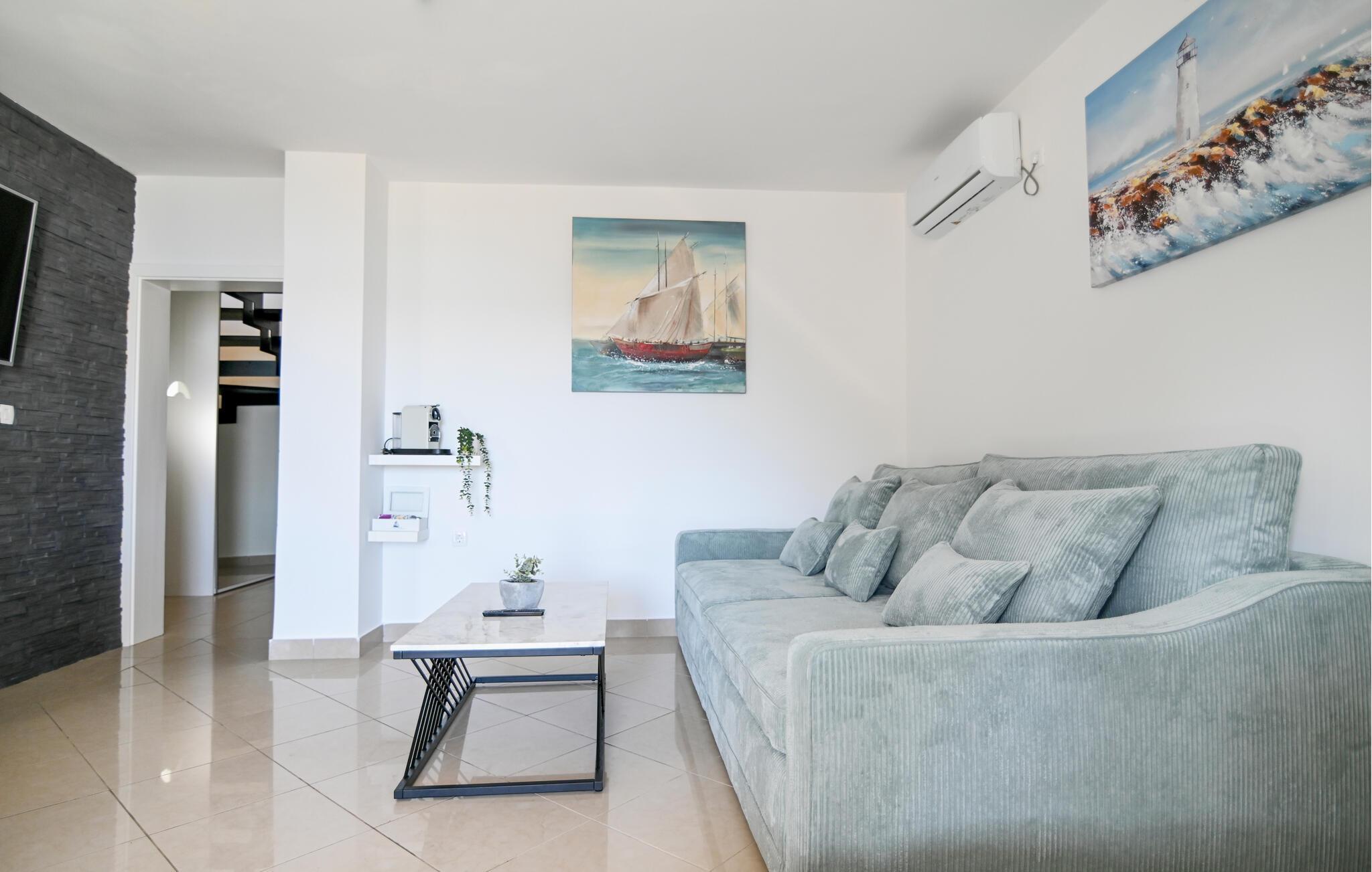 Dieses schöne Ferienhaus ist für einen unvergesslichen Urlaub mit Ihrer Familie oder Freunden konzipiert. Im Erdgeschoss befindet sich ein Raum und ein geräumiges Wohnzimmer, das zu einer überdachten Terrasse führt. Im Obergeschoss befinden sich drei Schlafzimmer, von denen zwei Zugang zur höchsten Terrasse haben. Dort gibt es einen Whirlpool, in dem Sie entspannende Momente verbringen und wie bei anderen Terrassen einen wunderschönen Panoramablick auf das Meer und die benachbarten Inseln genießen können.