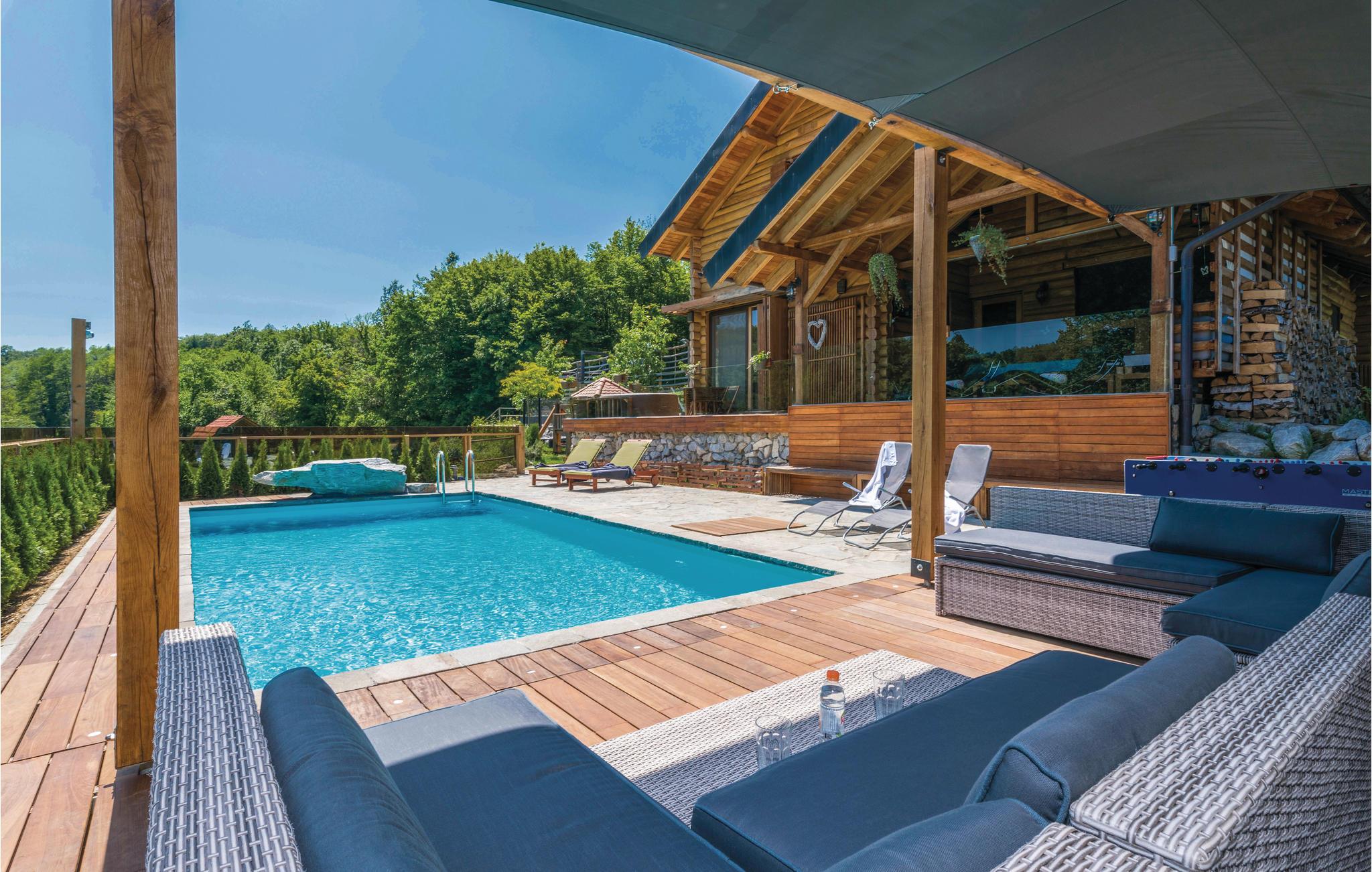 Schönes Holzferienhaus in idyllischer Lage am Ufer des Flusses Mreznica. Die Innenräume sind für einen angenehmen Aufenthalt sorgfältig eingerichtet. Im Erdgeschoss befinden sich das Wohnzimmer mit Kamin, ein Esszimmer und die moderne Küche. Das Wohnzimmer öffnet sich auf die Terrasse mit Blick auf den Fluss Mrežnica und die schöne Landschaft. Auf der Terrasse steht ein Jacuzzi für zusätzliche Entspannung zur Verfügung. Das Grundstück hat einen großen Garten, Terrasse und Grill, und einen Basketballkorb und Ausstattung für Kinder. Für Aktivurlauber ist ein Ruderboot für Bootsfahrten auf dem Fluss oder Angeln verfügbar. In der Nähe gibt es die Möglichkeit, ein Fahrrad zu mieten, Tennis zu spielen, zu Reiten oder zum Schwimmen im Thermalbad. Ein idealer Ort für einen Urlaub, unabhängig von der Jahreszeit und Wetterbedingungen.