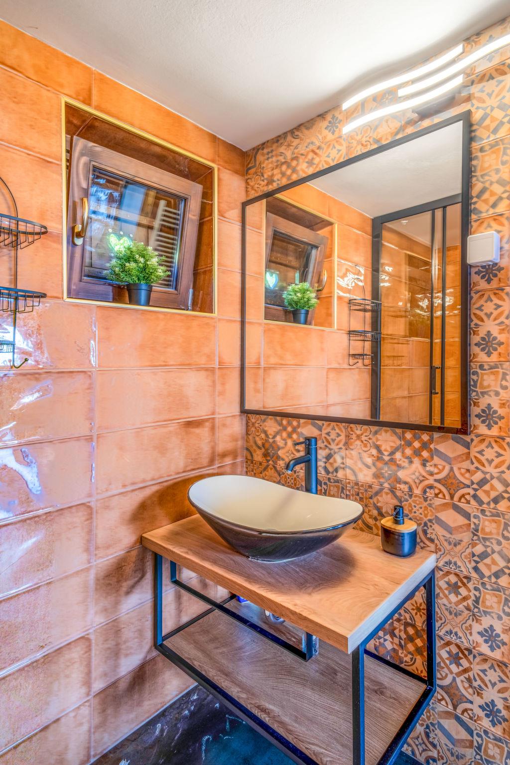 6-Zimmer-Haus 140 m2 auf 3 Stockwerken. Wohn-/Esszimmer mit Küchenblock und Sat-TV (Flachbildschirm), Holzofen. Wohn-/Esszimmer mit Küchenblock und Sat-TV. Offene Küche (4 Induktionskochplatten, Wasserkocher). 2 Duschen/WC. Unteres Geschoss: (Aussentreppe). Offene Küche (Backofen, Geschirrspüler, 4 Induktionskochplatten, Toaster, Wasserkocher, Mikrowelle, Tiefkühler, elektrische Kaffeemaschine). Dachgeschoss: Eingang mit Klimaanlage. 1 Zimmer, Deckenhöhe 80 - 230 cm mit 2 Betten (80 cm, Länge 200 cm). 1 Zimmer, Deckenhöhe 80 - 230 cm mit 2 Betten (80 cm, Länge 200 cm), 1 franz. Bett (160 cm, Länge 200 cm). Ausgang zum Balkon. Eingang mit Klimaanlage. 1 Zimmer mit 3 Betten (80 cm, Länge 200 cm) mit 1 Bett (90 cm, Länge 200 cm), 1 franz. Bett (160 cm, Länge 200 cm). Ausgang zum Balkon. Dusche/WC, sep. WC. Heizung. Balkon 7 m2, Balkon 3 m2, Terrasse 20 m2, überdacht. Terrassenmöbel, Balkonmöbel. Schöne Sicht auf die Berge und die Ortschaft. Zur Verfügung: Waschmaschine, Bügeleisen, Fliegengitter, Kinderhochstuhl, Babybett, Haartrockner. Internet (WLAN, gratis). Bitte beachten: Nichtraucher-Haus. Feuerlöscher. Das erste Haus besteht aus einem Wohn-/Esszimmer, einer offenen Küche im Erdgeschoss, einer zweiten Küche im unteren Geschoss und 2 Schlafzimmern im Dachgeschoss. Das zweite Haus besteht aus einem Wohn-/Esszimmer, einer offenen Küche im Erdgeschoss und 2 Schlafzimmern im Dachgeschoss.