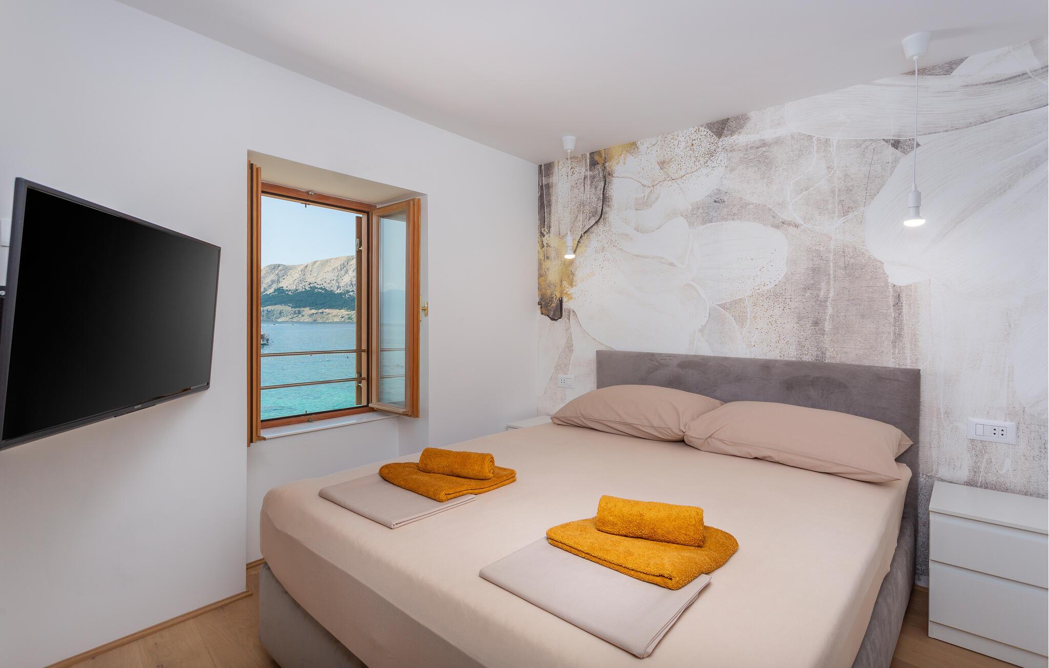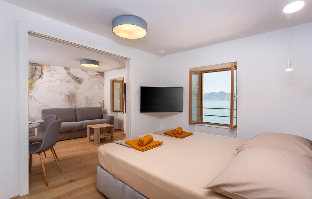 Direkt am Meer in Baska auf der Insel Krk bietet Ihnen dieses wunderschöne Apartment den Luxus eines privaten Zugangs vom Haus zum Strand, sodass Sie jederzeit das kristallklare Wasser und die malerische Küste genießen können. Ideal für Paare oder Paare mit kleinen Kindern bieten diese Apartments eine perfekte Mischung aus Komfort und Bequemlichkeit. Die Wohnung befindet sich in einer ruhigen Fußgängerzone, wodurch Sie eine entspannte und autofreie Umgebung genießen können. Die Lage der Apartments ist perfekt, um die lokale Atmosphäre und die Annehmlichkeiten von Baska zu erleben.