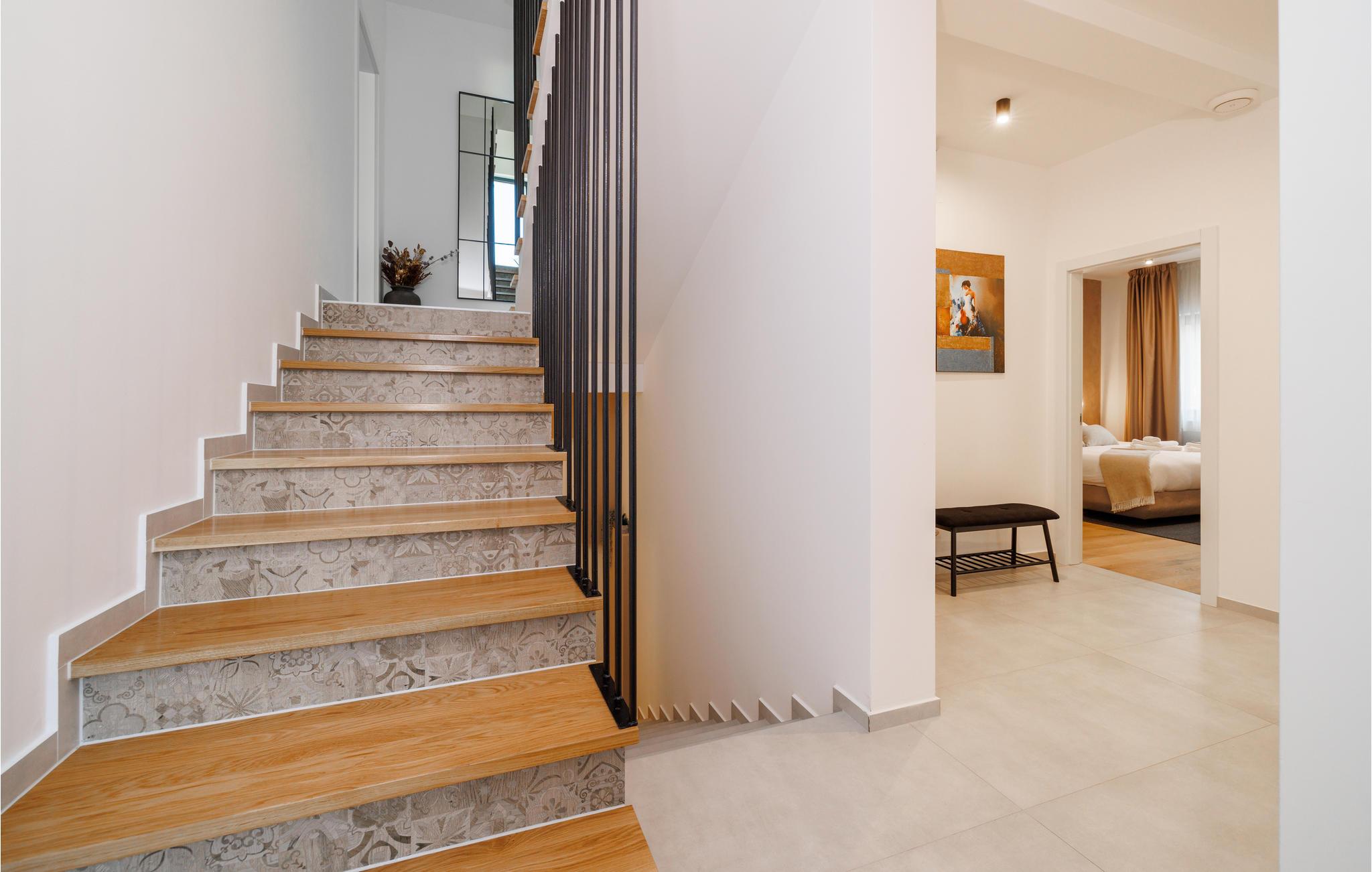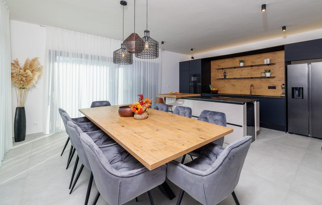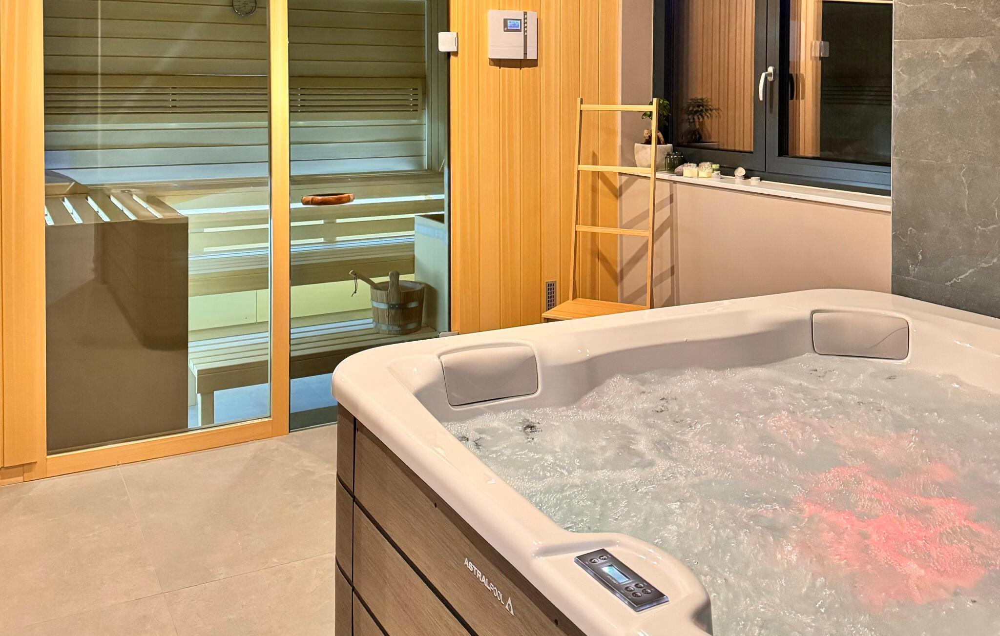 Umgeben von Natur empfängt Sie dieses geräumige und moderne Ferienhaus im traditionellen Baustil. Das große Haus bietet Ihnen auf mehreren Ebenen Komfort, schönes Design, hochwertige Möbel und viel Platz, um Ihrer Lieblingsbeschäftigung nachzugehen. Kochen Sie in der modernen und voll ausgestatteten Küche, entspannen in diesen geschmackvollen Schlafzimmern. In zwei Schlafzimmern gibt es neben dem Doppelbett eine kleine Galerie mit einem Bett für eine Person, sodass kleine Familien hier den idealen Ort zum Übernachten finden. Baden können sowohl im Pool im Haus als auch im Swimmingpool im Garten. Wellnessstunden versprechen Ihnen ebenfalls der Whirlpool im Haus sowie die Sauna, wo Sie Ihren Alltagstress ausschwitzen können. Genießen Sie bei Ihren Grillabenden die schöne Naturumgebung und planen Ihre Ausflüge für den nächsten Tag.