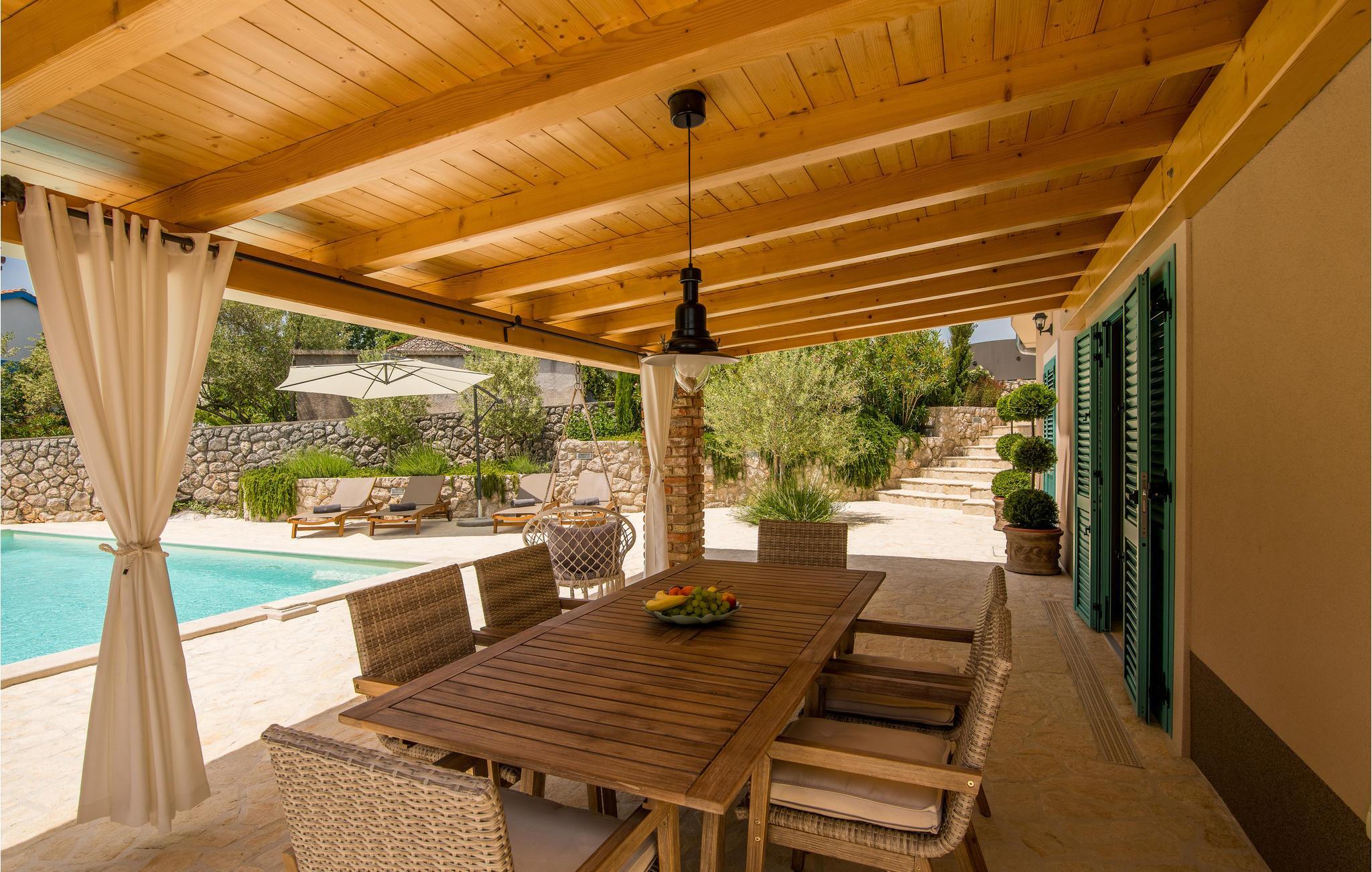 Dieses schöne traditionelle Steinhaus liegt im kleinen Dorf Polje auf der Insel Krk. Dieses komplett eingezäunte Grundstück, mit viel Grün, wird Ihre Familie und Haustier bestimmt genießen. Im Pool vor dem Haus können Sie sich an heißen Sommertagen erfrischen. Das Haus besteht aus zwei Wohneinheiten im Erdgeschoss und dem ersten Stock, die mit Außentreppen verbunden sind. Mit dem Auto erreichen Sie schnell die Strände in Šilo, Cižici, sowie den Strand mit Heilschlamm in Klimno. Besuchen Sie auch die Ortschaft Vrbnik, mit vielen Weinkellern, da diese Region für Qualitätsweine und insbesondere für die Weinsorte Vrbnicka Žlahtina bekannt ist.
