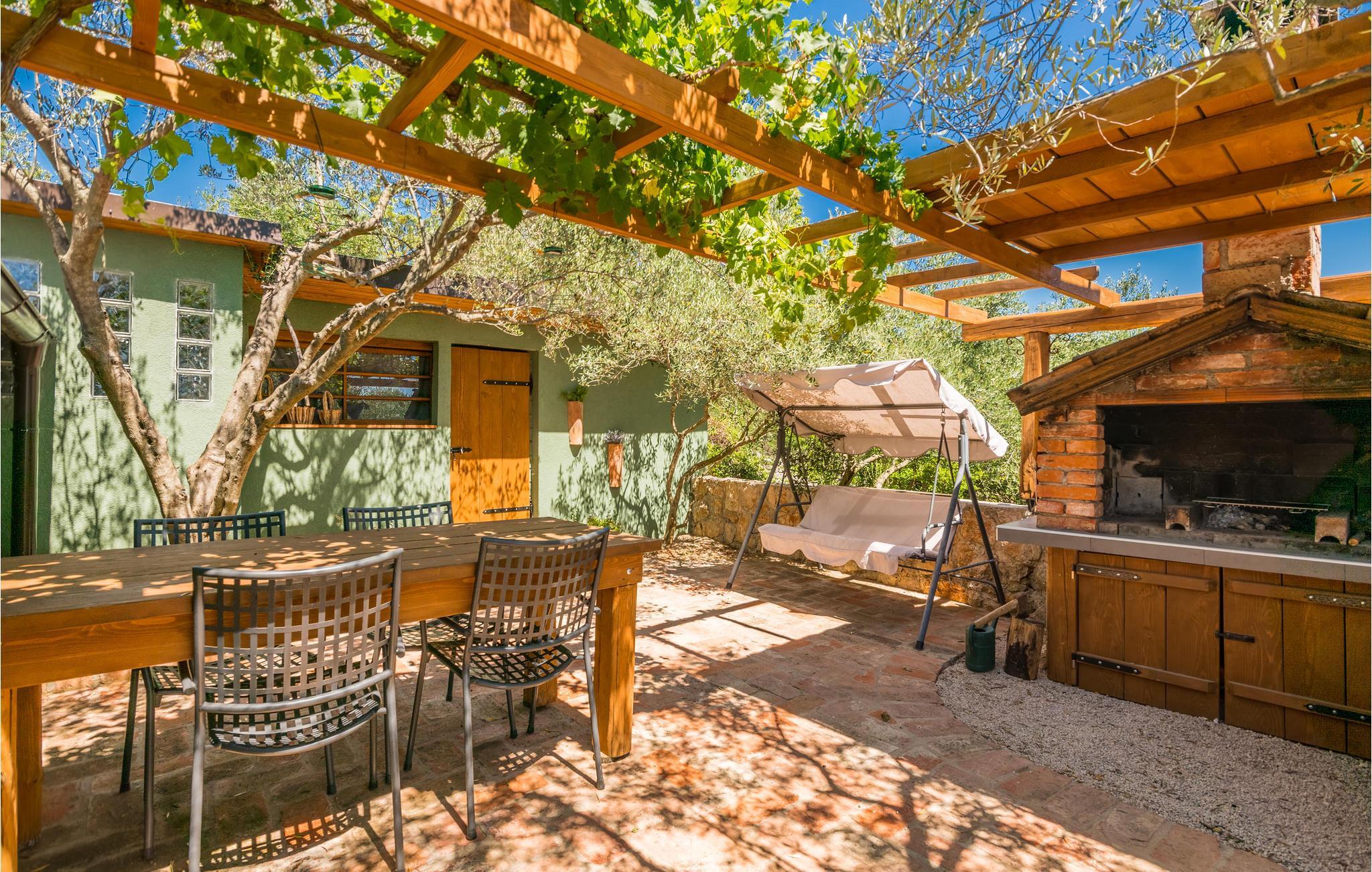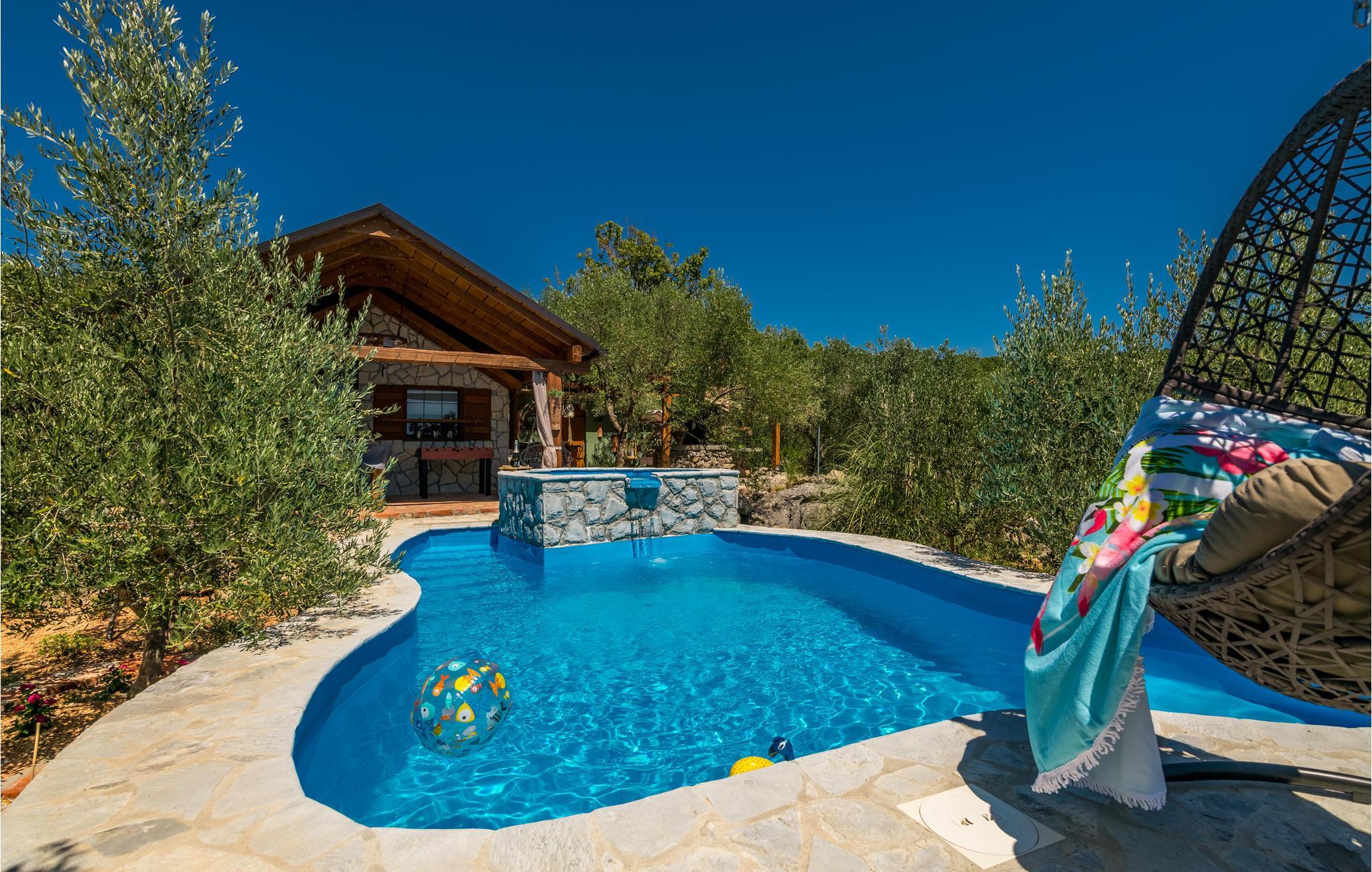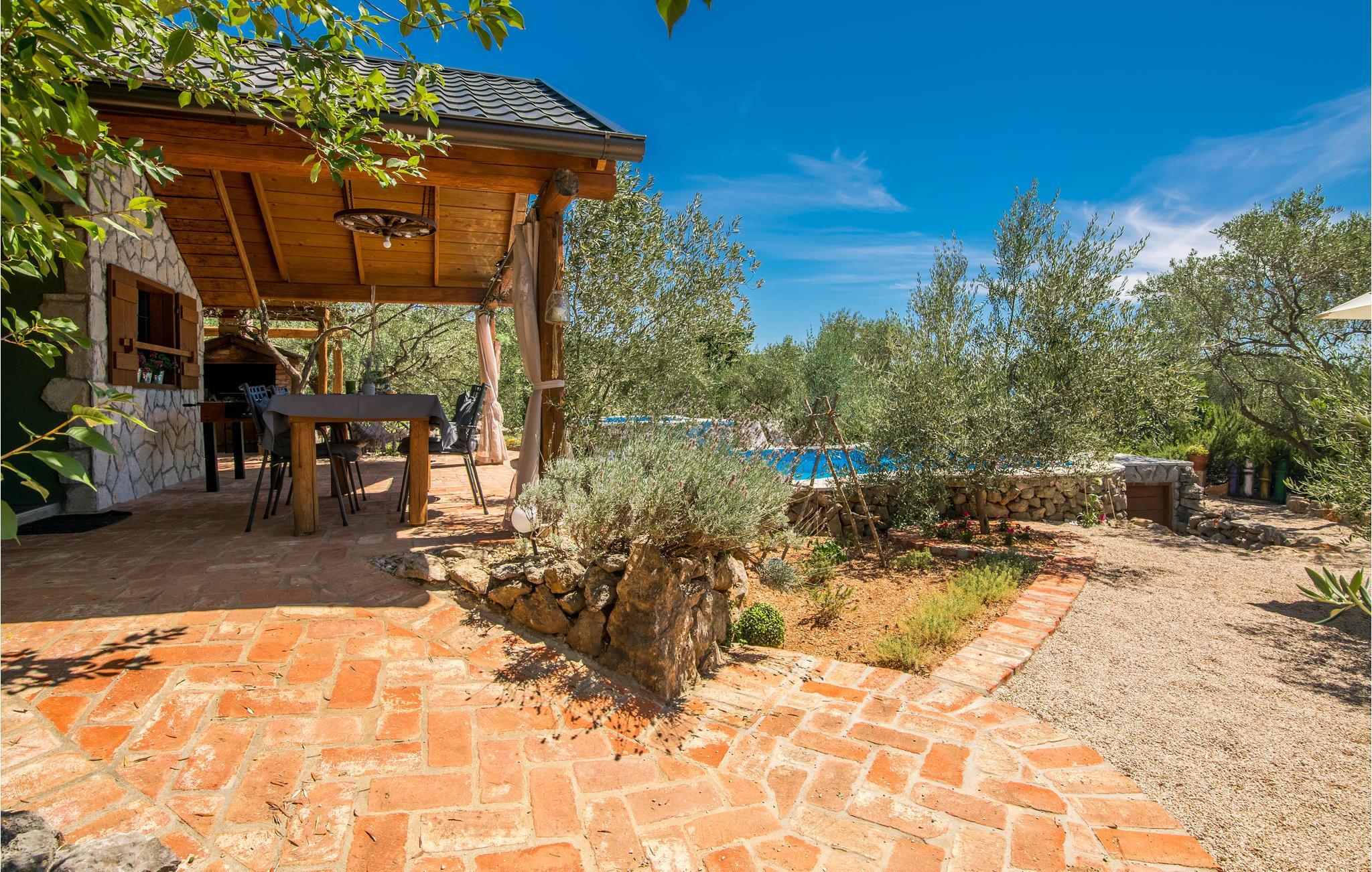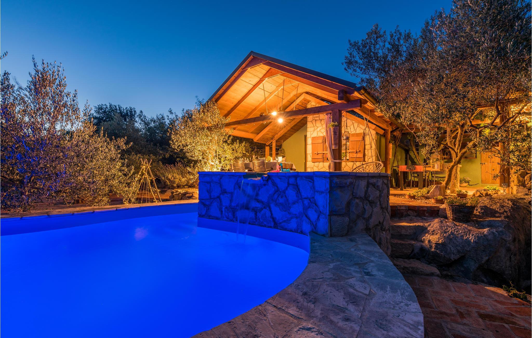 Sichtgeschützt durch Olivenbäume und die herrliche Natur liegt dieser Ferienbungalow im Ort Punat auf der Insel Krk. Er ist mit viel Liebe eingerichtet und reich an Details, so dass Sie sich wie daheim fühlen werden. Das gemütliche Interieur und der herrlich grüne Außenbereich bieten Ihnen den idealen Rahmen für einen perfekten Urlaub. Entspannen Sie sich auf den Sonnenliegen am Pool oder bereiten Sie auf der Terrasse mit Grill köstliche Gerichte für Ihre Familie zu. Das Grundstück ist umzäunt und es sind auch Spielgeräte für Kinder vorhanden. Für Radfahrer ist diese Insel ein ideales Reiseziel und am Strand Dunat in der Nähe können Sie sich am Wasserski-Lift, beim Segeln, Surfen oder Beach-Volleyball vergnügen. Die Restaurants bieten Ihnen ein hervorragendes gastronomisches Angebot und zu den Meeresspezialitäten passt am besten die lokale Weinsorte von Krk „Vrbovacka Zlahtina“, ein exzellenter trockener Qualitätswein.