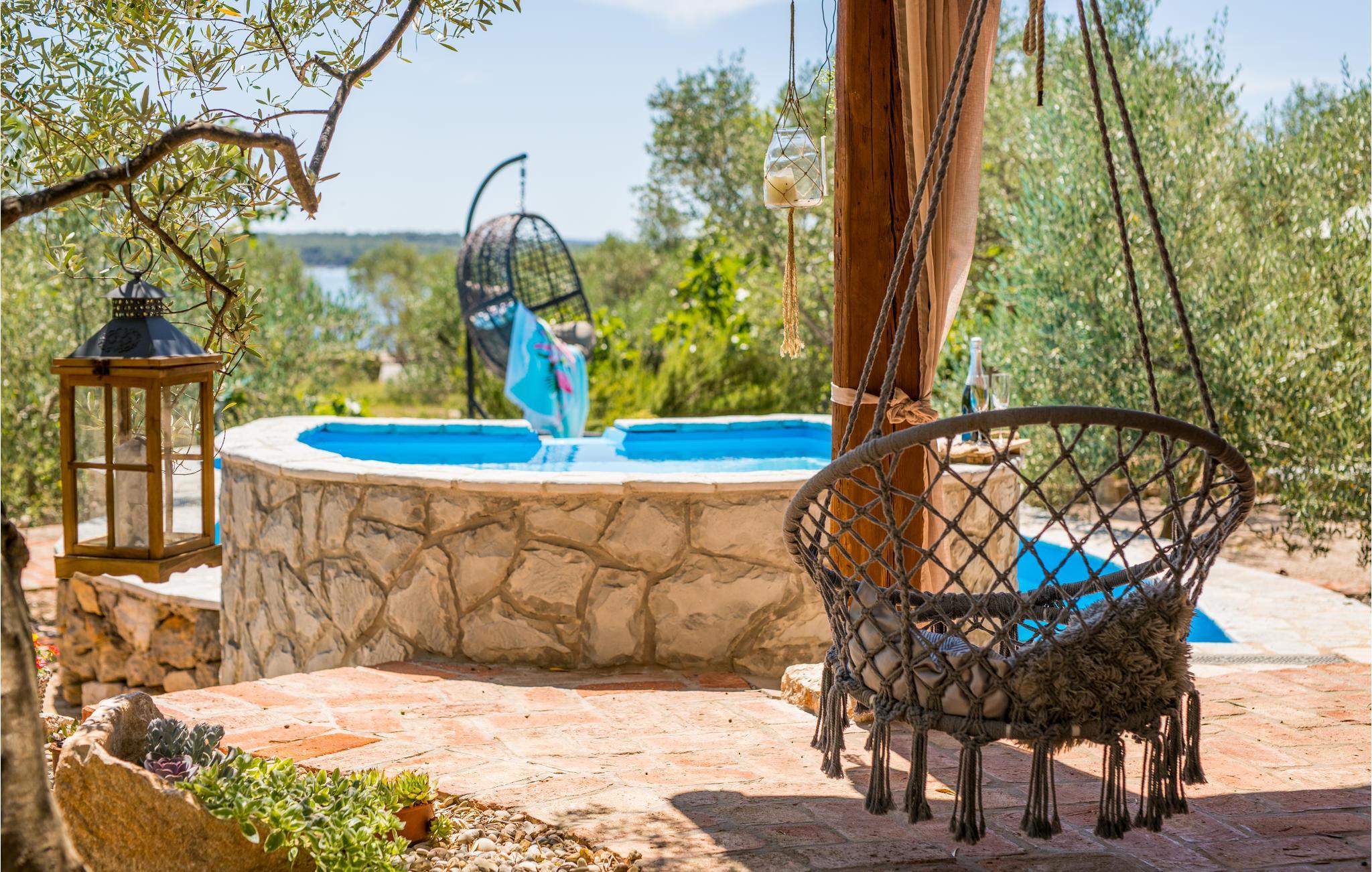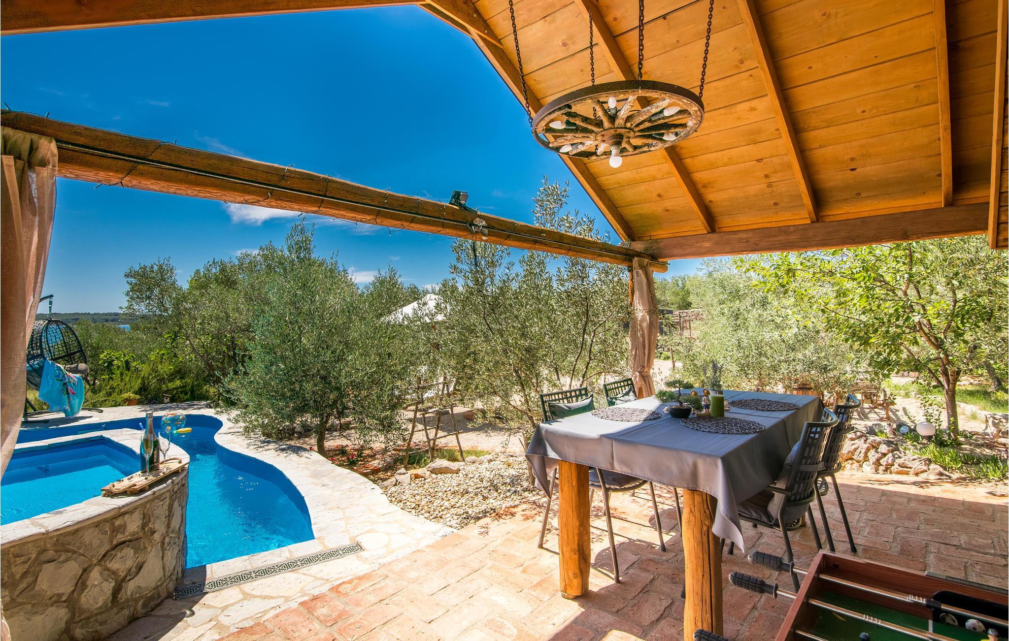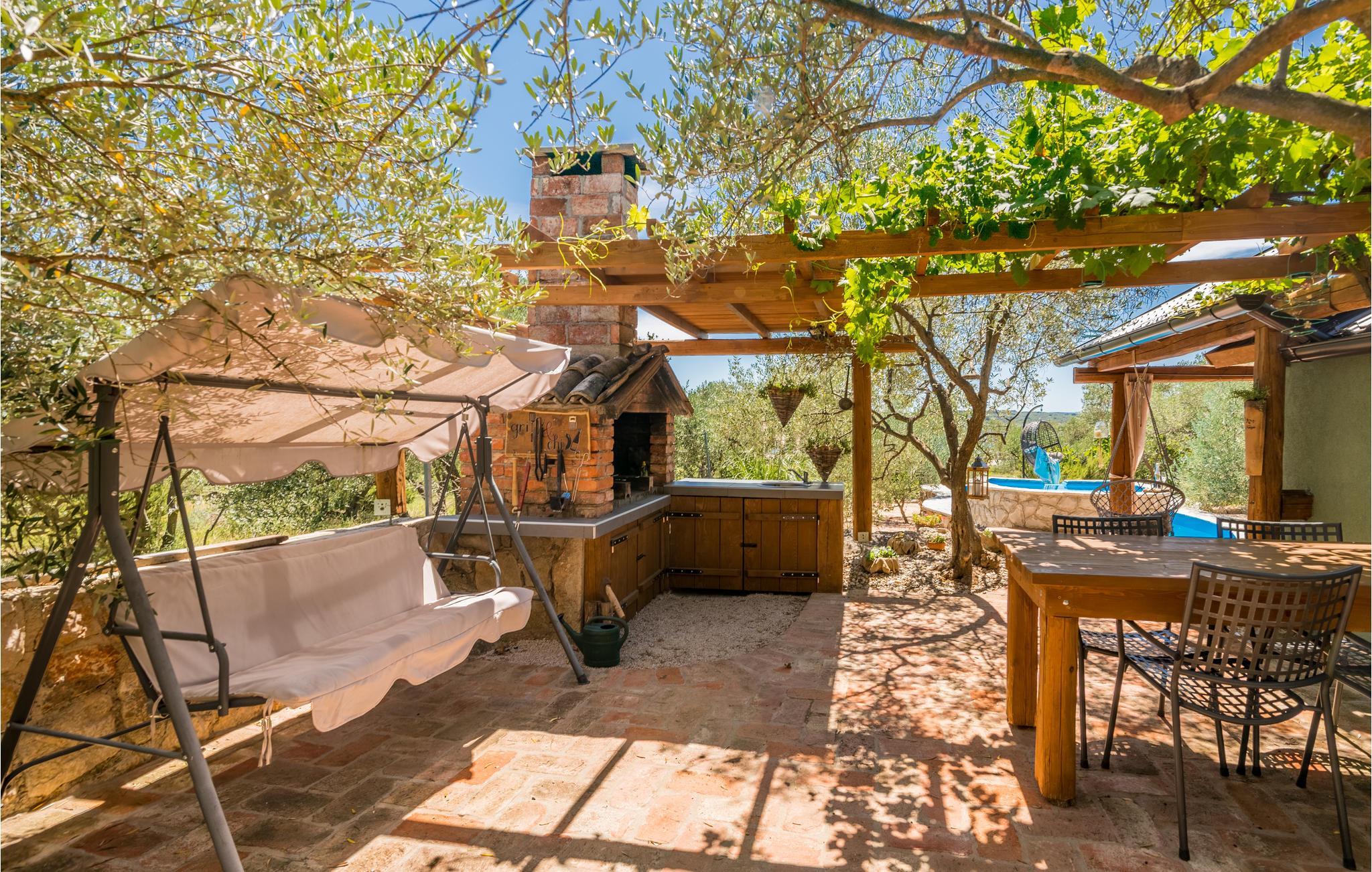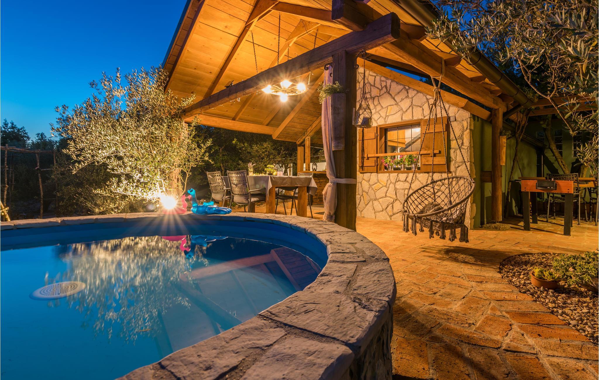 Sichtgeschützt durch Olivenbäume und die herrliche Natur liegt dieser Ferienbungalow im Ort Punat auf der Insel Krk. Er ist mit viel Liebe eingerichtet und reich an Details, so dass Sie sich wie daheim fühlen werden. Das gemütliche Interieur und der herrlich grüne Außenbereich bieten Ihnen den idealen Rahmen für einen perfekten Urlaub. Entspannen Sie sich auf den Sonnenliegen am Pool oder bereiten Sie auf der Terrasse mit Grill köstliche Gerichte für Ihre Familie zu. Das Grundstück ist umzäunt und es sind auch Spielgeräte für Kinder vorhanden. Für Radfahrer ist diese Insel ein ideales Reiseziel und am Strand Dunat in der Nähe können Sie sich am Wasserski-Lift, beim Segeln, Surfen oder Beach-Volleyball vergnügen. Die Restaurants bieten Ihnen ein hervorragendes gastronomisches Angebot und zu den Meeresspezialitäten passt am besten die lokale Weinsorte von Krk „Vrbovacka Zlahtina“, ein exzellenter trockener Qualitätswein.