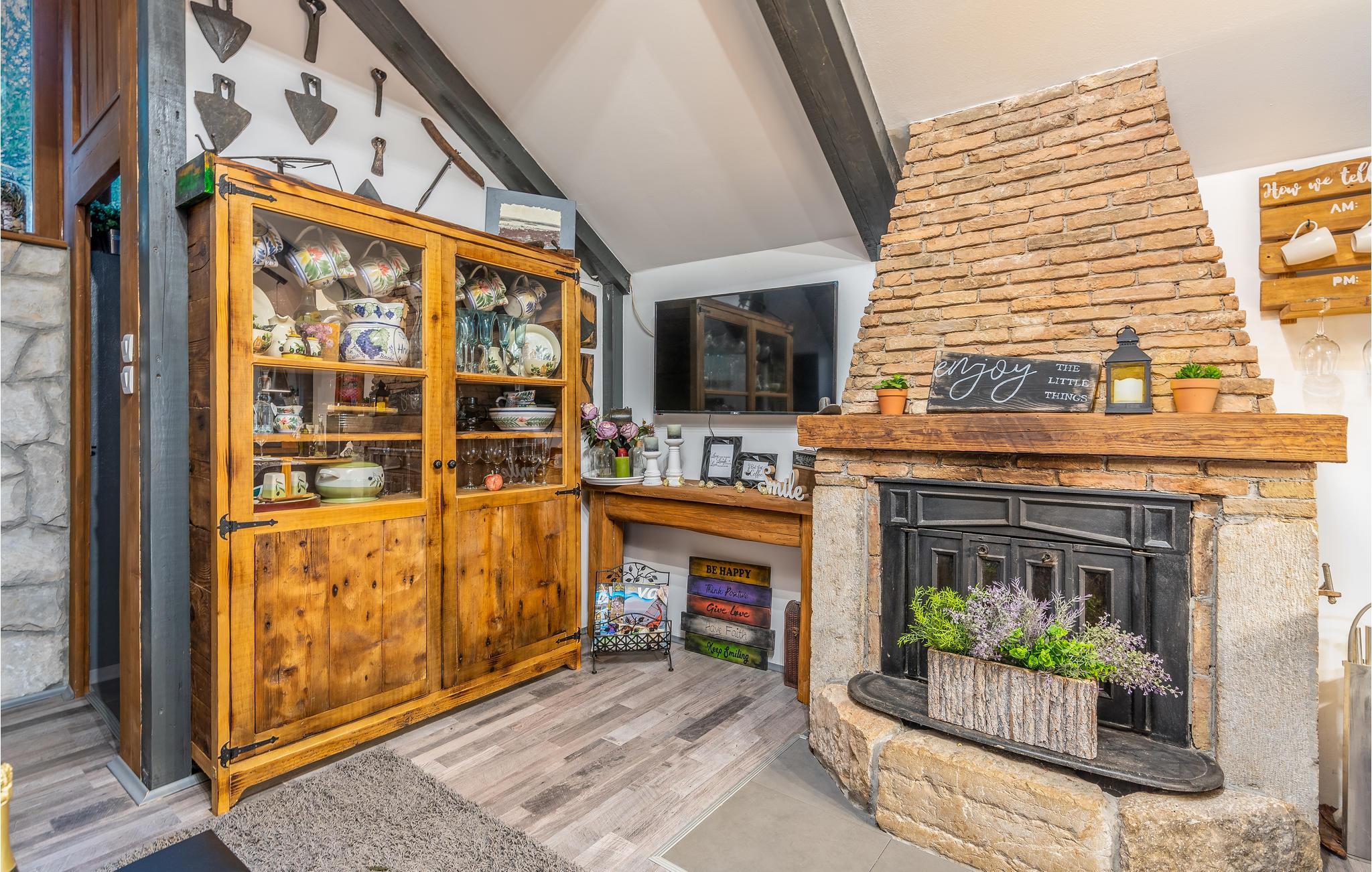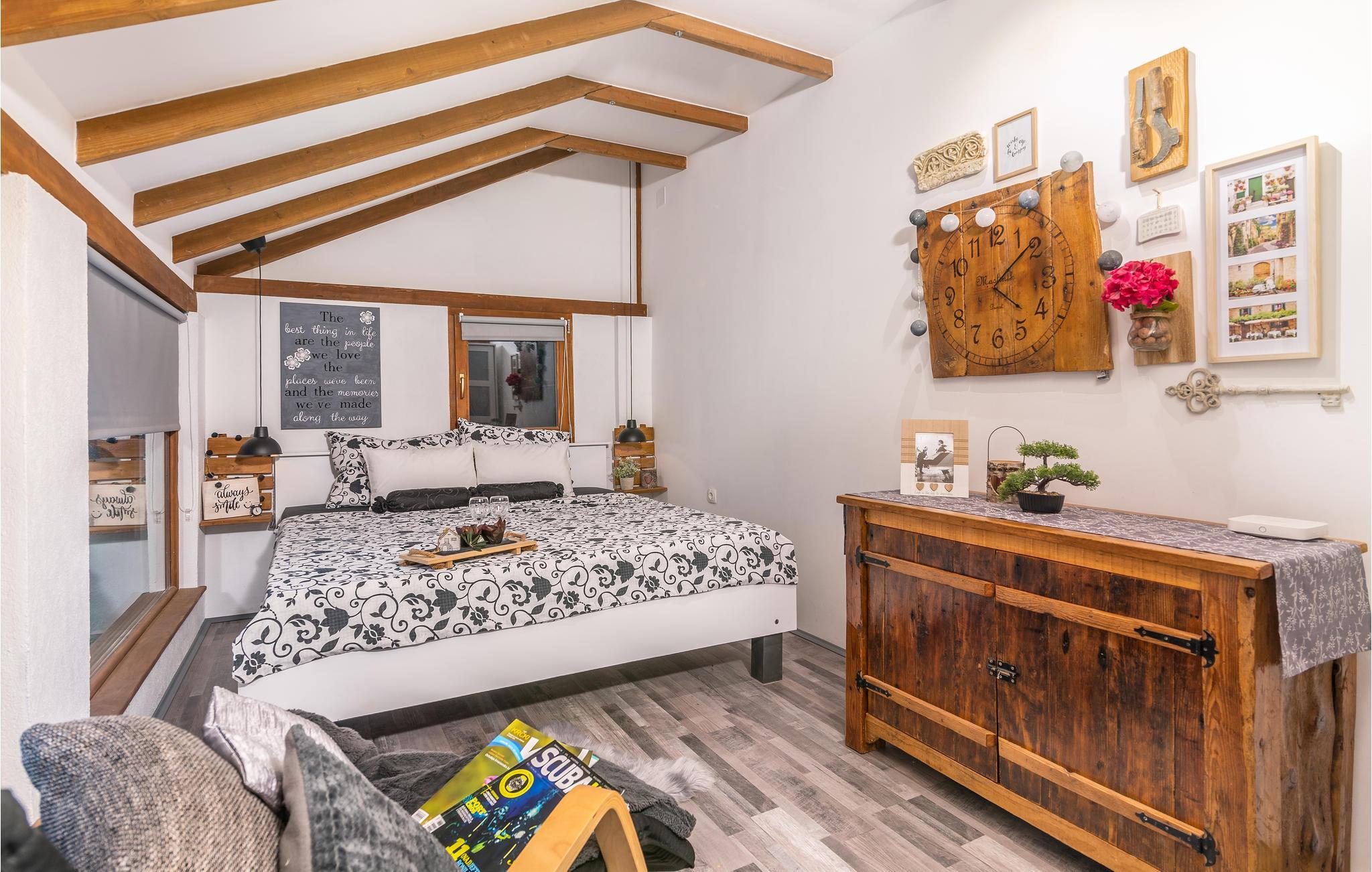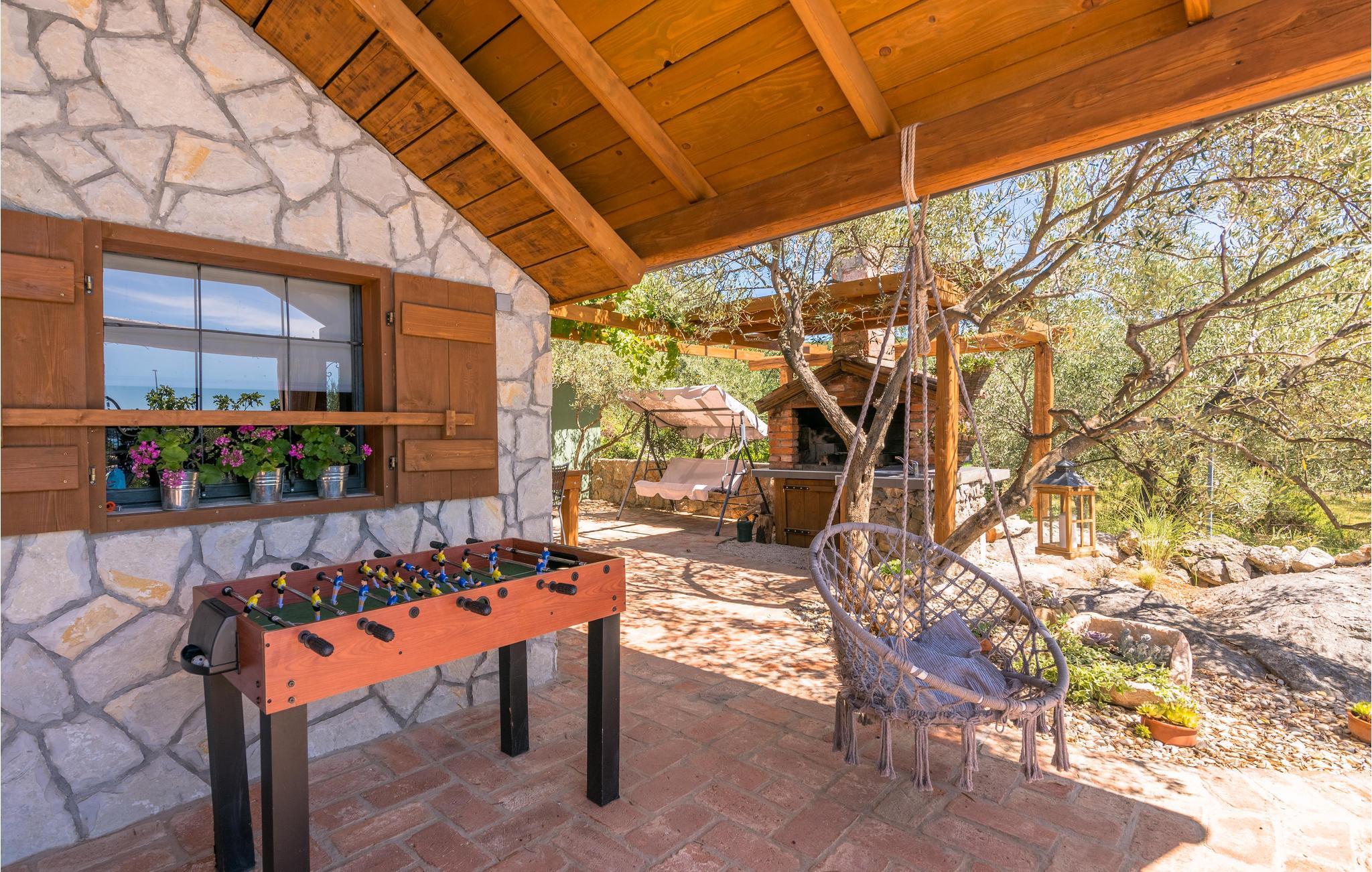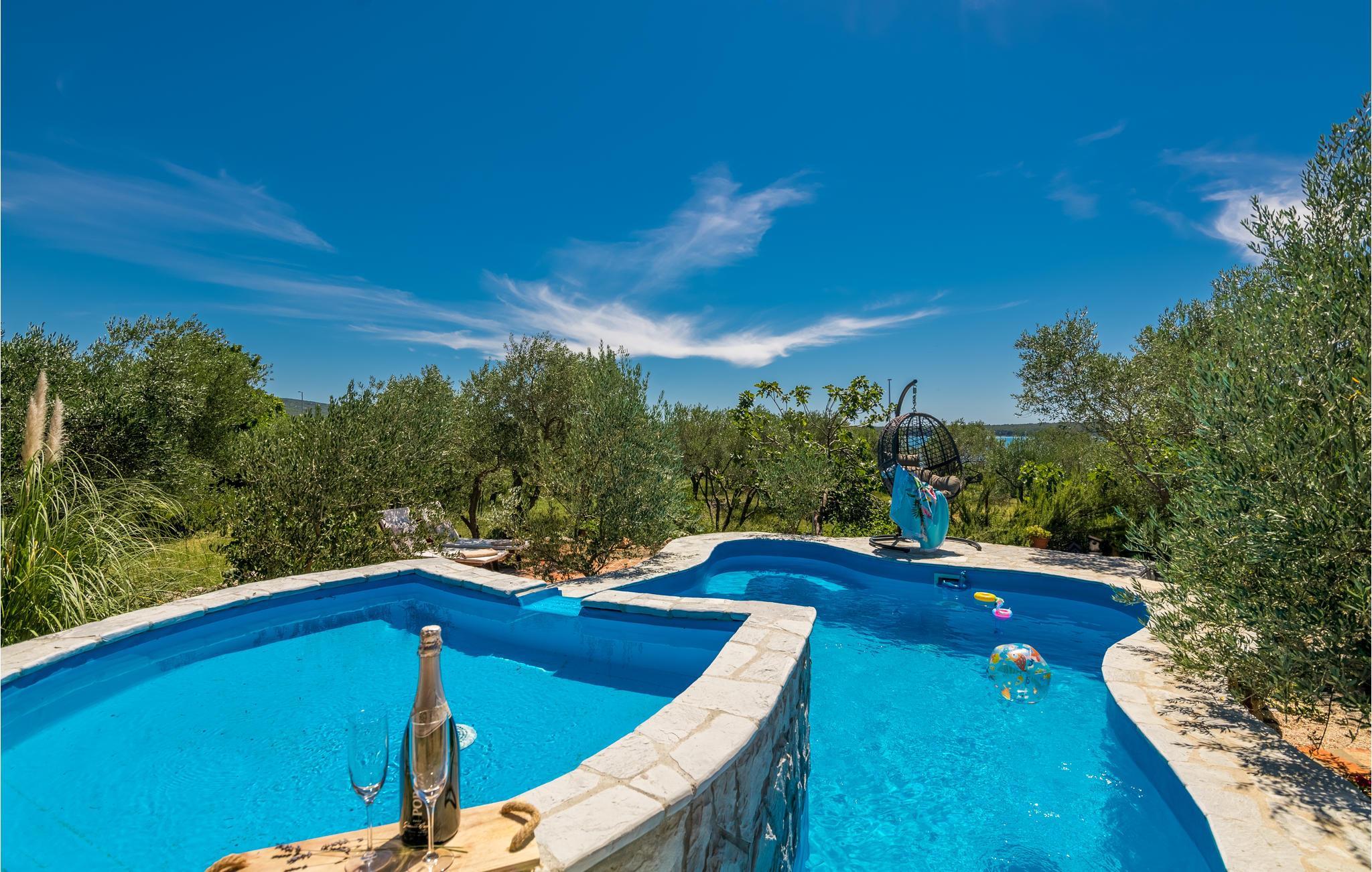 Sichtgeschützt durch Olivenbäume und die herrliche Natur liegt dieser Ferienbungalow im Ort Punat auf der Insel Krk. Er ist mit viel Liebe eingerichtet und reich an Details, so dass Sie sich wie daheim fühlen werden. Das gemütliche Interieur und der herrlich grüne Außenbereich bieten Ihnen den idealen Rahmen für einen perfekten Urlaub. Entspannen Sie sich auf den Sonnenliegen am Pool oder bereiten Sie auf der Terrasse mit Grill köstliche Gerichte für Ihre Familie zu. Das Grundstück ist umzäunt und es sind auch Spielgeräte für Kinder vorhanden. Für Radfahrer ist diese Insel ein ideales Reiseziel und am Strand Dunat in der Nähe können Sie sich am Wasserski-Lift, beim Segeln, Surfen oder Beach-Volleyball vergnügen. Die Restaurants bieten Ihnen ein hervorragendes gastronomisches Angebot und zu den Meeresspezialitäten passt am besten die lokale Weinsorte von Krk „Vrbovacka Zlahtina“, ein exzellenter trockener Qualitätswein.