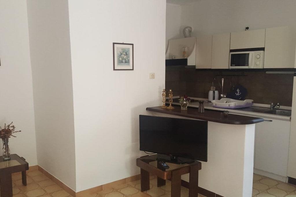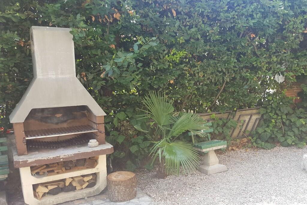 Parterre: (Wohn/Esszimmer(, TV, Esstisch, Herd, Klimaanlage), Schlafzimmer(, , Doppelbett king size), Badezimmer(, Toilette, Dusche, Waschbecken, Bidet), Abstellraum(Trockenschrank)) , , Terrasse(, Gartenmöbel, Liegen), Garten(Zentraler Grill), Parkplatz, Trockenschrank