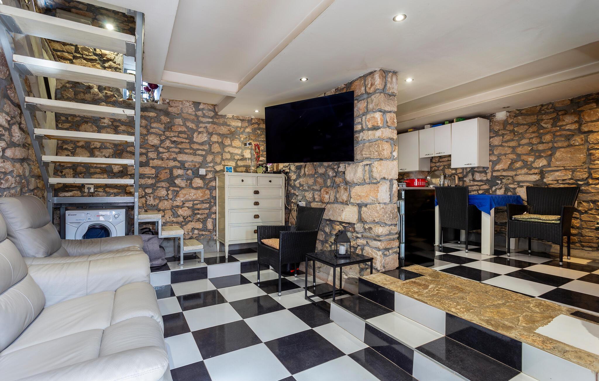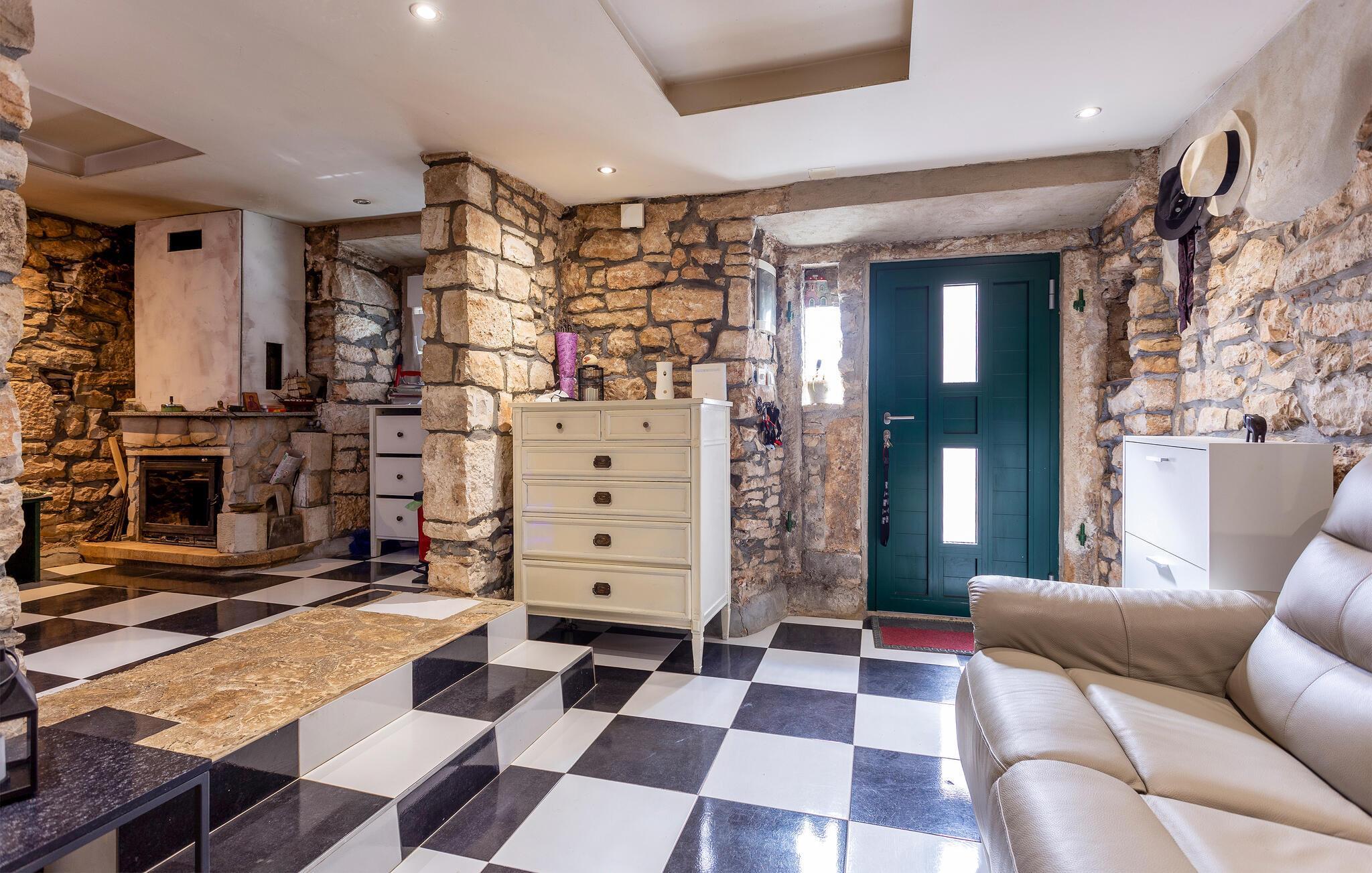In diesem gemütlichen und rustikalen Ferienhaus können Sie einen entspannten Urlaub in authentischer Umgebung genießen. Drinnen erwartet Sie eine warme Atmosphäre mit sichtbaren Stein Details und einem Kamin im offenen Wohnküchenbereich, der eine einladende Stimmung für gemütliche Momente und gemeinsame Mahlzeiten schafft. Die rustikalen Details und die charmante Einrichtung vermitteln ein Gefühl von heimeliger Gemütlichkeit.