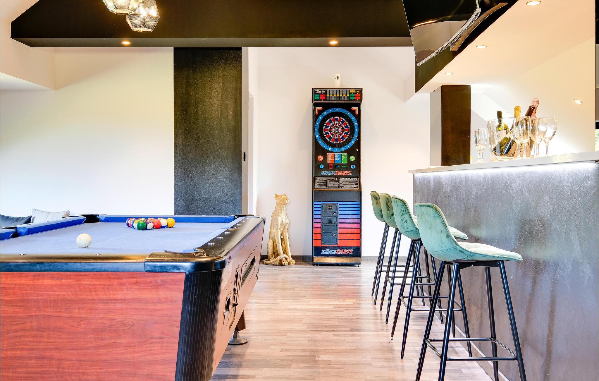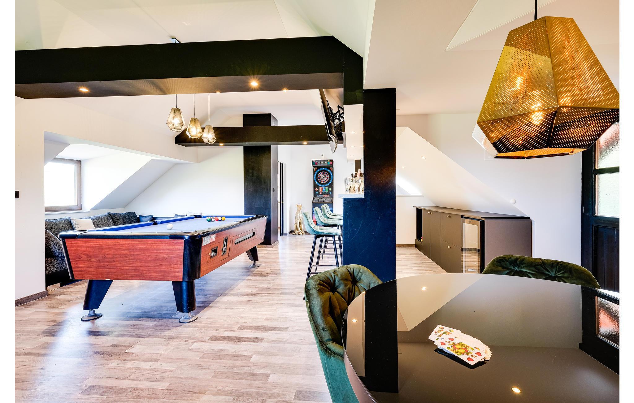 Verbringen Sie Ihren Familienurlaub in der Natur und diesem ansprechen Ferienhaus von hoher Qualität. Trauen Sie Augen, wenn Sie durch das Haus gehen und freuen sich über alle die Annehmlichkeiten und das hervorragende Design und die hochwertige Einrichtung, die hier auf Sie warten. Wählen Sie jeden Tag neu, ob Sie im Whirlpool im Freien, in der Sauna und im Fitnessraum entspannen oder Sie sich im Gemeinschaftsbereich mit Billard, Tischfußball und Piak vergnügen.