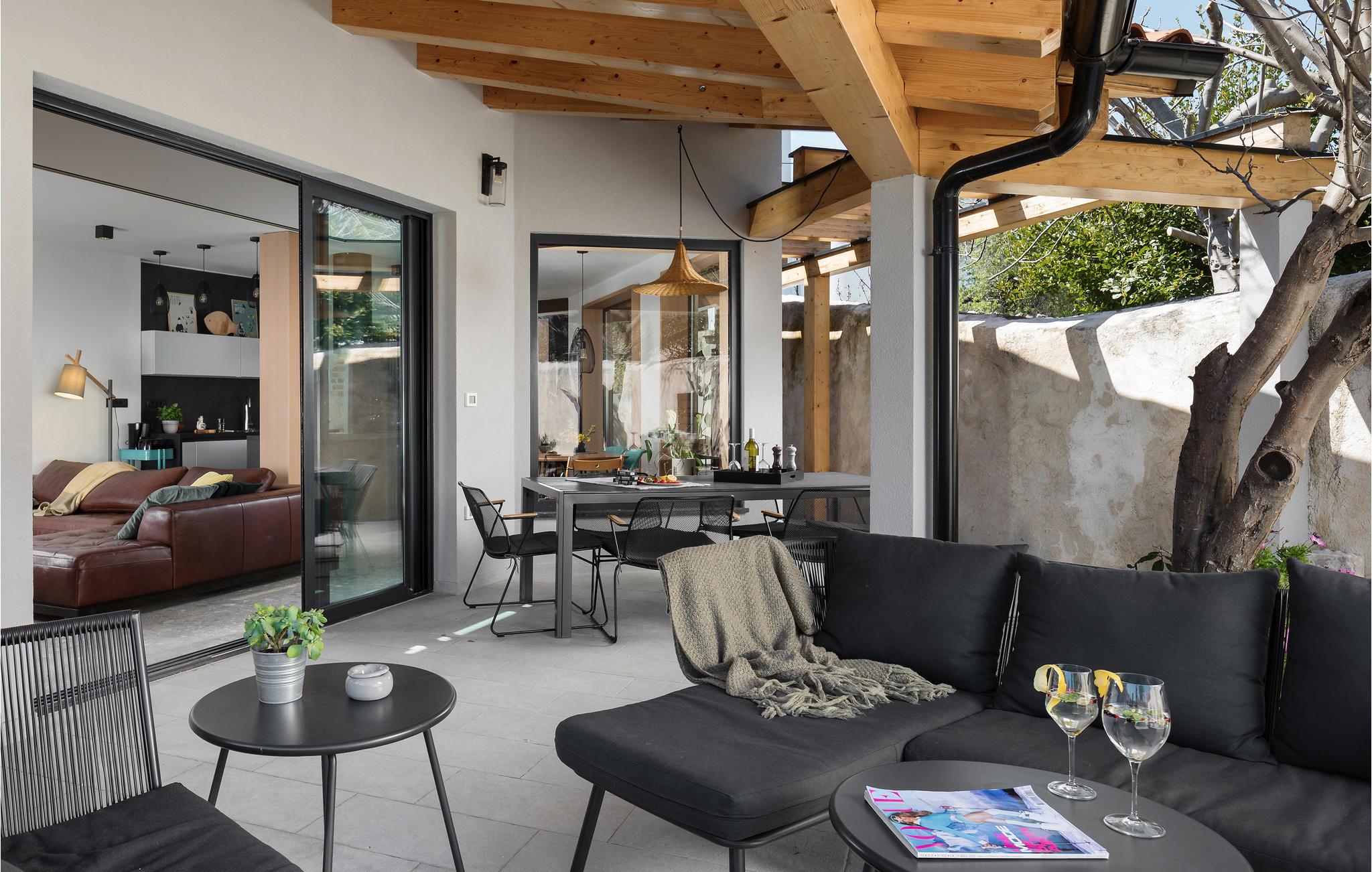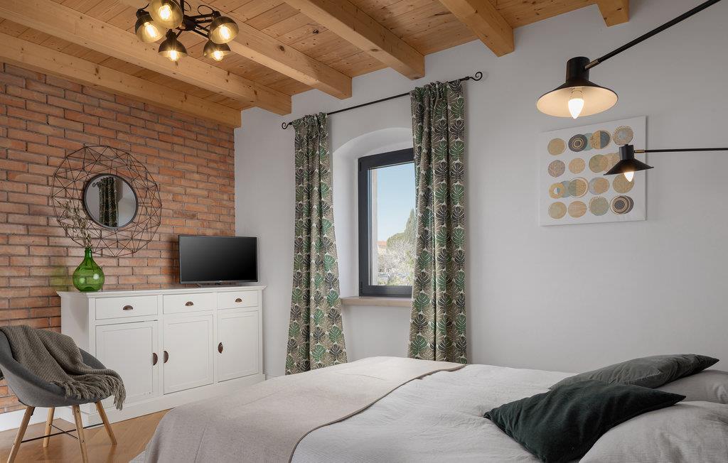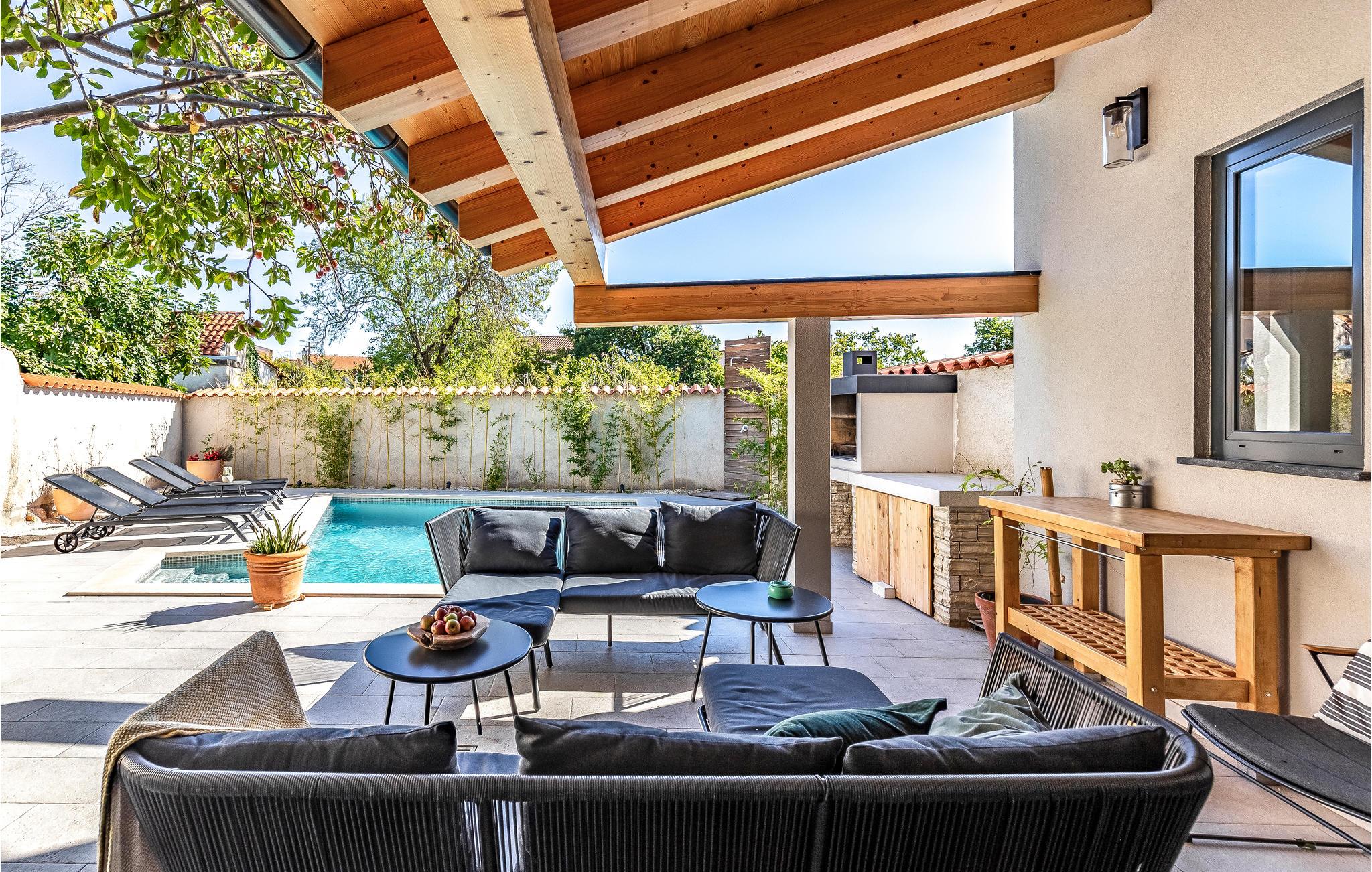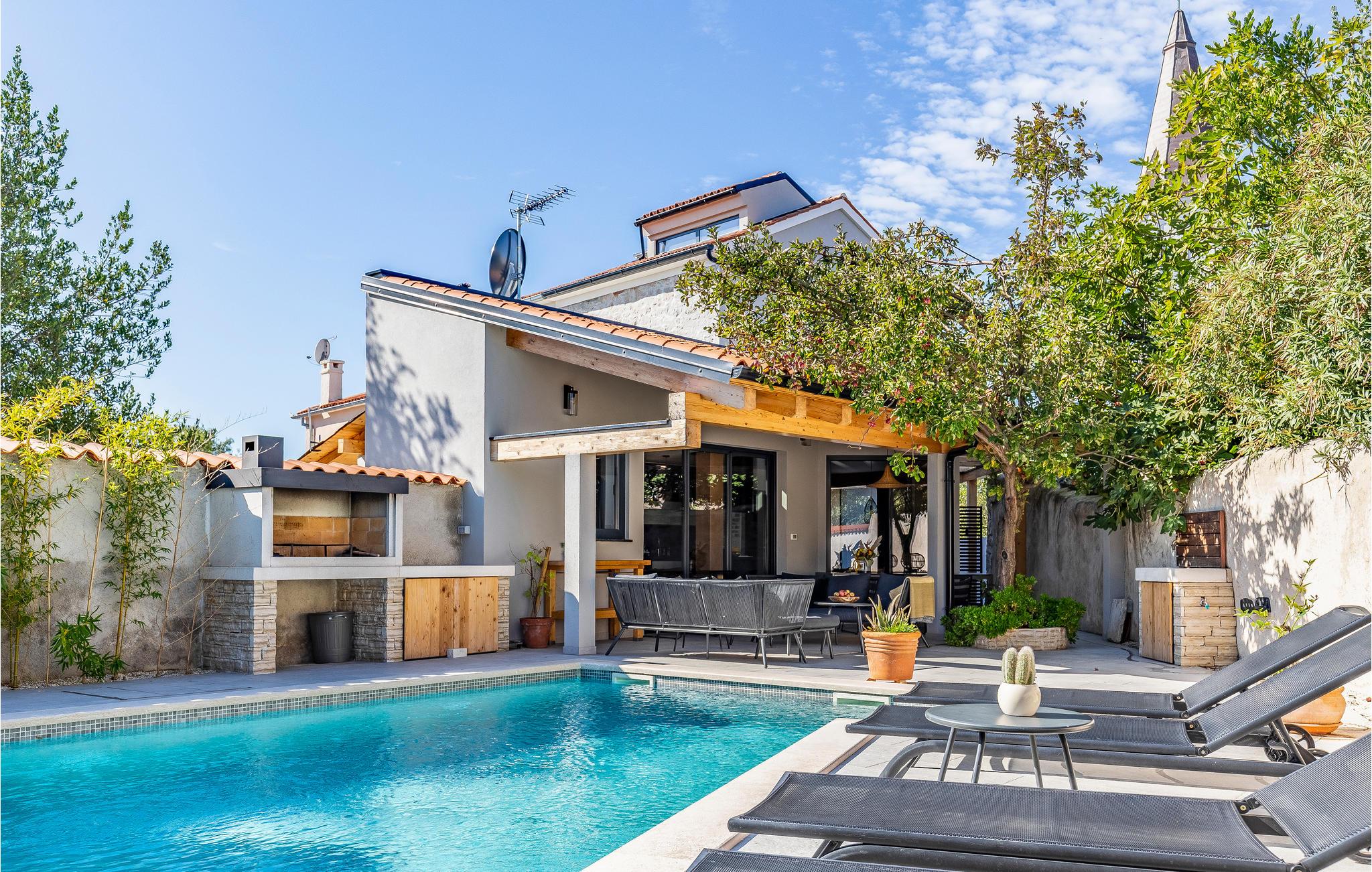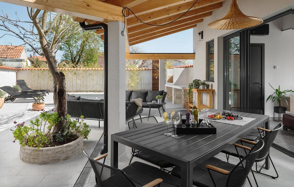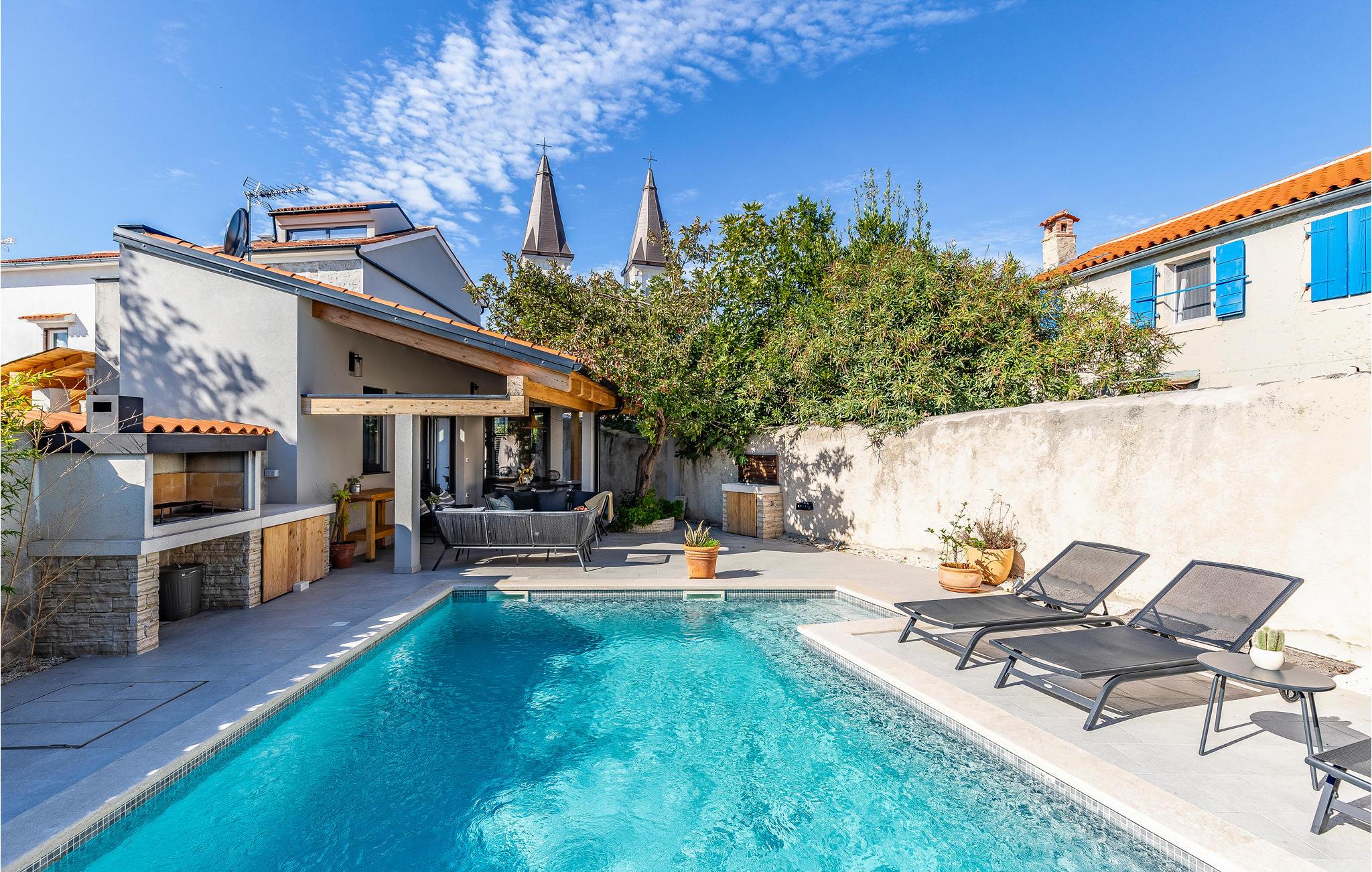 Dieses typisch istrische Steinhaus liegt im Zentrum des Ferienortes Medulin. Die renovierten Innenräume bestehen aus drei komfortablen Schlafzimmern mit eigenem TV, drei Badezimmern, einer gut ausgestatteten Küche und großem Wohnzimmer. Das gesamte Domizil ist klimatisiert und harmonisch mit Stil eingerichtet. Auf dem Grundstück befindet sich ein Pool mit Sonnenbereich sowie eine Terrasse für geselliges Zusammensein. Dieses Ferienhaus eignet sich für Familien und Paare. Hier können Sie bequem das Stadtzentrum, die Uferpromenade und das Meer zu Fuß erreichen. Die Gegend ist für Wander- und Radwege bekannt, außerdem können Sie hier Windsurfen, Kiten und Tauchen ausprobieren. Entlang der Küste gibt es zahlreiche Strandbars und Restaurants.