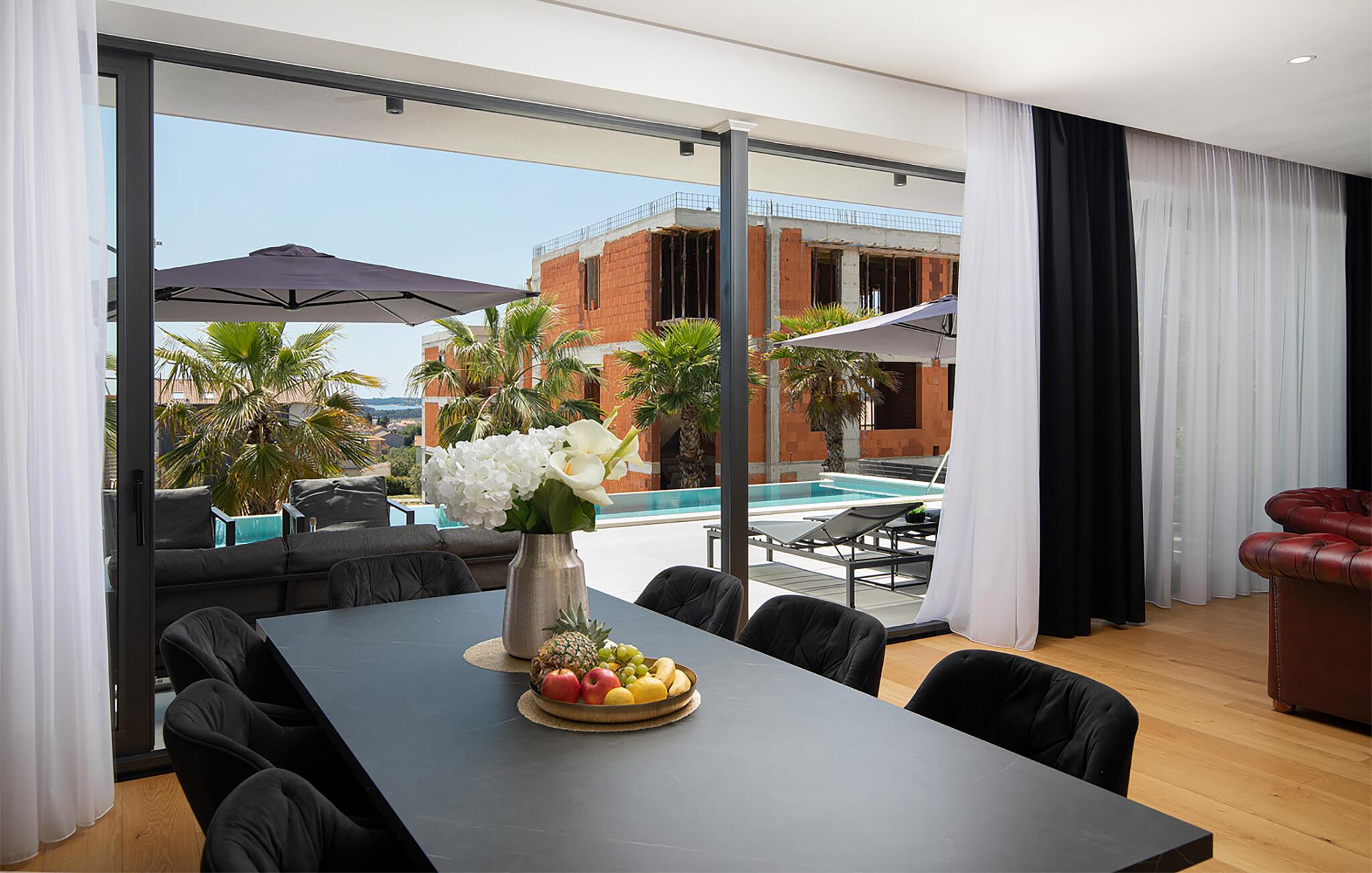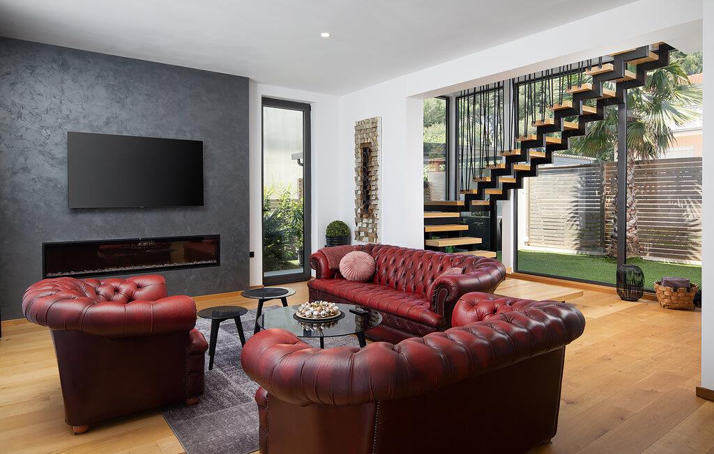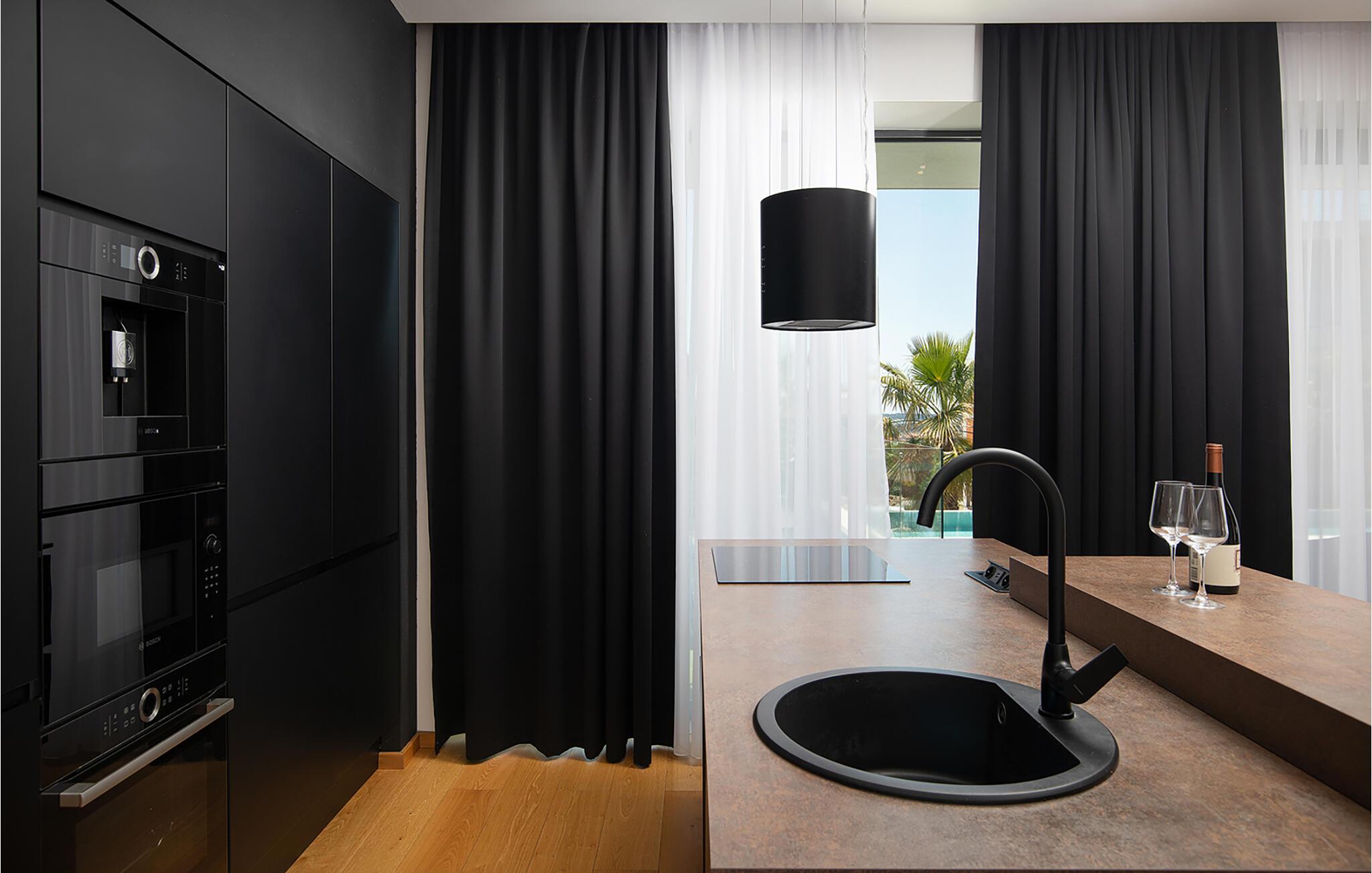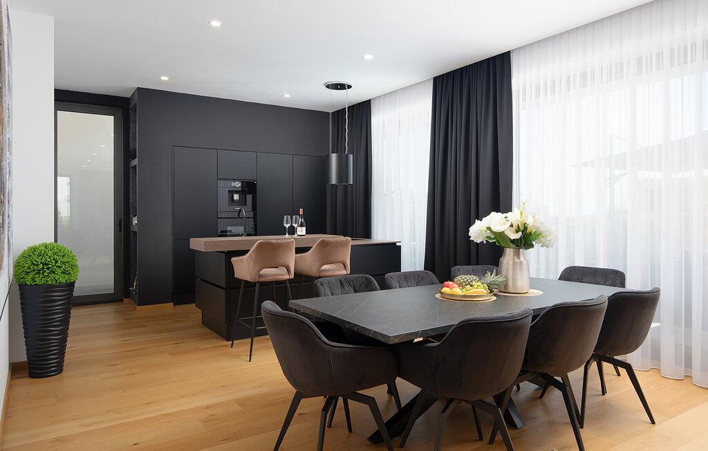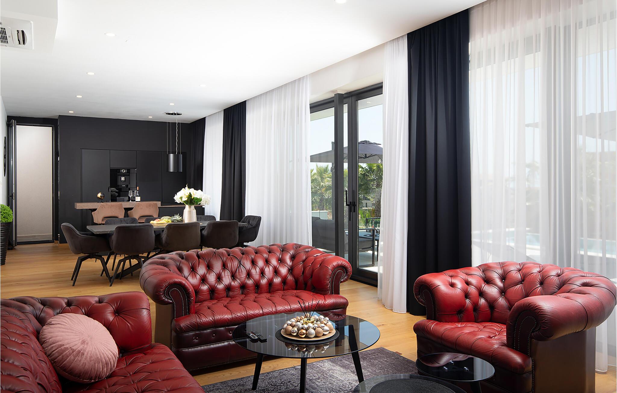 Erholen Sie sich in dieser stilvollen Villa, die modernes Design mit klassischer Eleganz verbindet. Machen Sie es sich auf den edlen Sofas bequem und hören Sie einen Podcast, schauen Sie einen Film oder lassen Sie bei einem Glas Wein einfach die Seele baumeln. Durch die bodentiefen Fenster haben Sie dabei stets den schönen Poolbereich im Blick. Genießen Sie gesellige Abende in der eleganten Designküche bei einem selbst zubereiteten Menü.