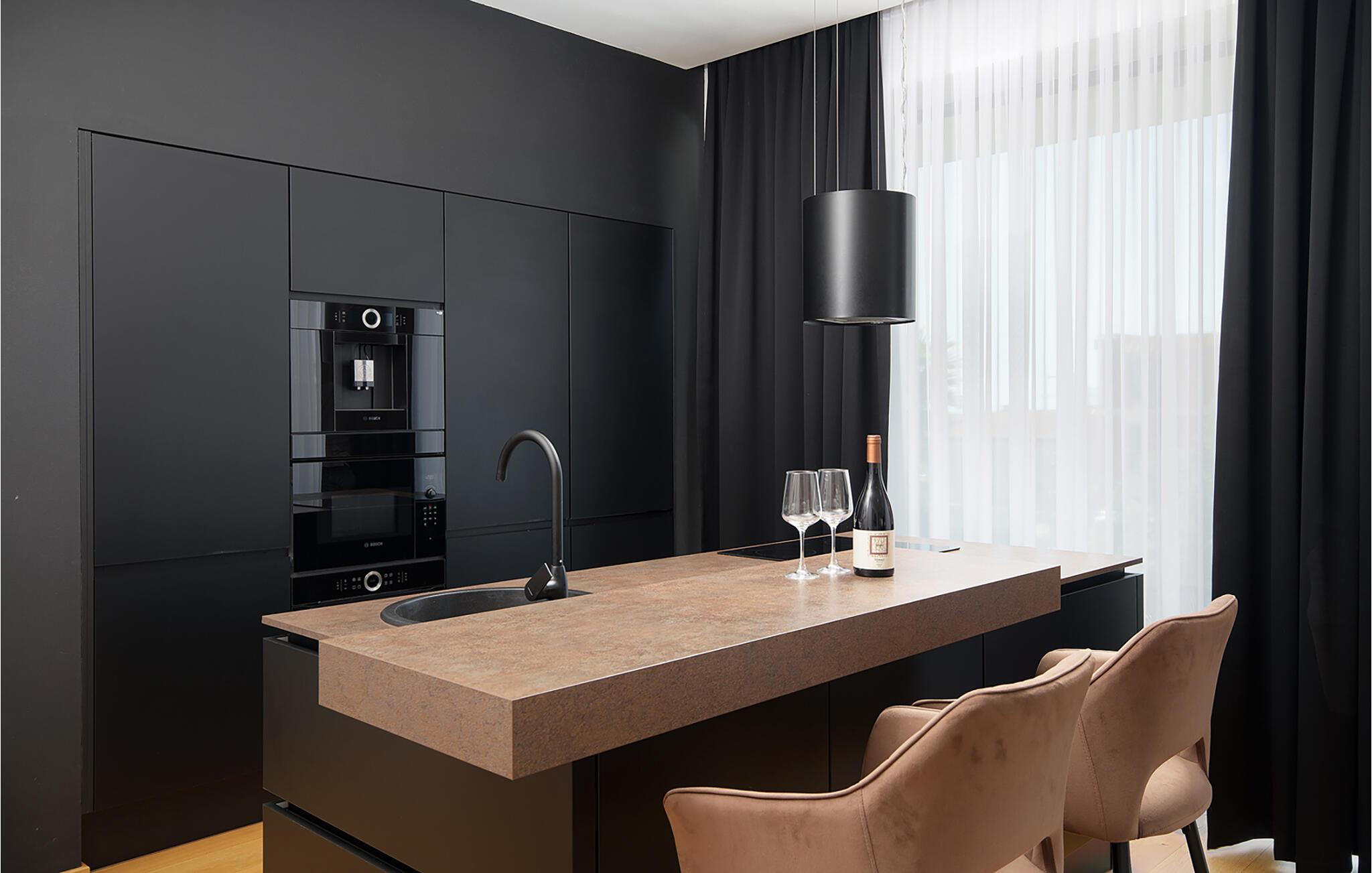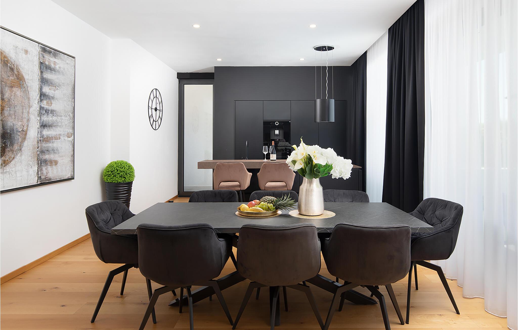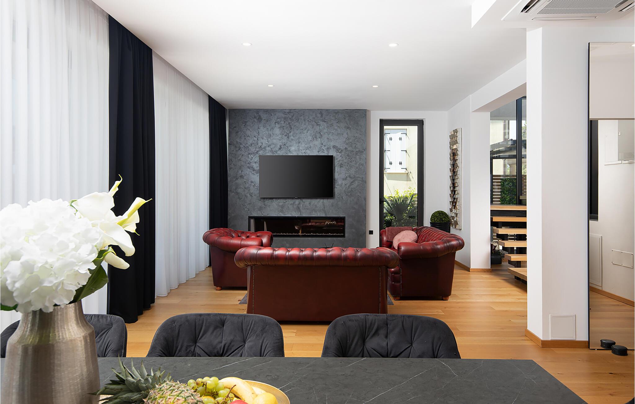 Erholen Sie sich in dieser stilvollen Villa, die modernes Design mit klassischer Eleganz verbindet. Machen Sie es sich auf den edlen Sofas bequem und hören Sie einen Podcast, schauen Sie einen Film oder lassen Sie bei einem Glas Wein einfach die Seele baumeln. Durch die bodentiefen Fenster haben Sie dabei stets den schönen Poolbereich im Blick. Genießen Sie gesellige Abende in der eleganten Designküche bei einem selbst zubereiteten Menü.