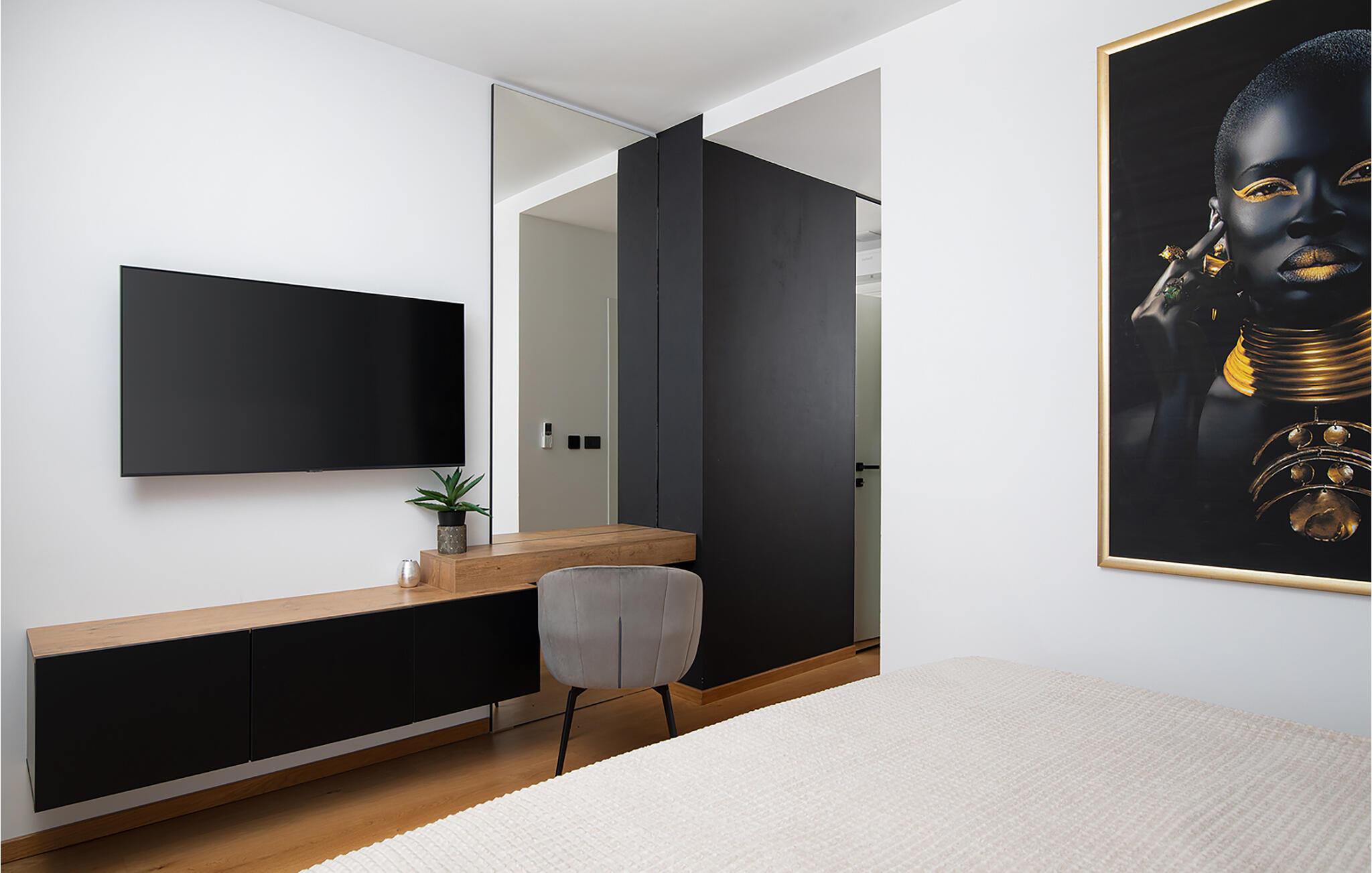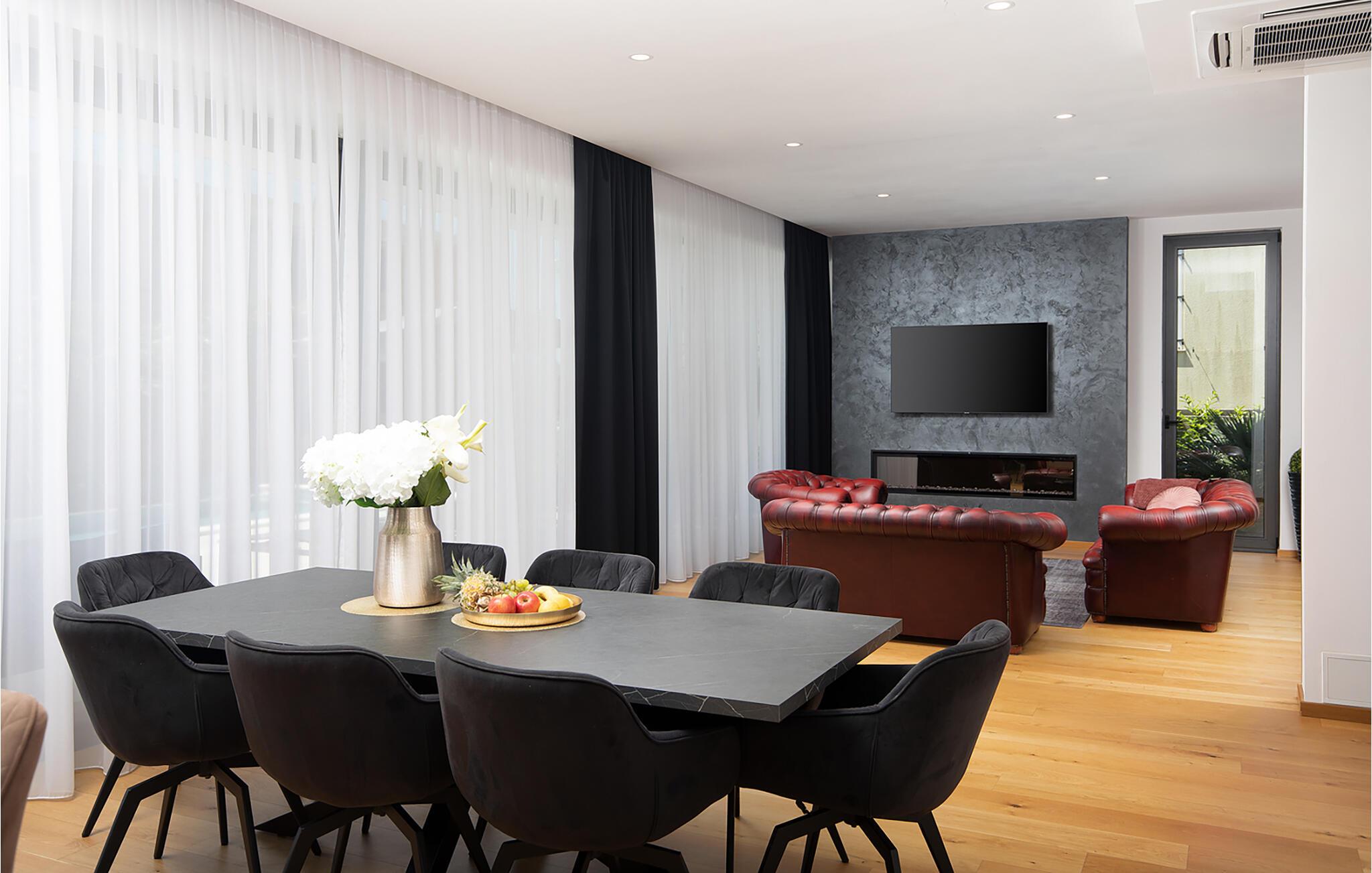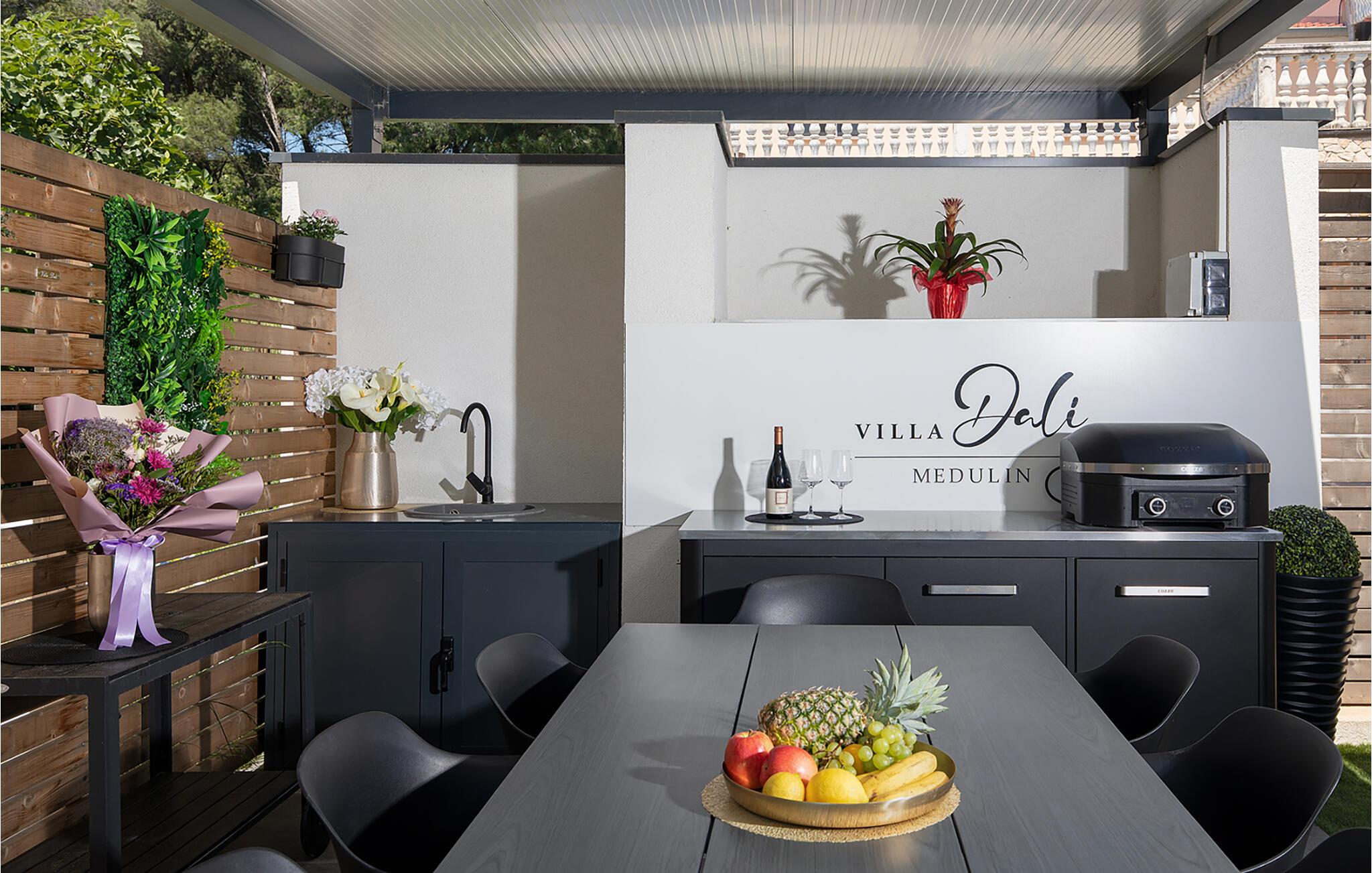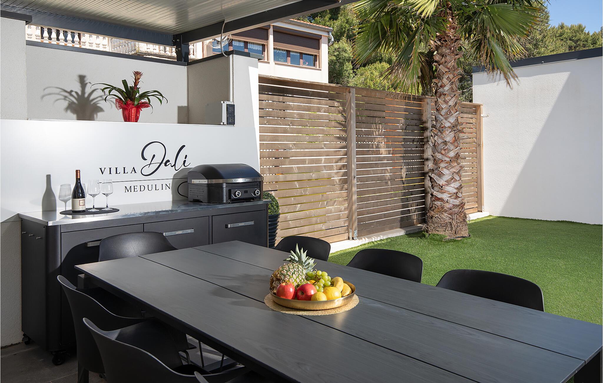Erholen Sie sich in dieser stilvollen Villa, die modernes Design mit klassischer Eleganz verbindet. Machen Sie es sich auf den edlen Sofas bequem und hören Sie einen Podcast, schauen Sie einen Film oder lassen Sie bei einem Glas Wein einfach die Seele baumeln. Durch die bodentiefen Fenster haben Sie dabei stets den schönen Poolbereich im Blick. Genießen Sie gesellige Abende in der eleganten Designküche bei einem selbst zubereiteten Menü.