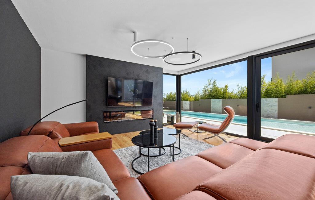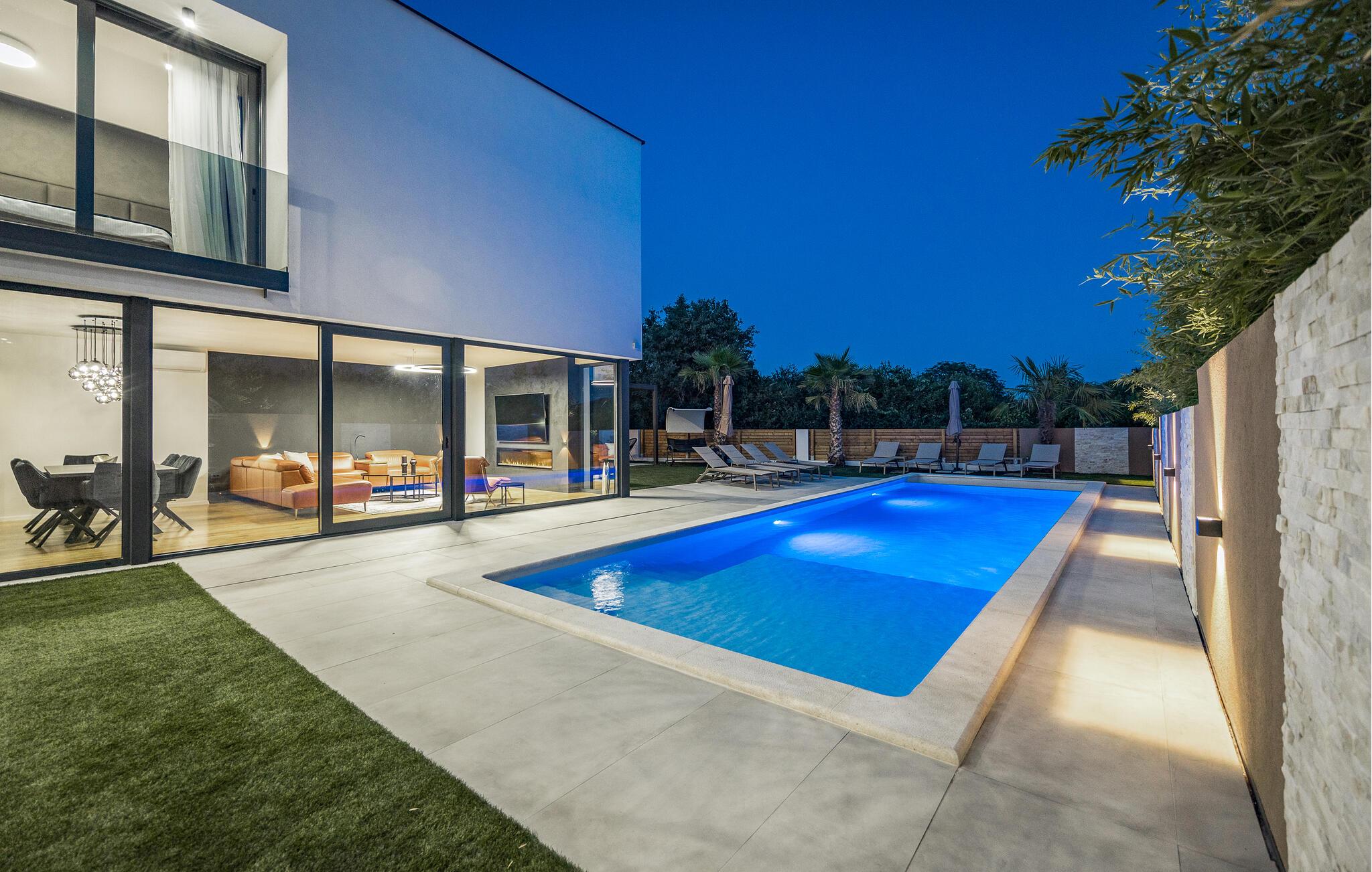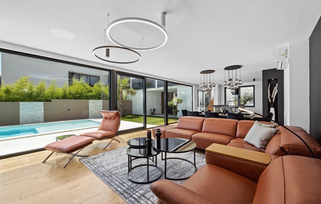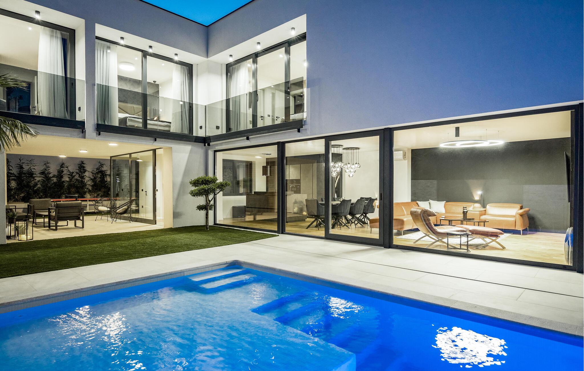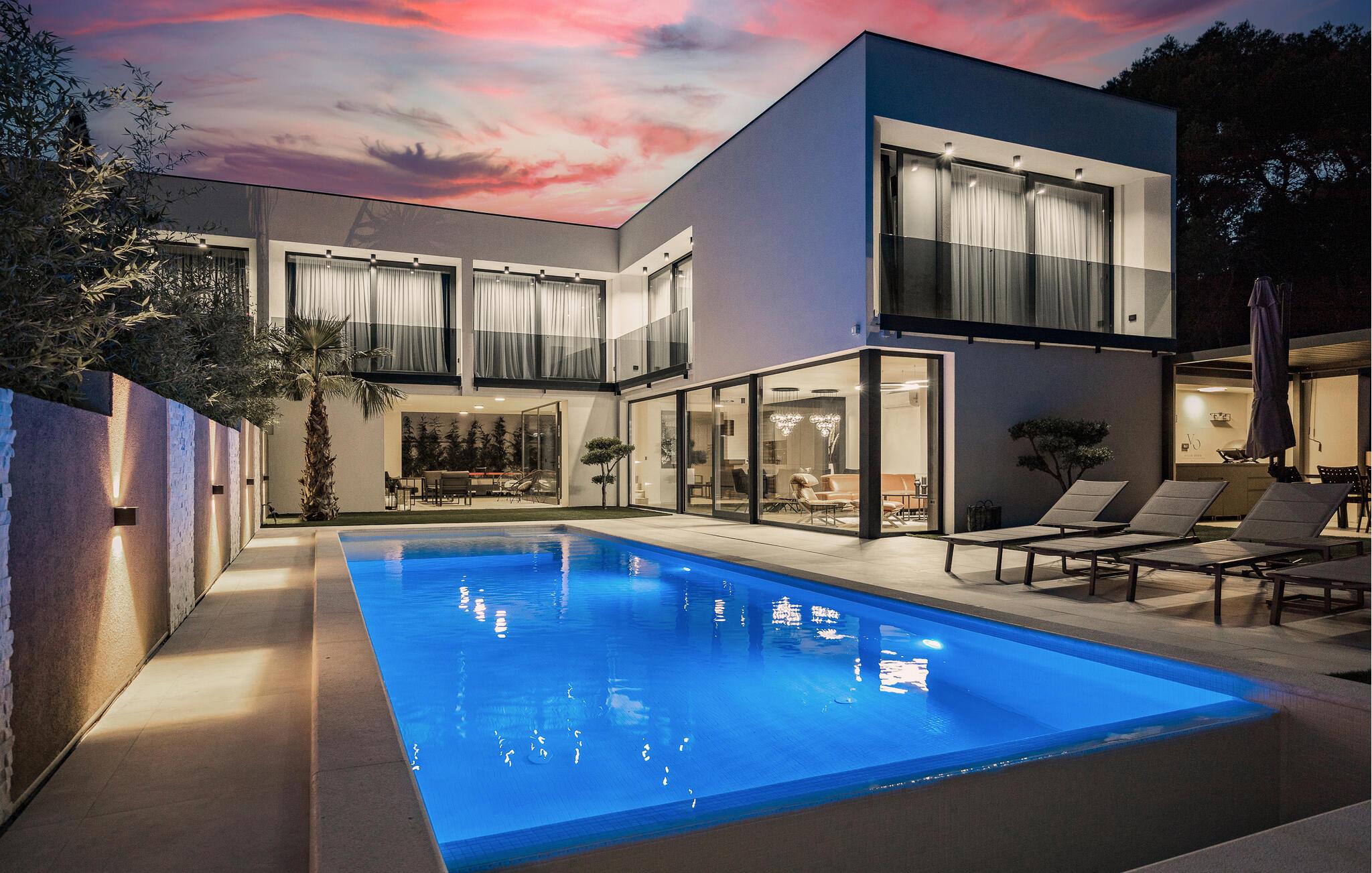 Dieses moderne Designerhaus wird Sie mit seiner außergewöhnlichen Architektur, eleganten Einrichtung und zahlreichen Annehmlichkeiten begeistern. Zelebrieren Sie das Zubereiten köstlicher Mahlzeiten in der hochwertigen Küche bei einem Glas Wein, entfachen Sie den Kamin und nehmen Sie im stilvollen Essbereich Platz. Verbringen Sie erholsame Momente in der Sauna und freuen Sie sich auf entspannte Filmabende im großen Wohnzimmer, wo großzügige Fensterfronten den Blick auf den stimmungsvoll beleuchteten Pool freigeben.