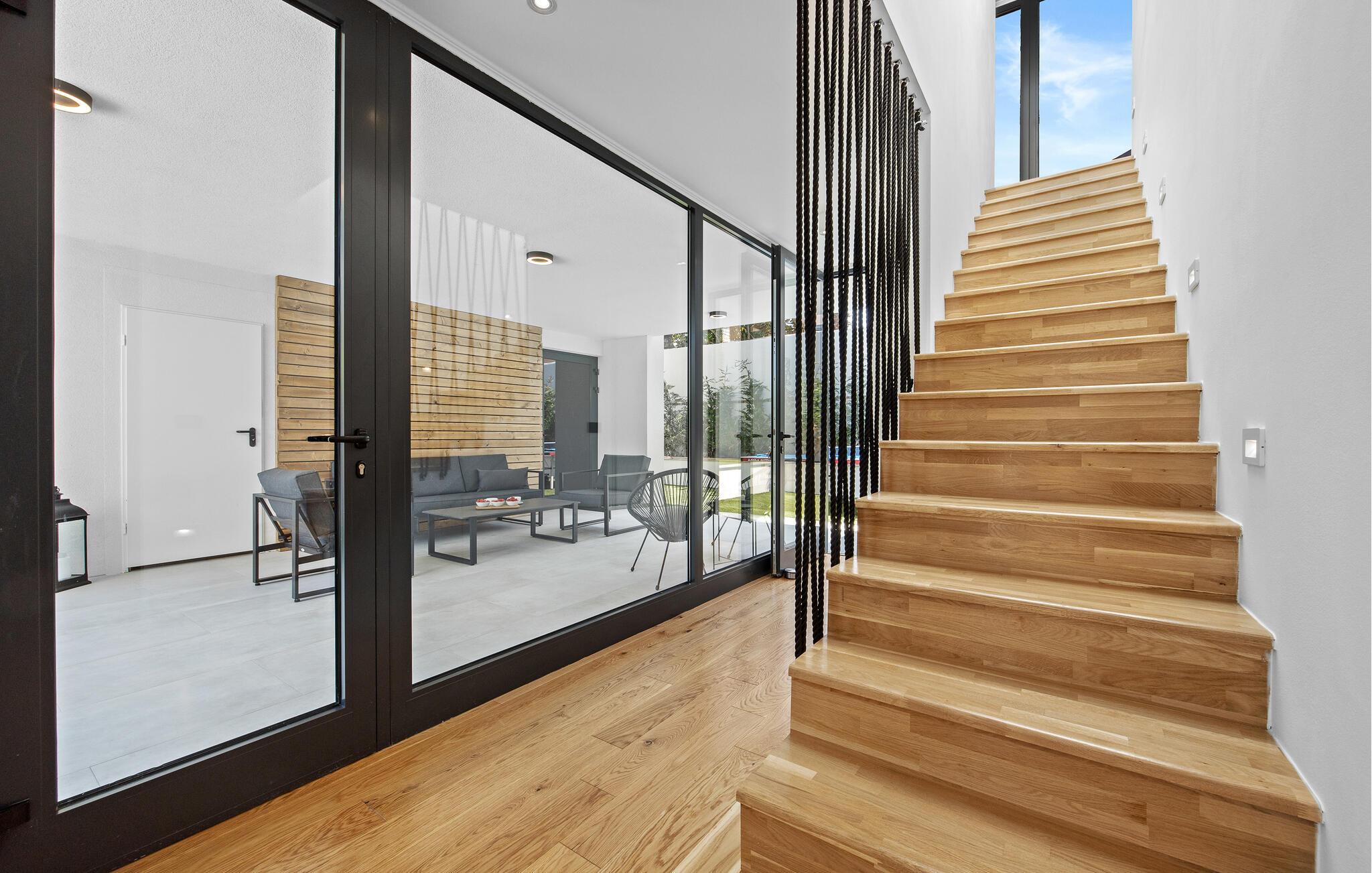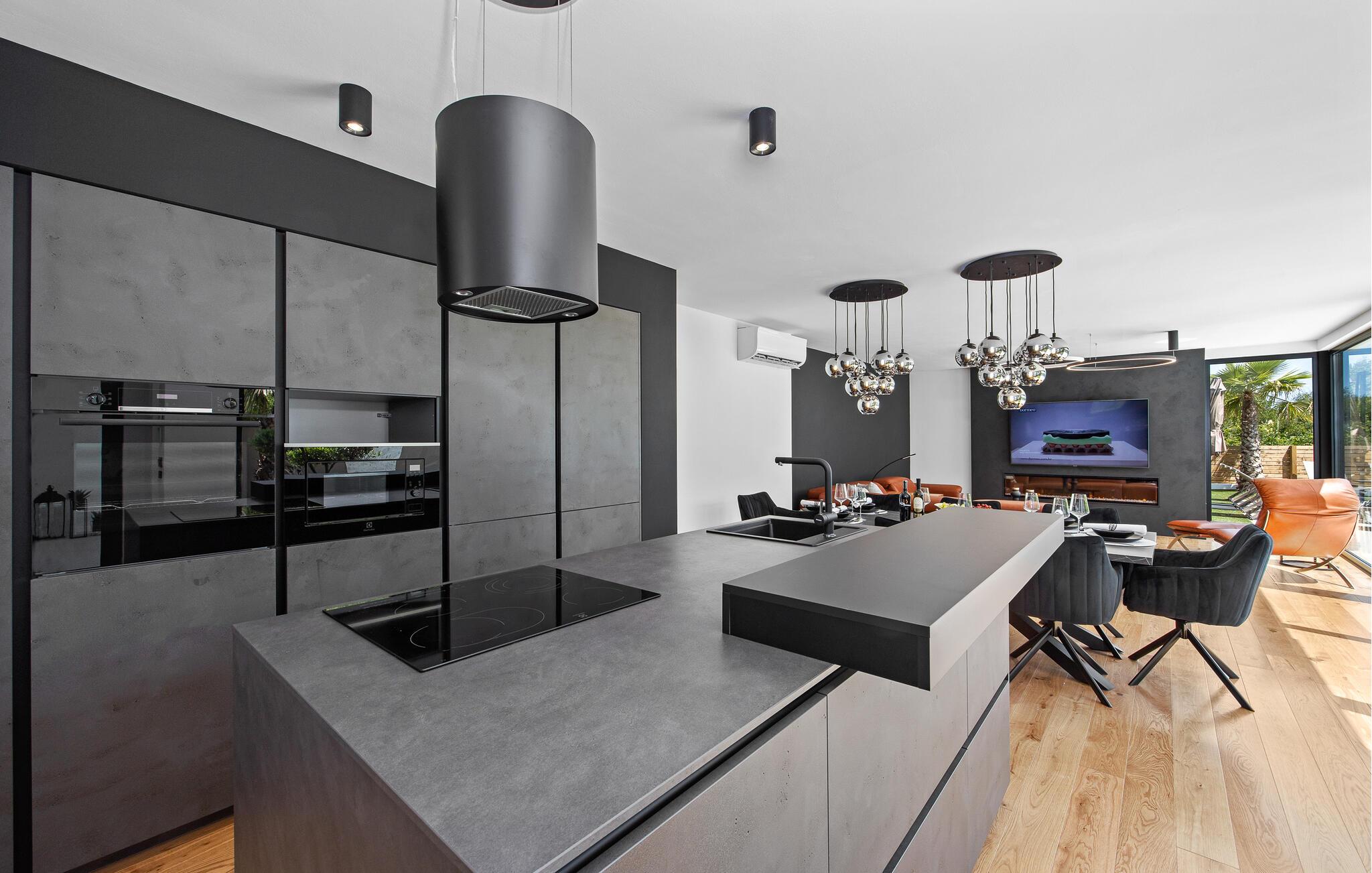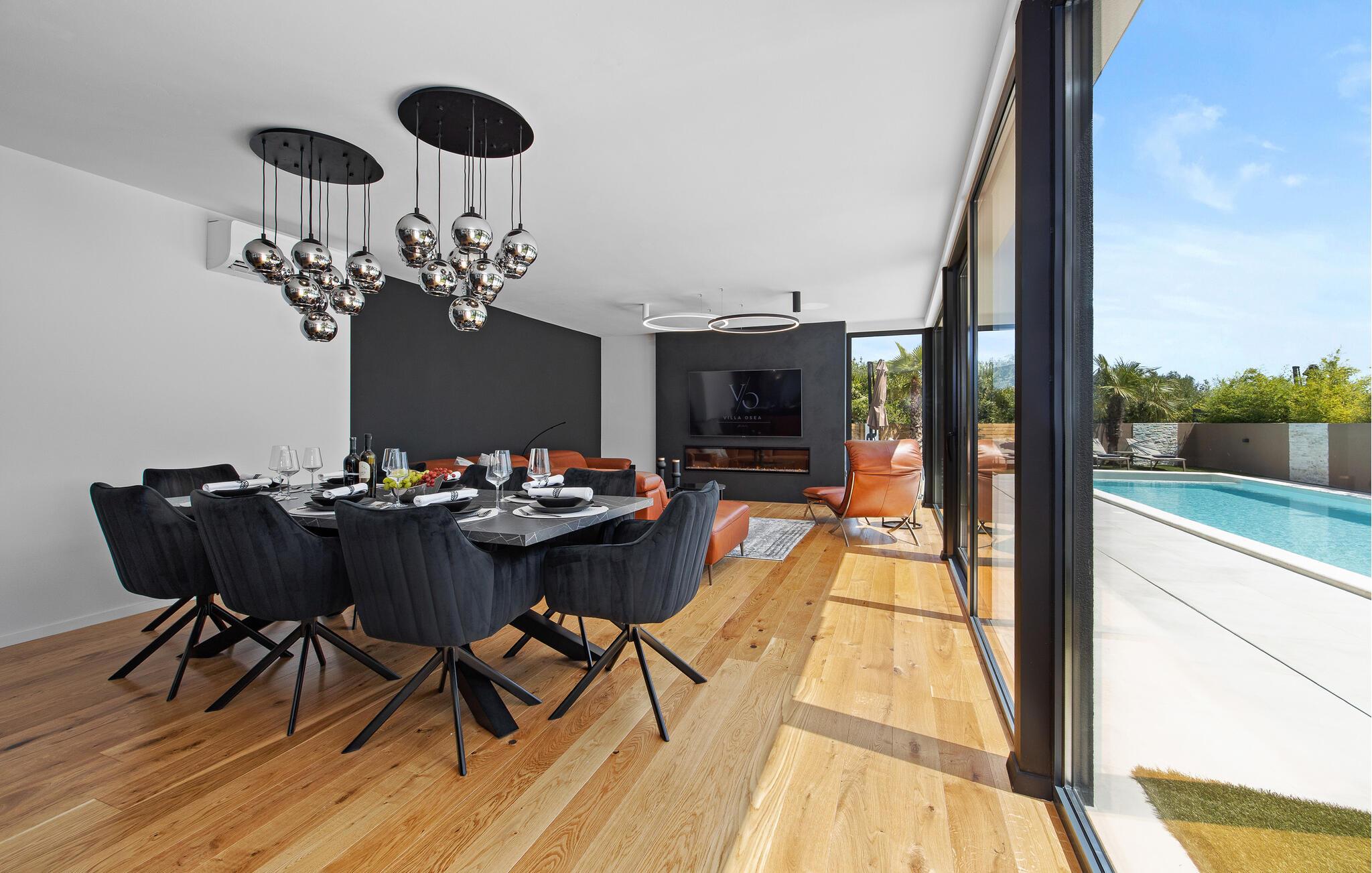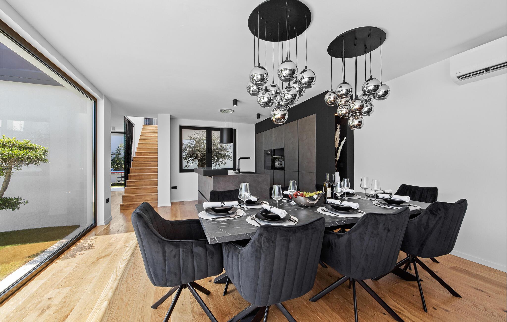 Dieses moderne Designerhaus wird Sie mit seiner außergewöhnlichen Architektur, eleganten Einrichtung und zahlreichen Annehmlichkeiten begeistern. Zelebrieren Sie das Zubereiten köstlicher Mahlzeiten in der hochwertigen Küche bei einem Glas Wein, entfachen Sie den Kamin und nehmen Sie im stilvollen Essbereich Platz. Verbringen Sie erholsame Momente in der Sauna und freuen Sie sich auf entspannte Filmabende im großen Wohnzimmer, wo großzügige Fensterfronten den Blick auf den stimmungsvoll beleuchteten Pool freigeben.